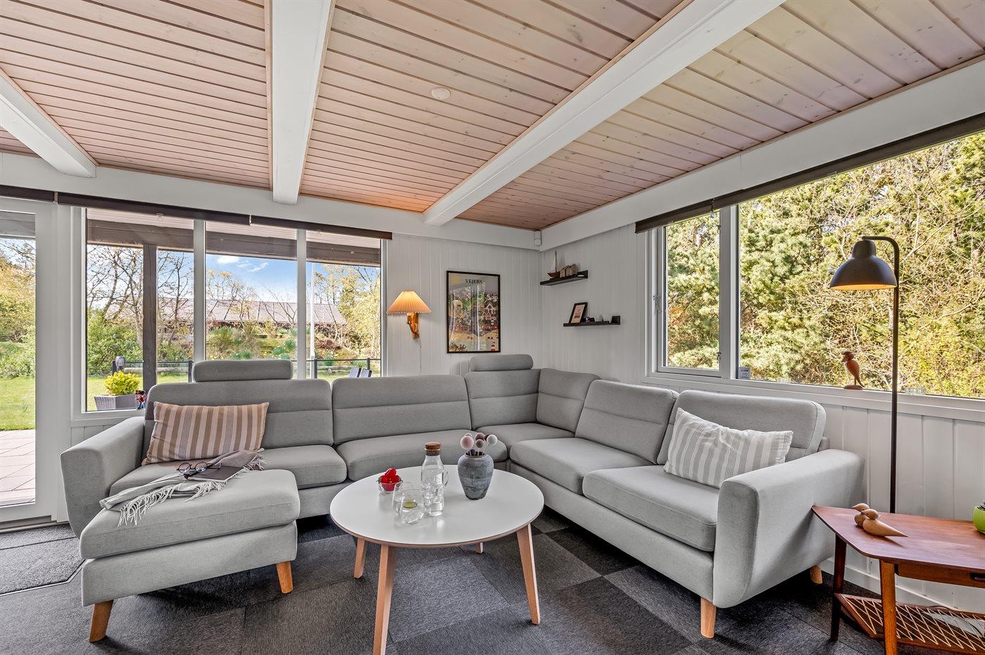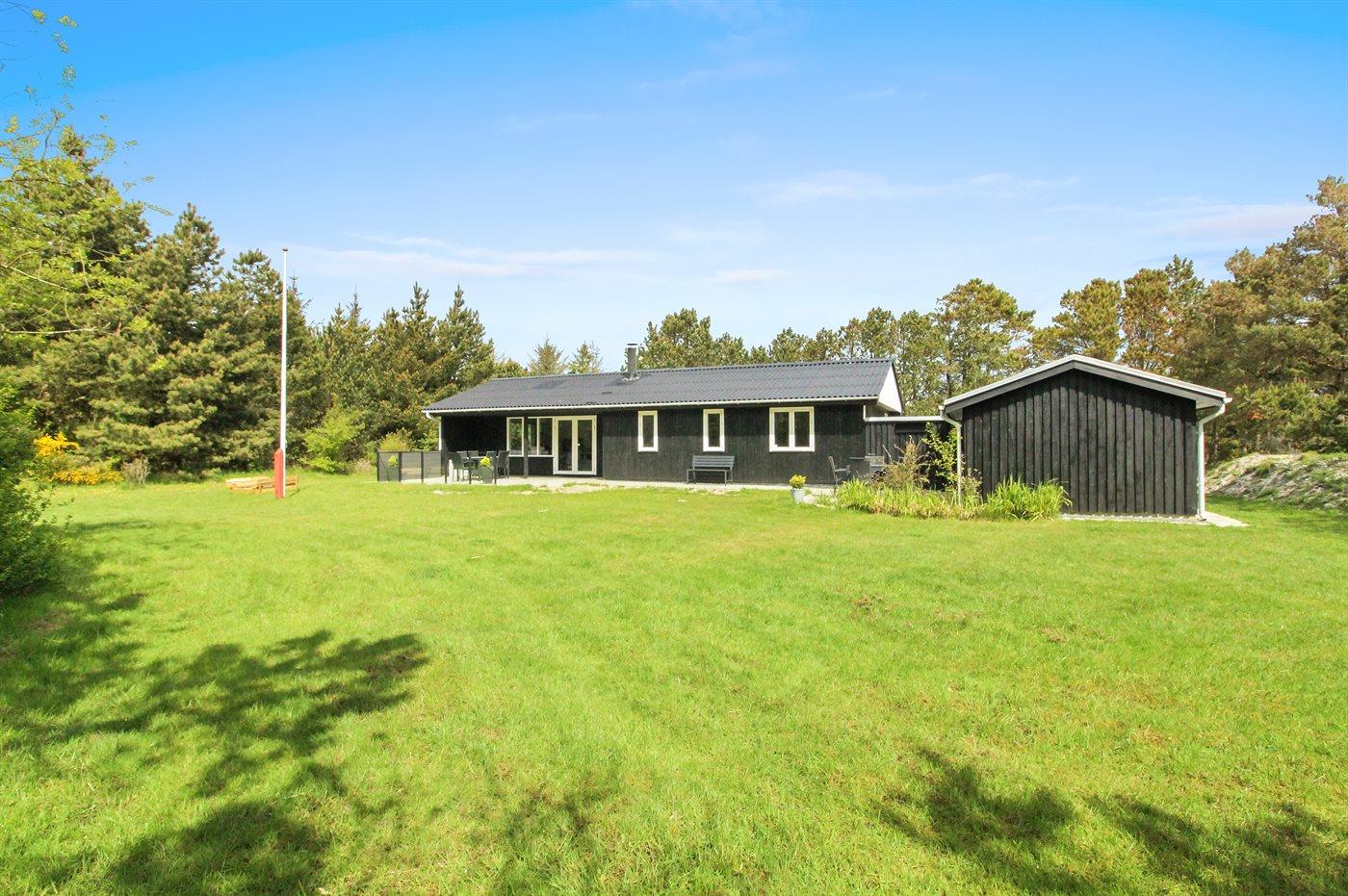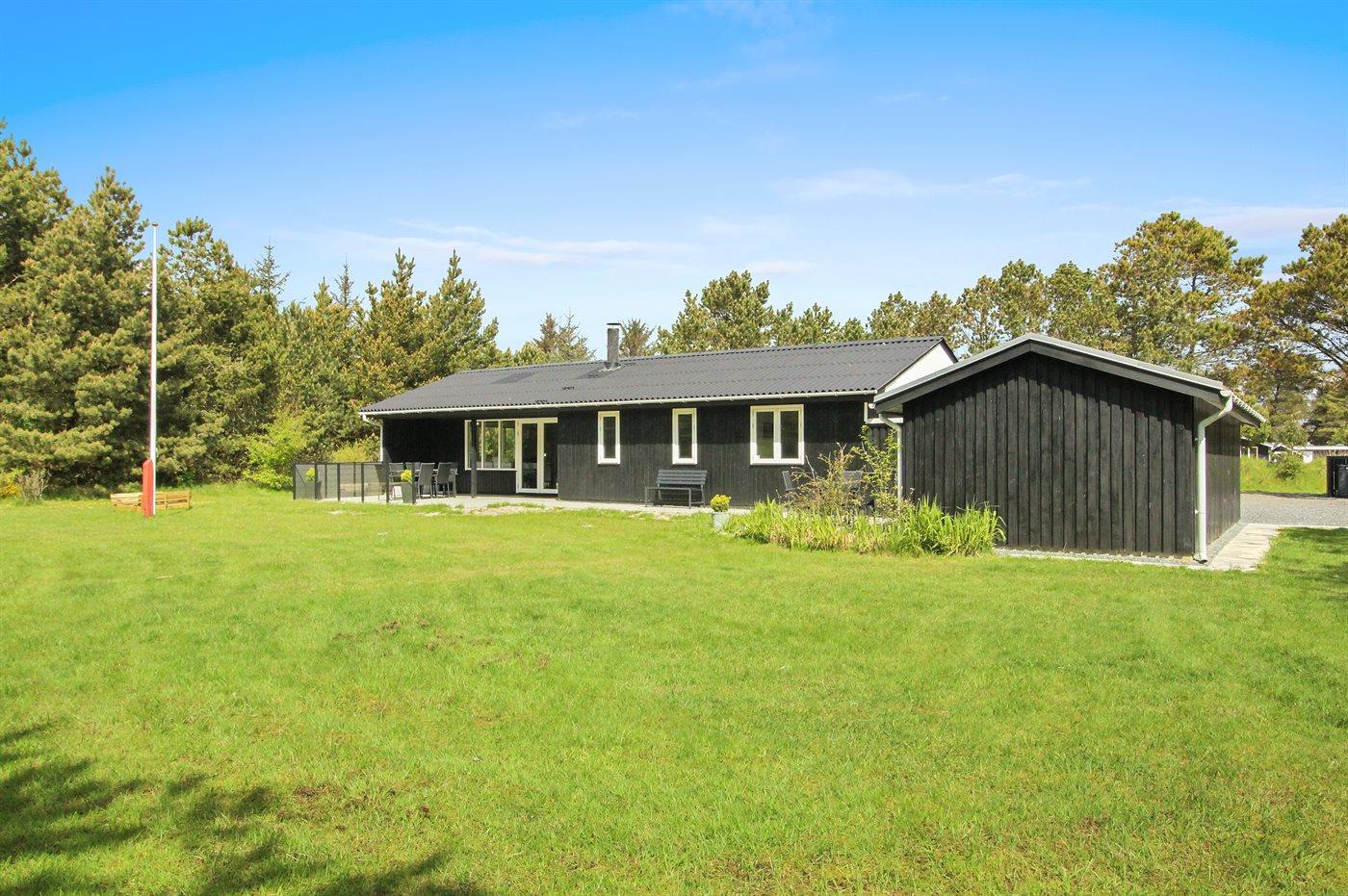 Hyggeligt sommerhus med sauna, stor naturgrund og elbiloplader ved Vejers Strand.