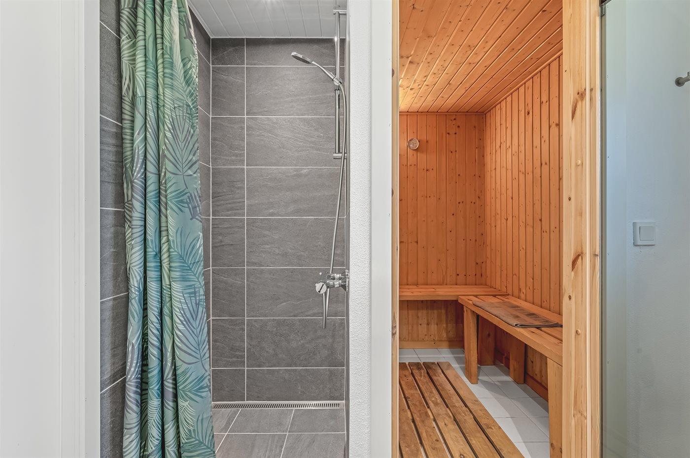Der er 1 badeværelse med bruseniche og 1 toilet.. Der er gulvvarme på 1 badeværelse. I saunaen er der mulighed for afslapning.
