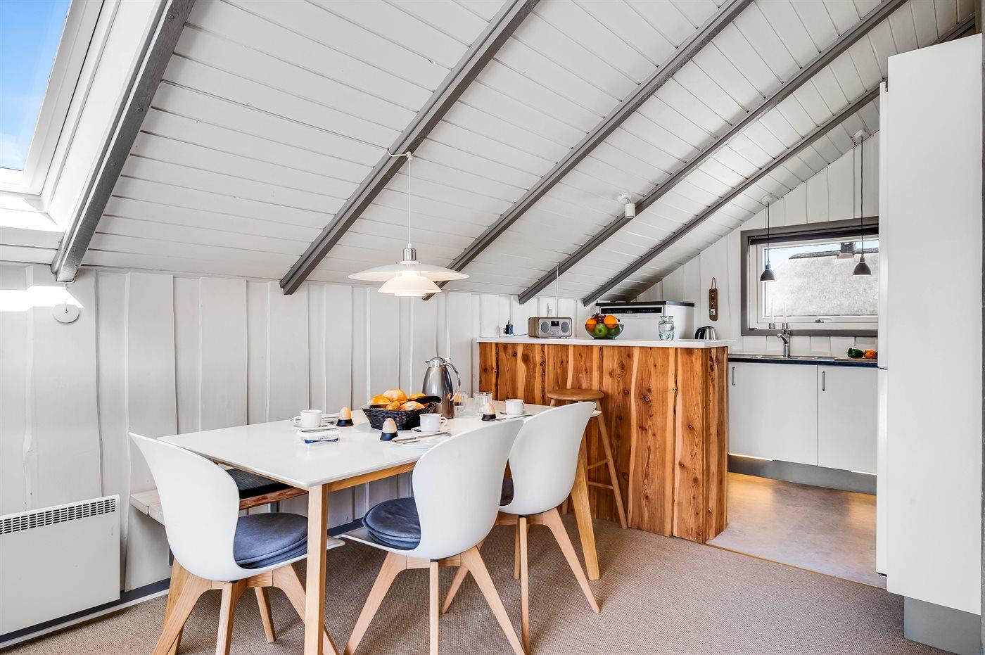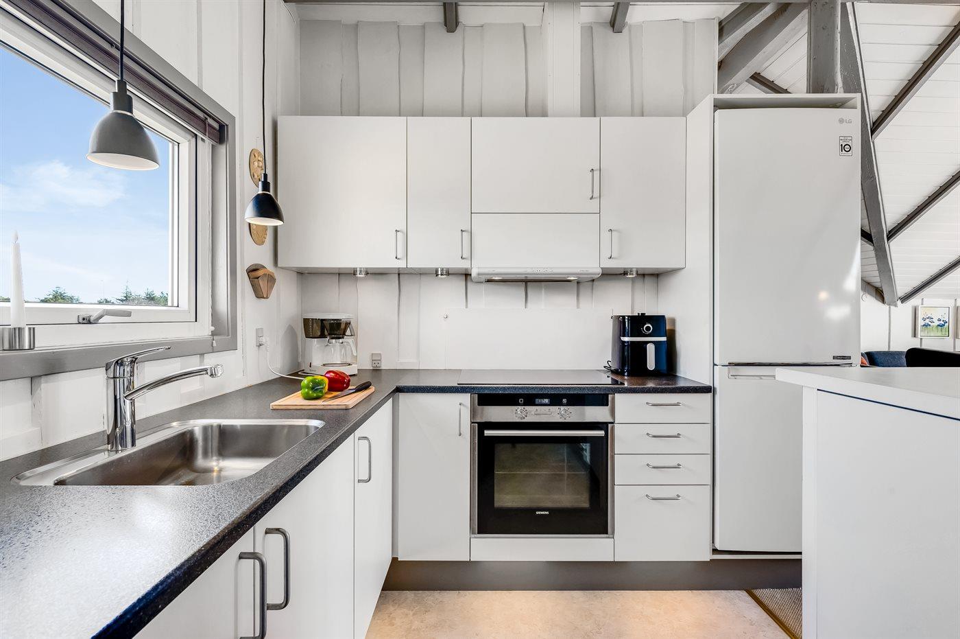 Køkkenet er udstyret med 1 køleskab. Der er 4 induktionskogeplader, varmluftovn, mikrobølgeovn samt opvaskemaskine.