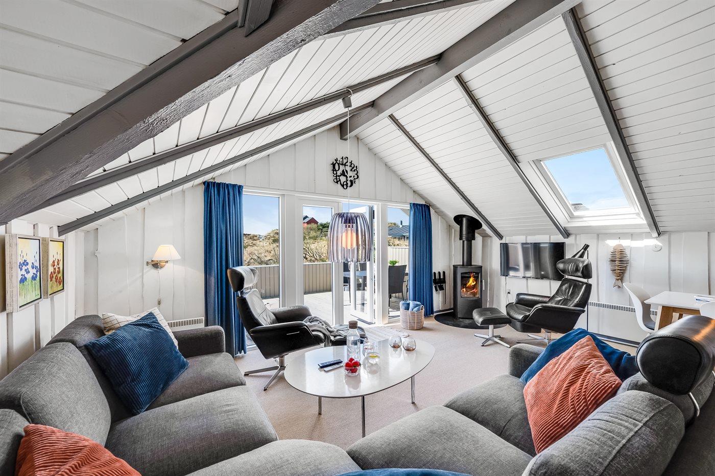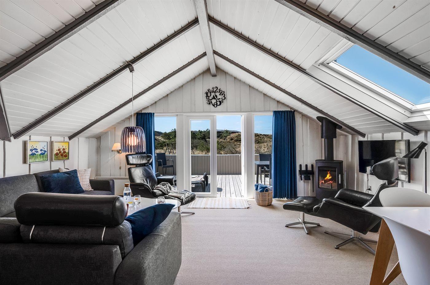 Hyggeligt og renoveret feriehus i klitterne nær Vejers Strand med pejs og moderne faciliteter.