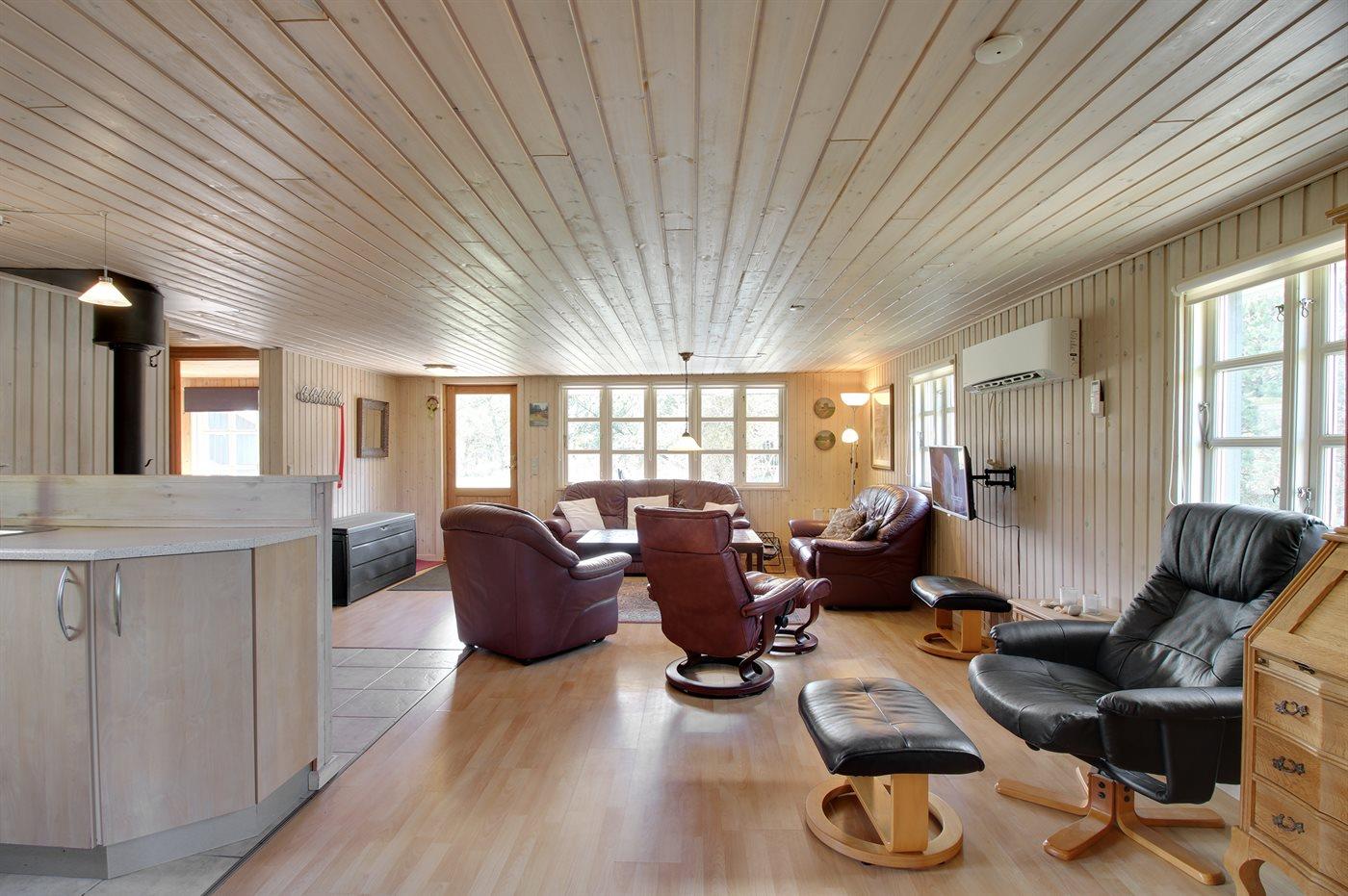 Sommerhus med god indretning, som ligger på ugeneret spændende naturgrund omgivet af træer på en stille vej. Stue med lyst bøge-laminatgulv og brændeovn.