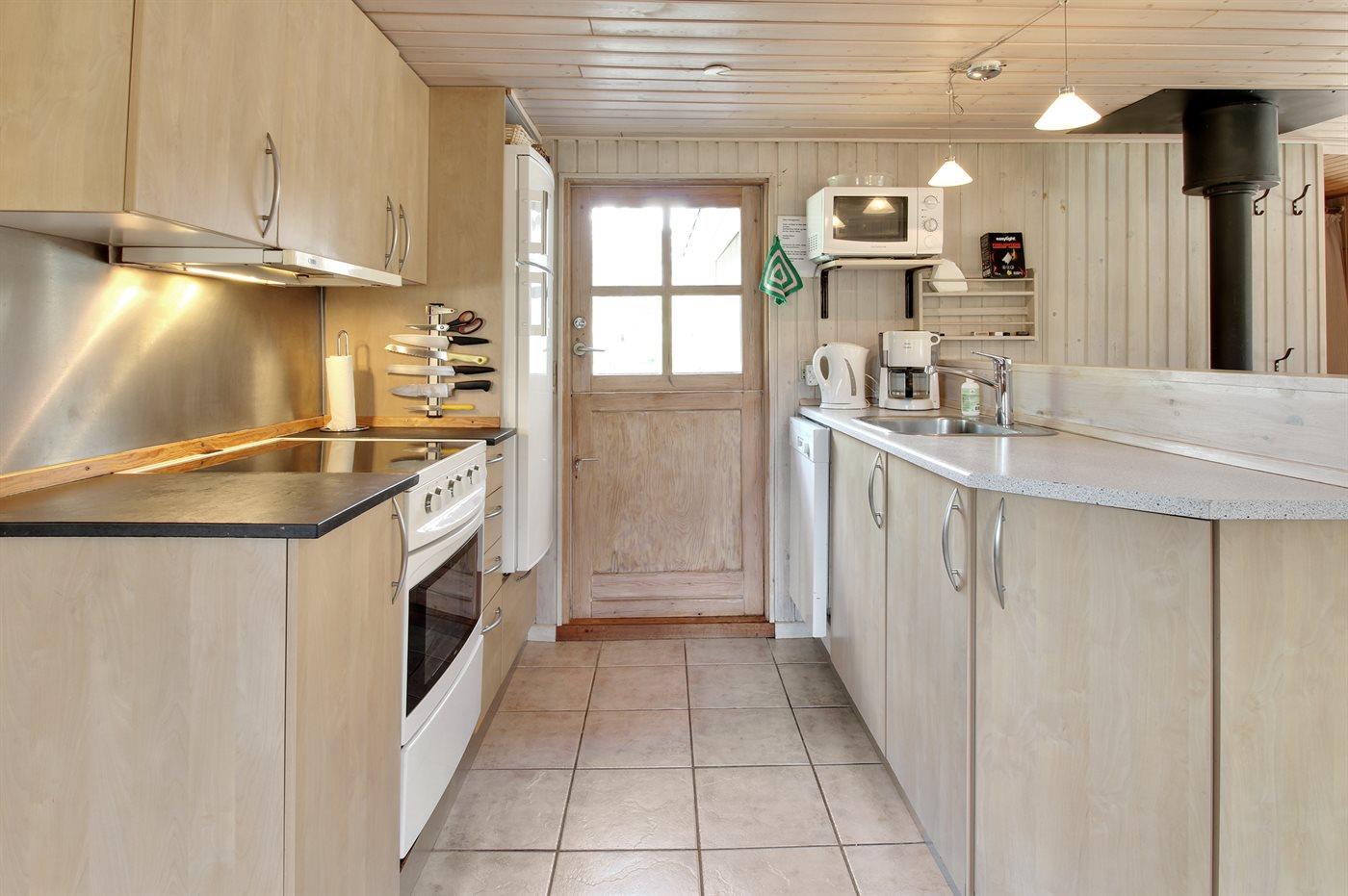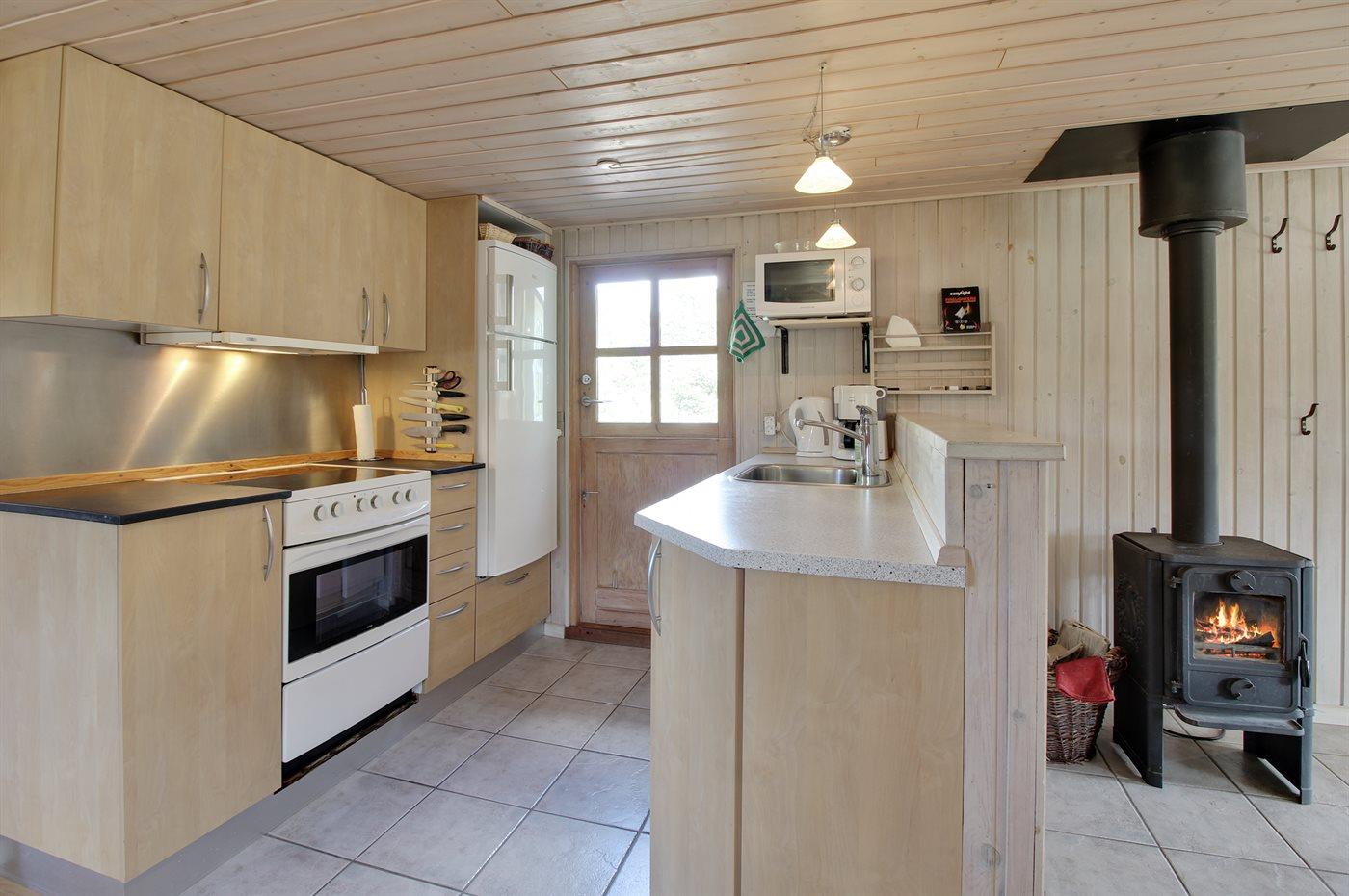Køkkenet er udstyret med 1 køleskab. Der er 4 keramiske kogeplader, bageovn, mikrobølgeovn samt opvaskemaskine.