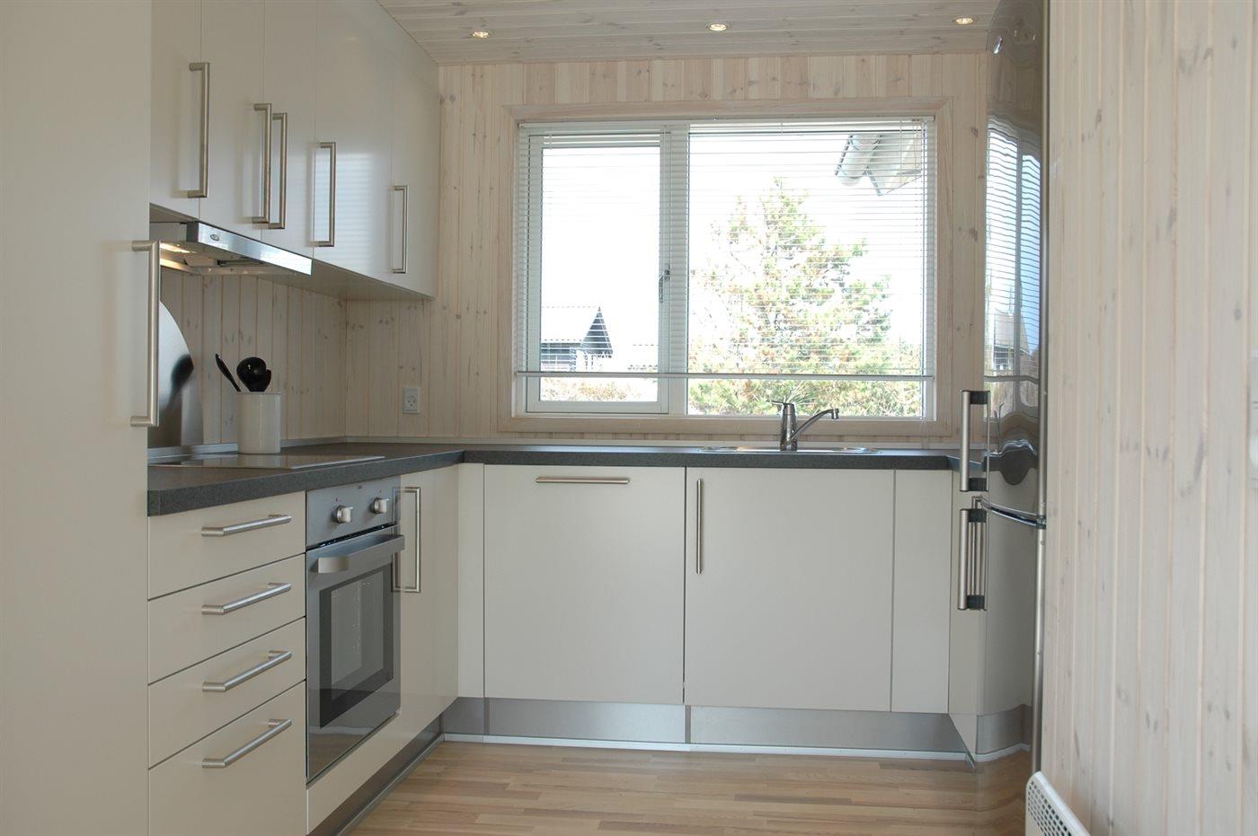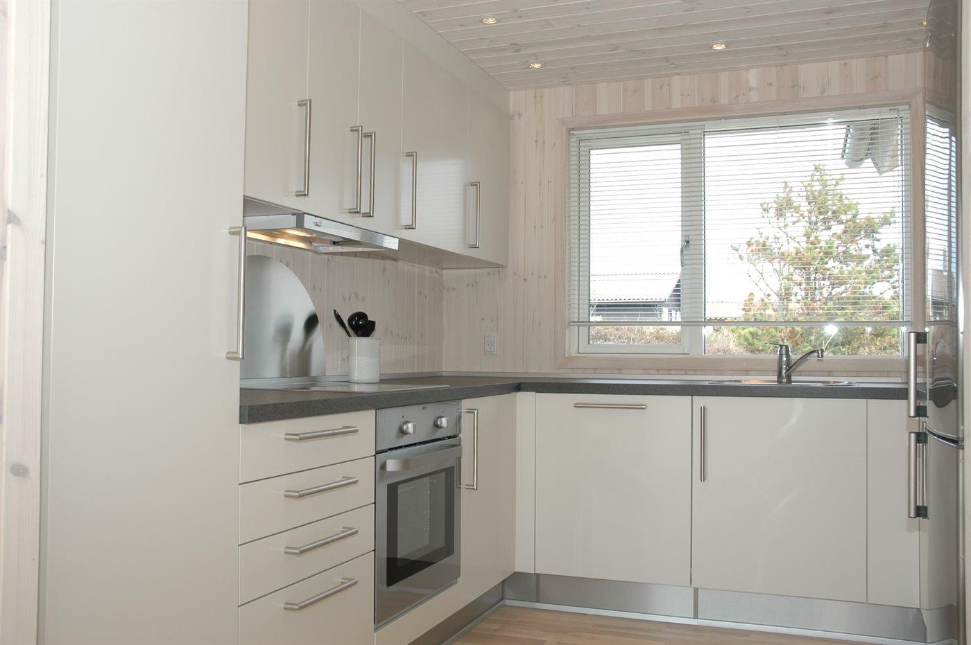 Køkkenet er udstyret med 1 køleskab. Der er 4 keramiske kogeplader, bageovn, mikrobølgeovn samt opvaskemaskine Der er gulvvarme i køkkenet.