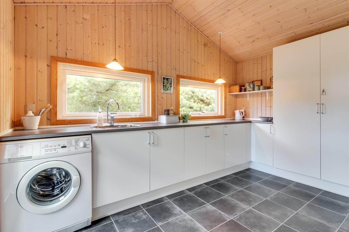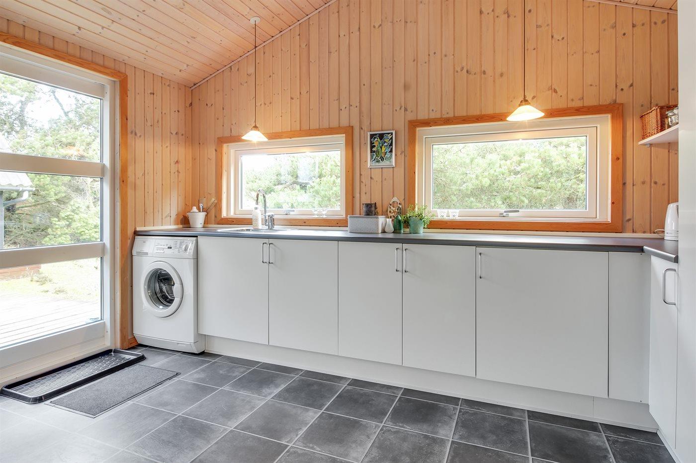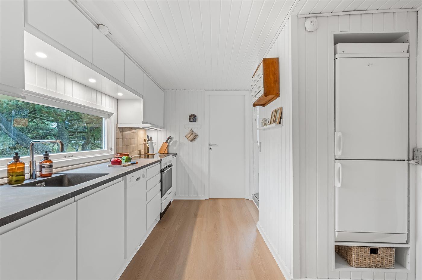 Køkkenet er udstyret med 1 køleskab. Der er 4 elkogeplader, bageovn samt opvaskemaskine.