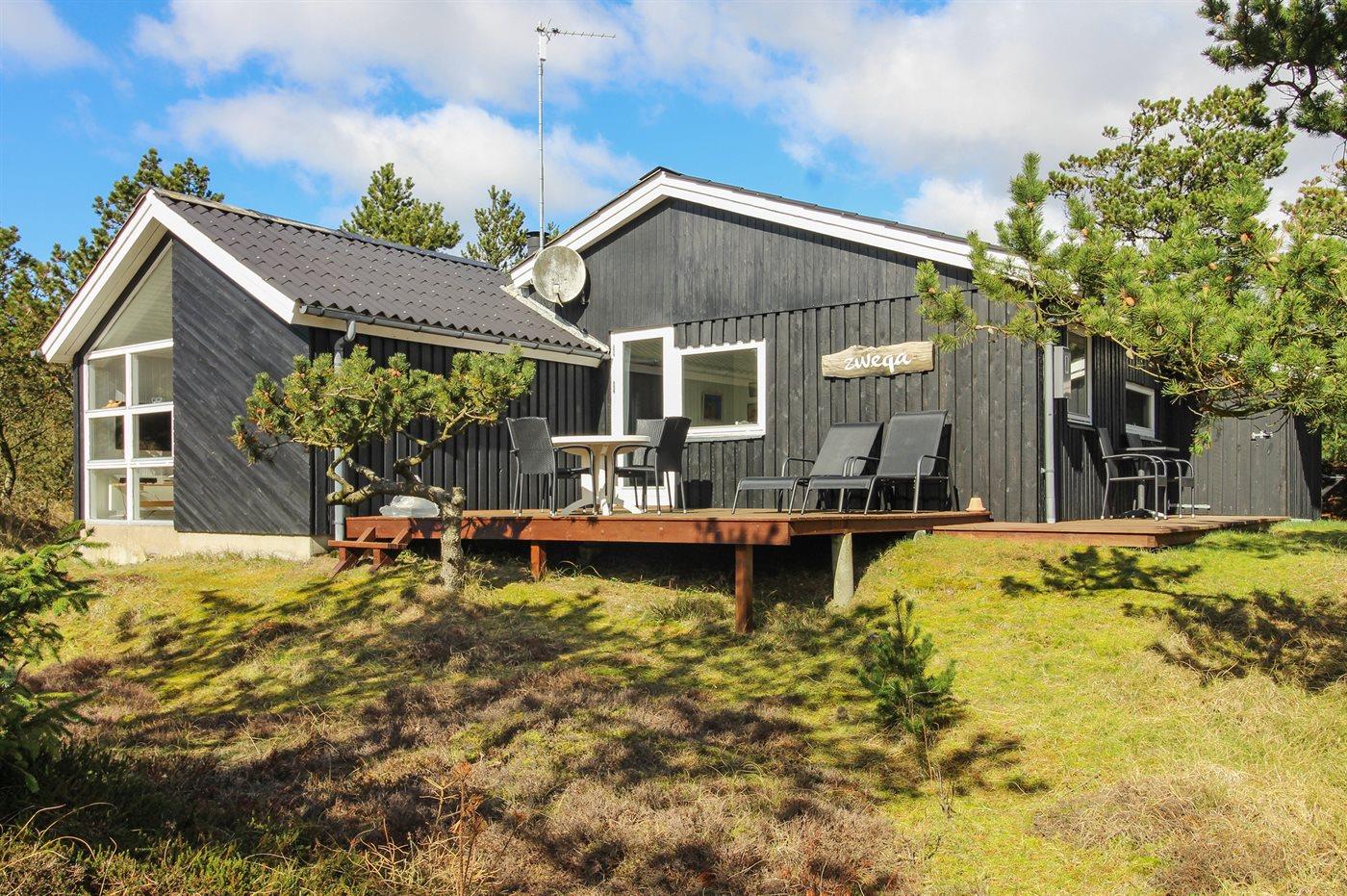 Dette dejlige sommerhus ligger på en skøn og let kuperet naturgrund ikke langt fra den brede sandstrand og badebyen Vejers Strand.
