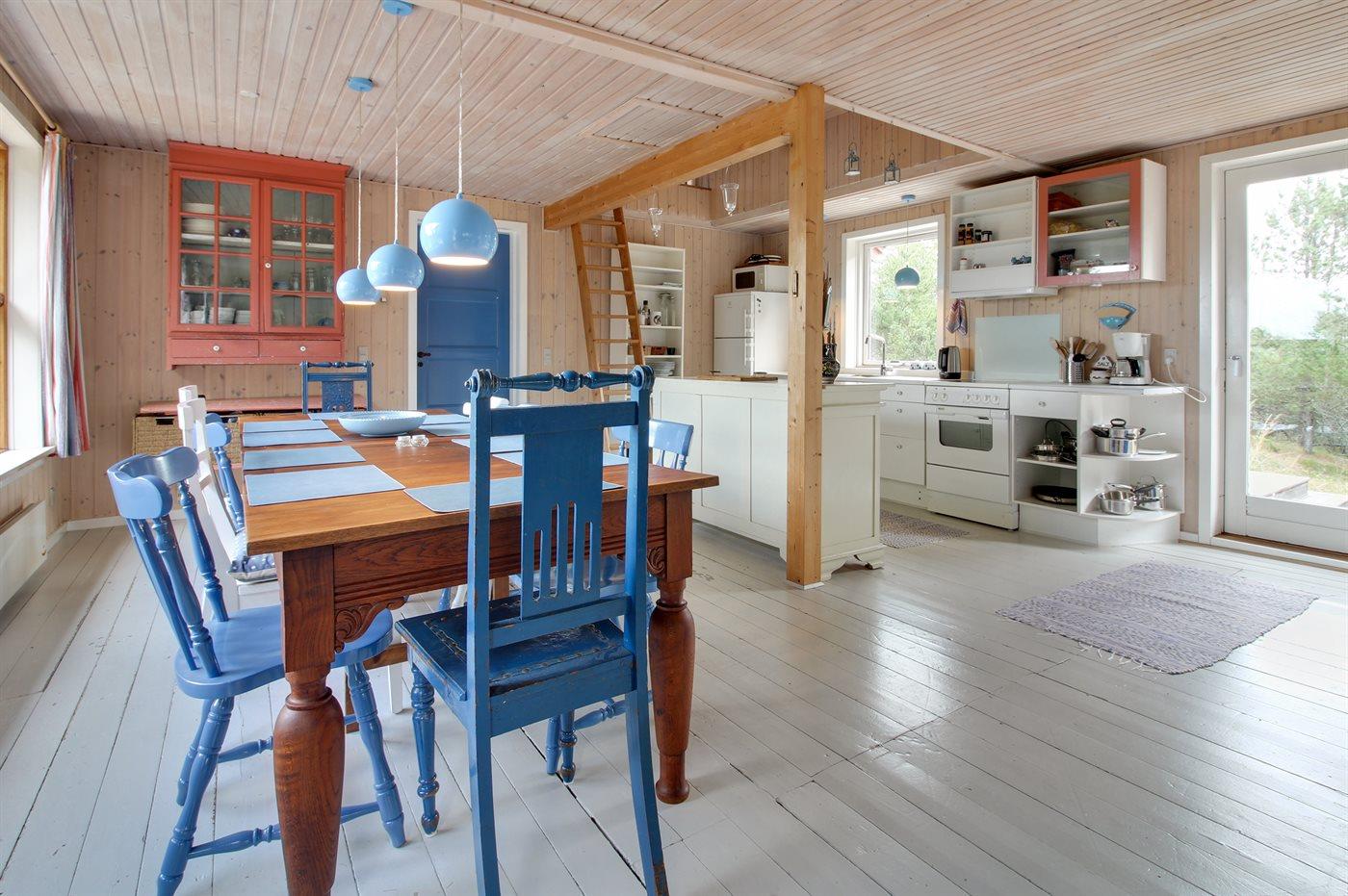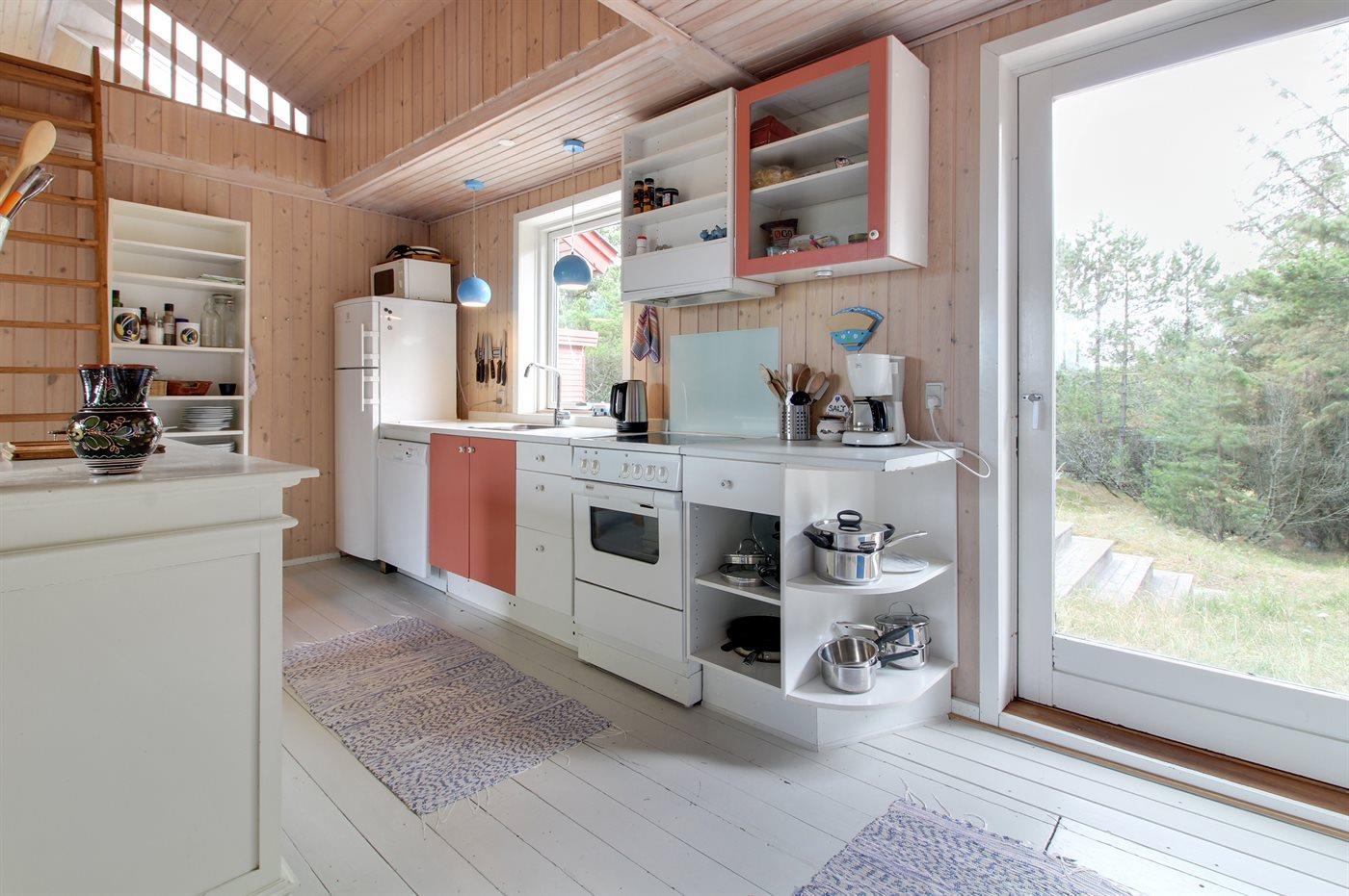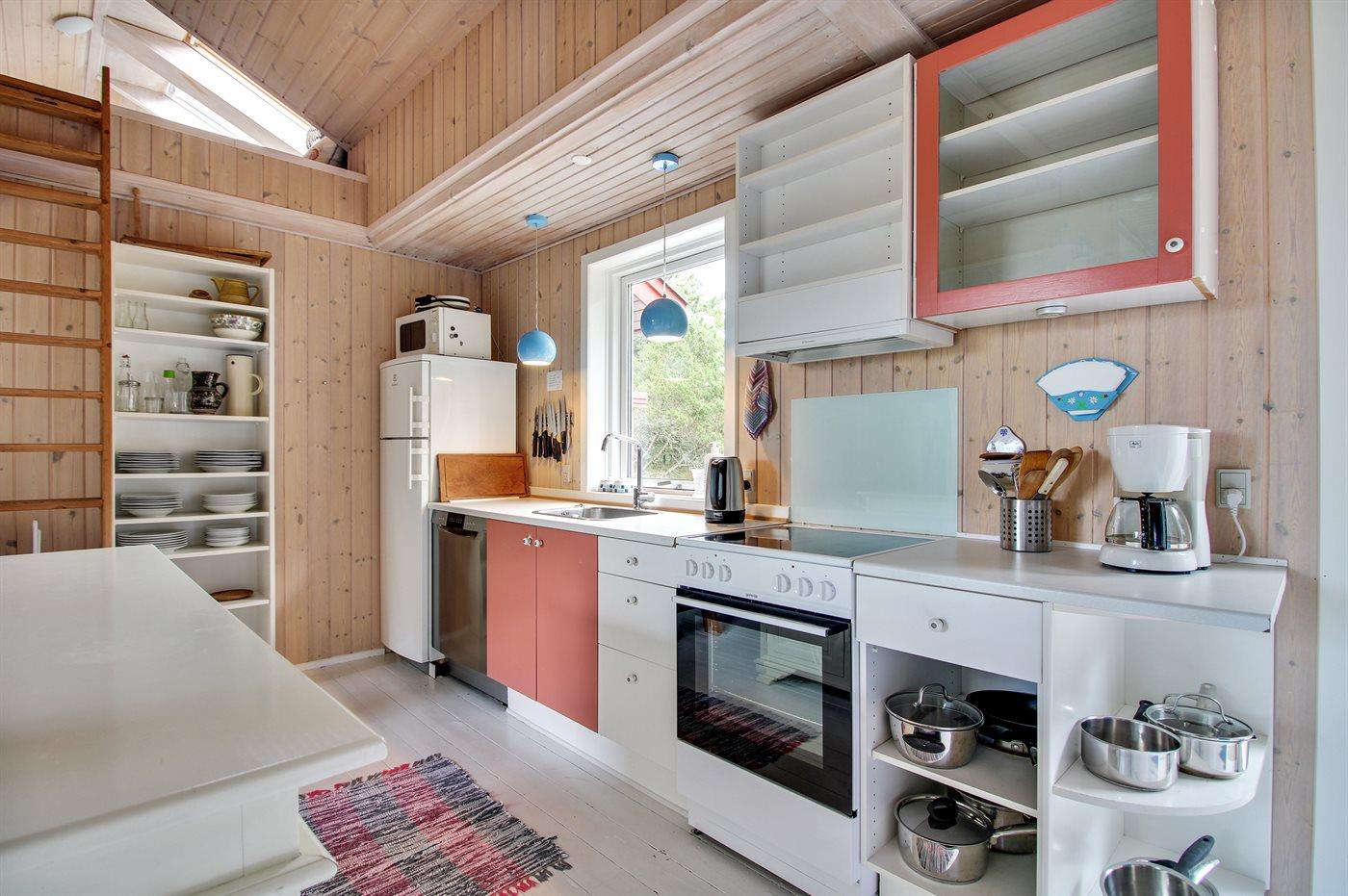 Køkkenet er udstyret med 1 køleskab. Der er 4 elkogeplader, bageovn, mikrobølgeovn samt opvaskemaskine.