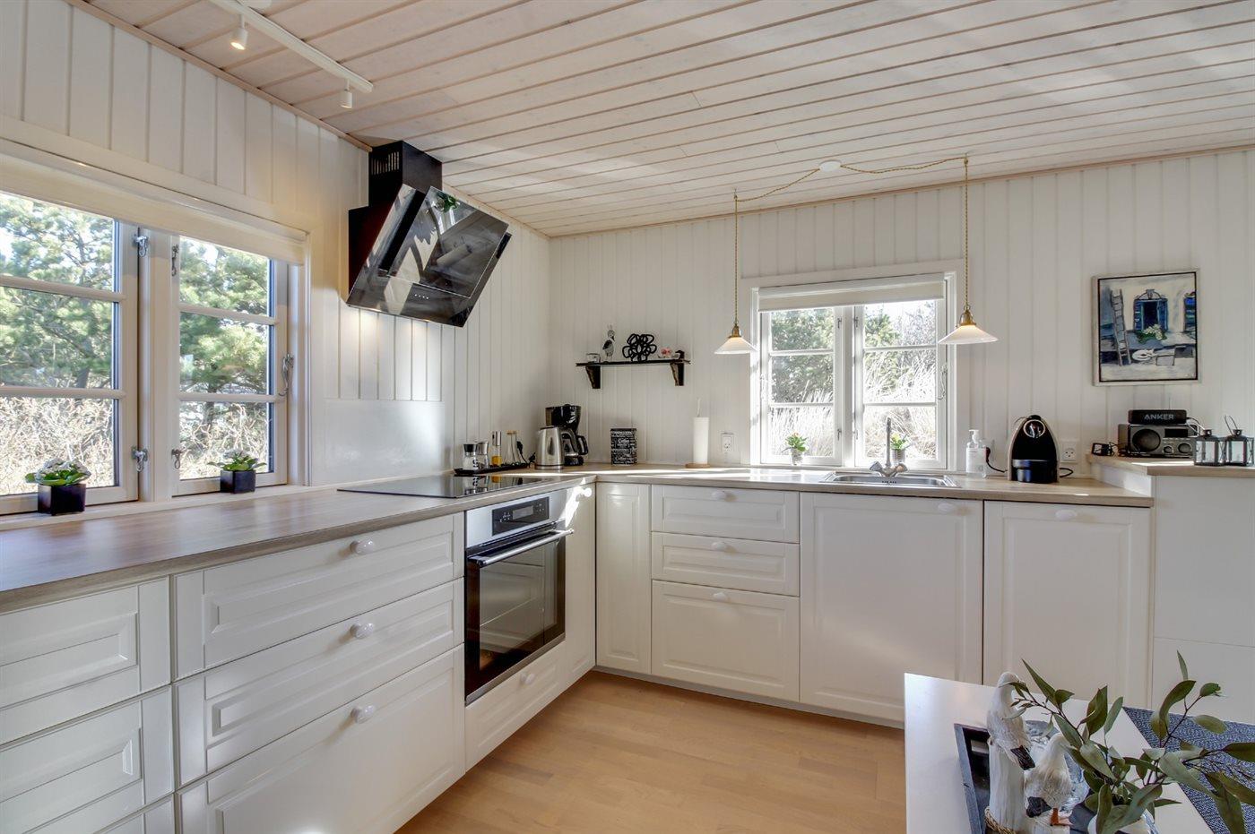 Køkkenet er udstyret med 1 køleskab. Der er 4 keramiske kogeplader, varmluftovn samt opvaskemaskine.
