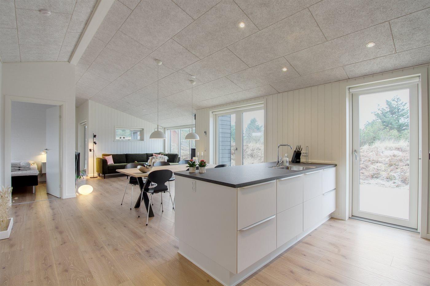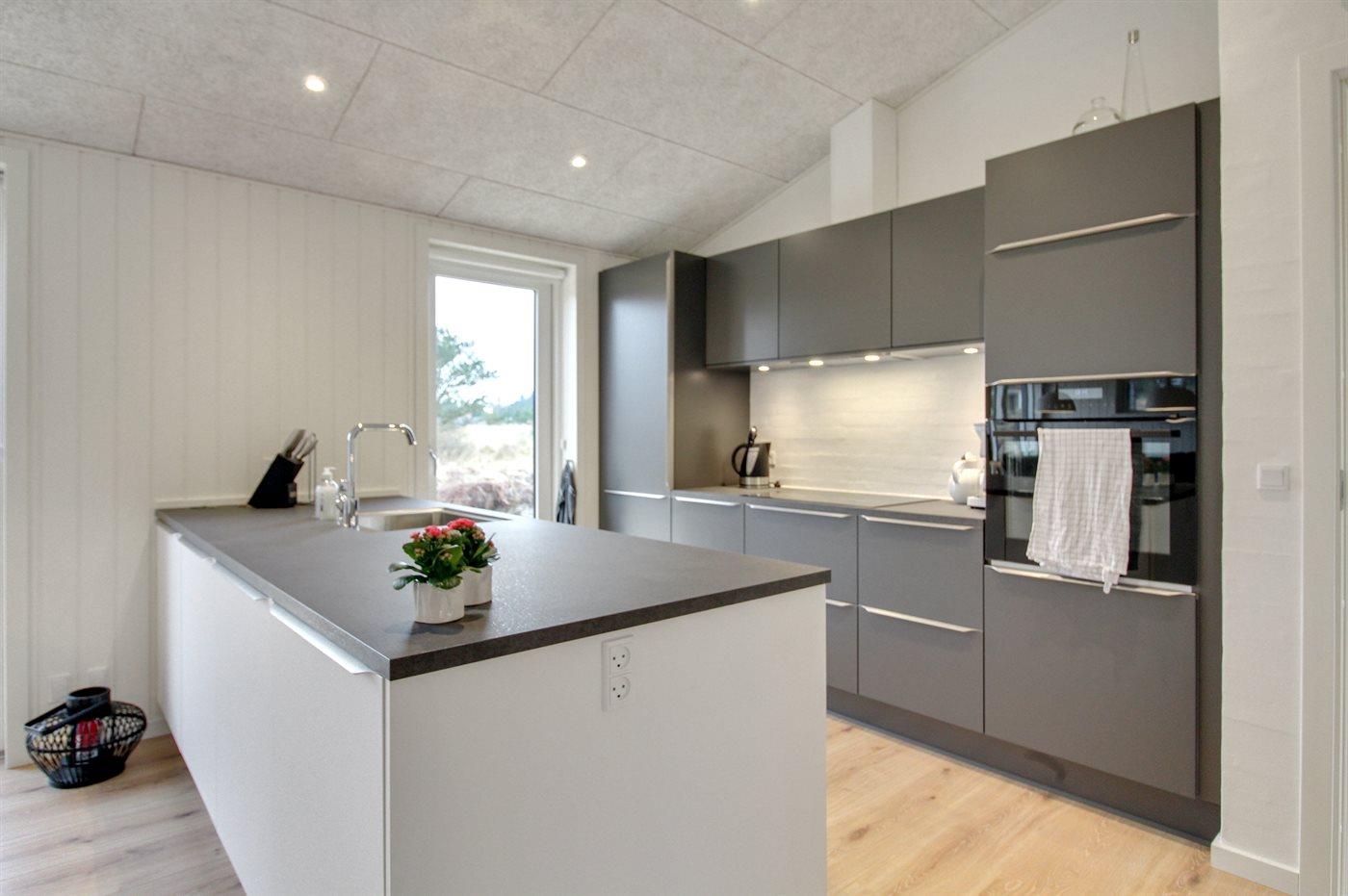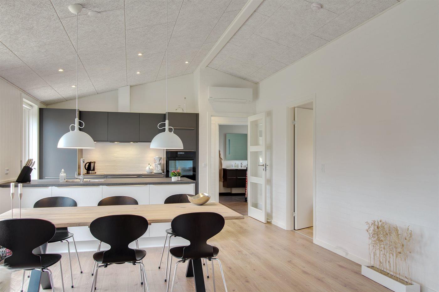 Køkkenet er udstyret med 1 køleskab. Der er 4 induktionskogeplader, varmluftovn, mikrobølgeovn samt opvaskemaskine.