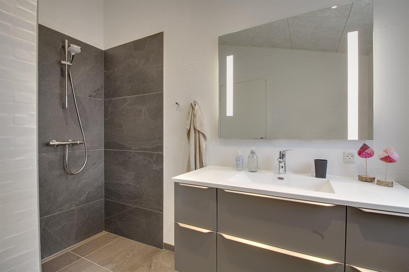 Der er 2 badeværelser med bruseniche og 2 toiletter. Der er gulvvarme på 2 badeværelser. I saunaen er der mulighed for afslapning.