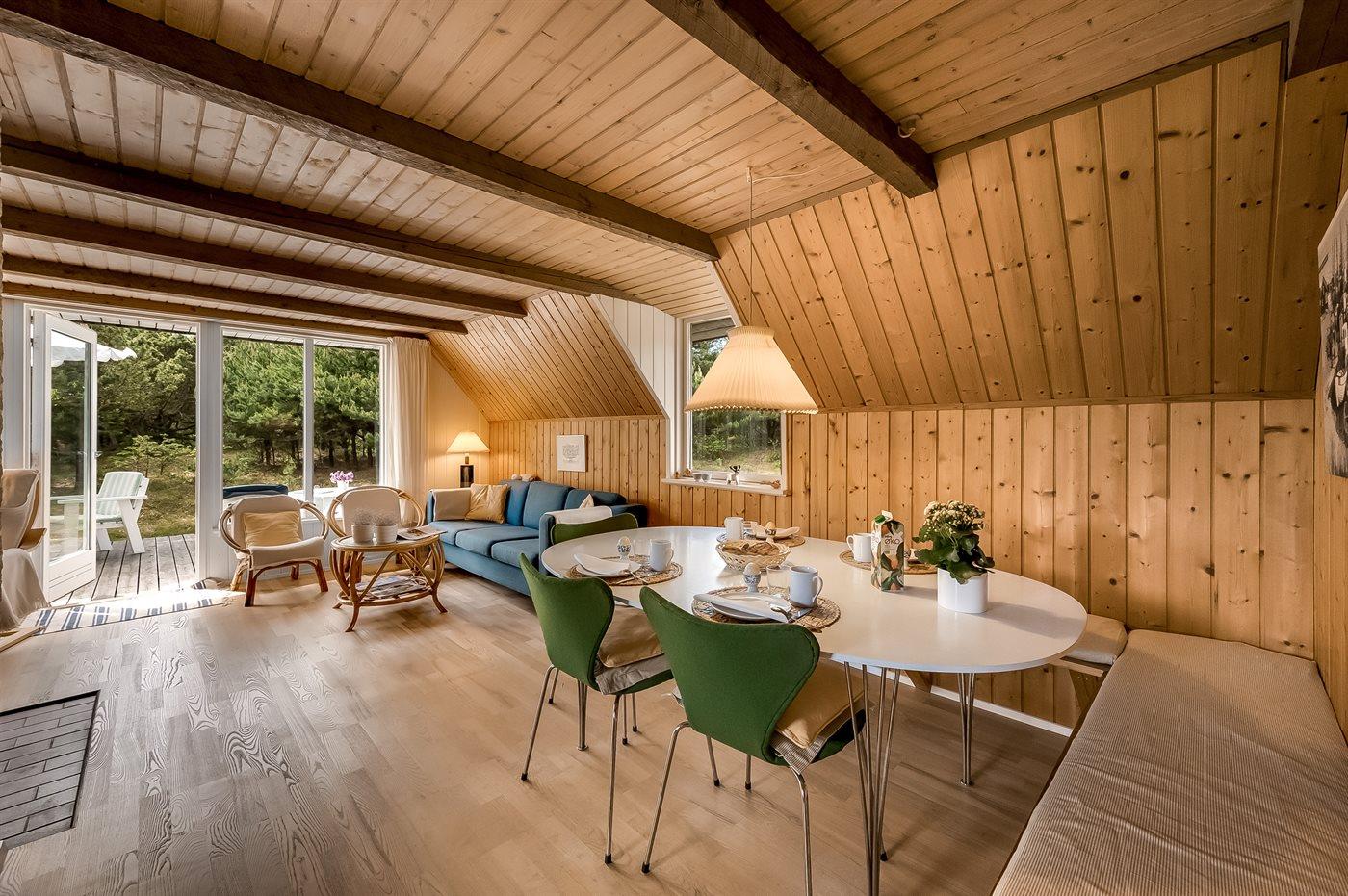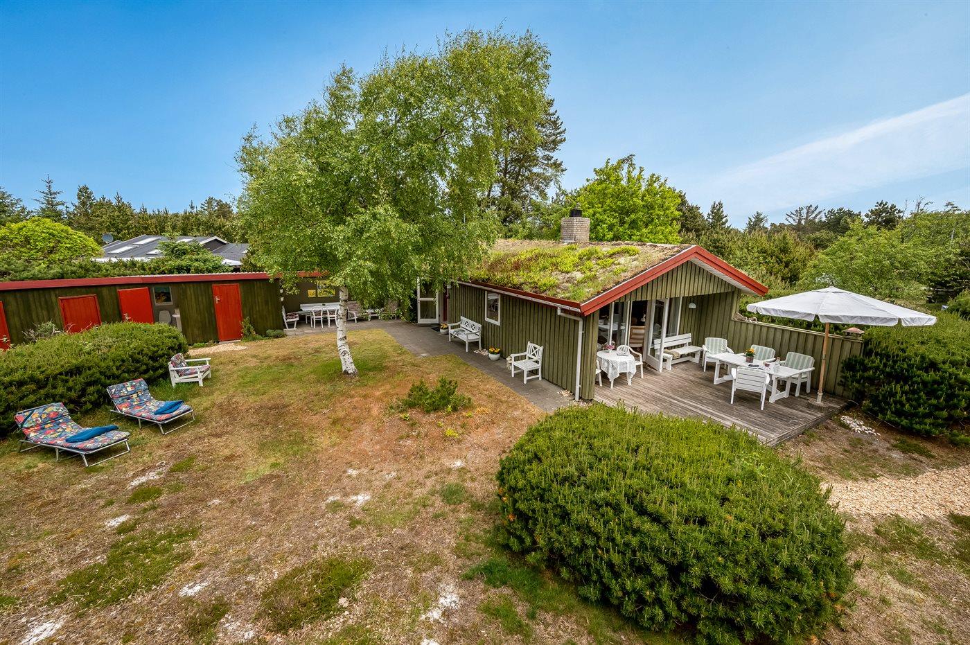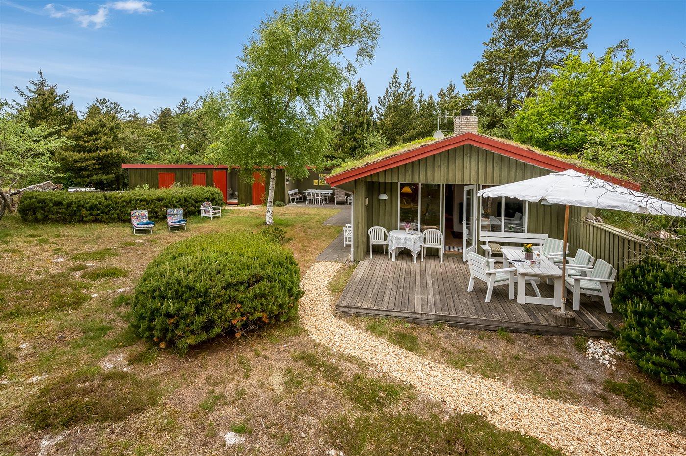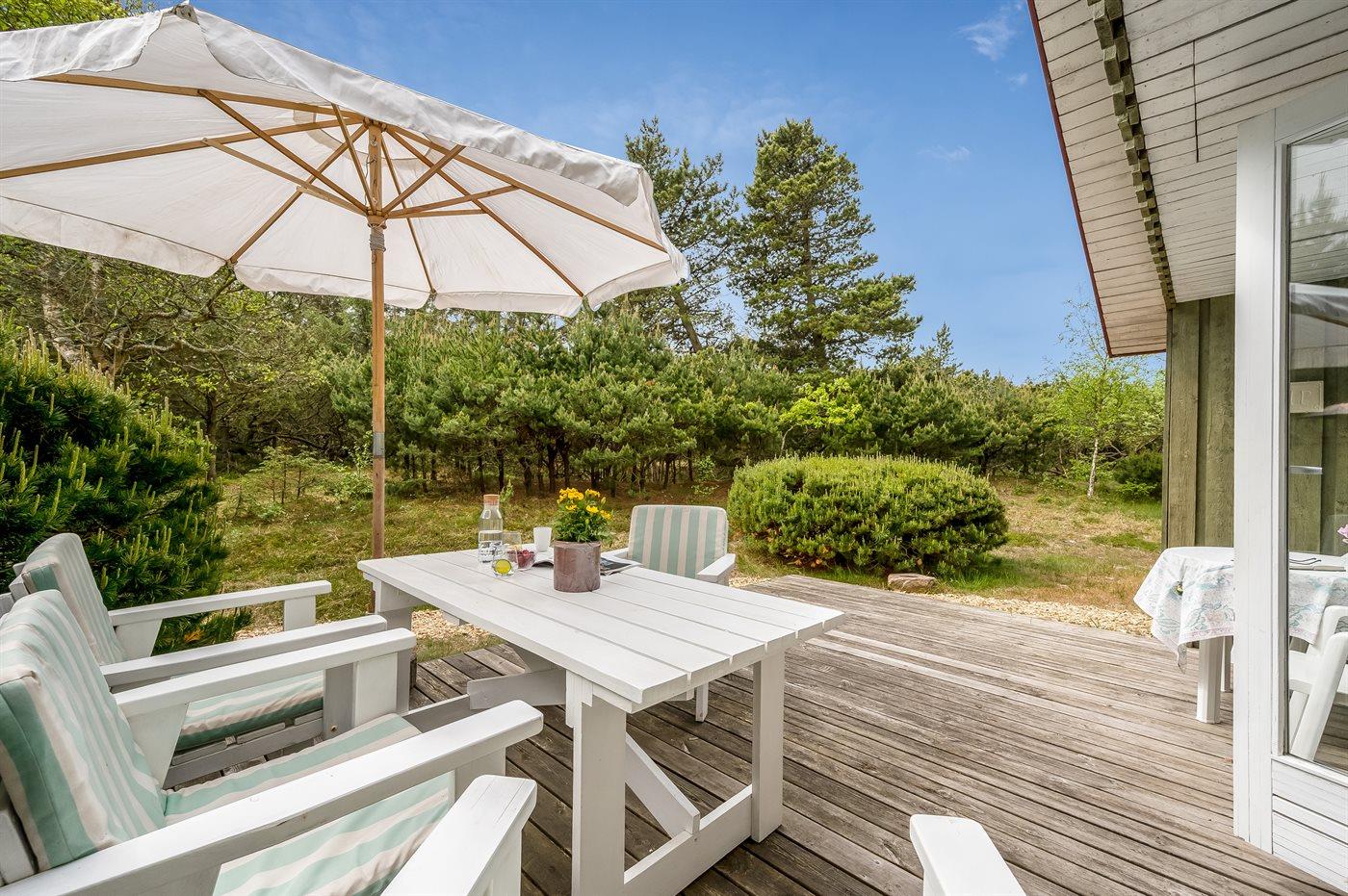 Charmerende sommerhus tæt på vandet i Vejers Strand med ugeneret have og hyggelig overdækket terrasse.