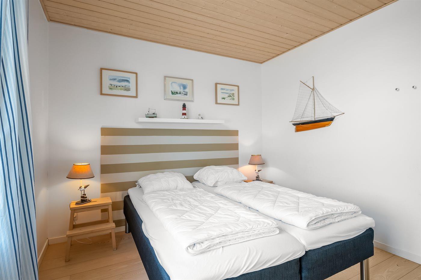 Der er i alt 3 soveværelser. Sovepladserne fordeler sig på: 4 sovepladser i dobbeltsenge. 2 sovepladser i enkeltsenge. Derudover er der 1 stk. barneseng.