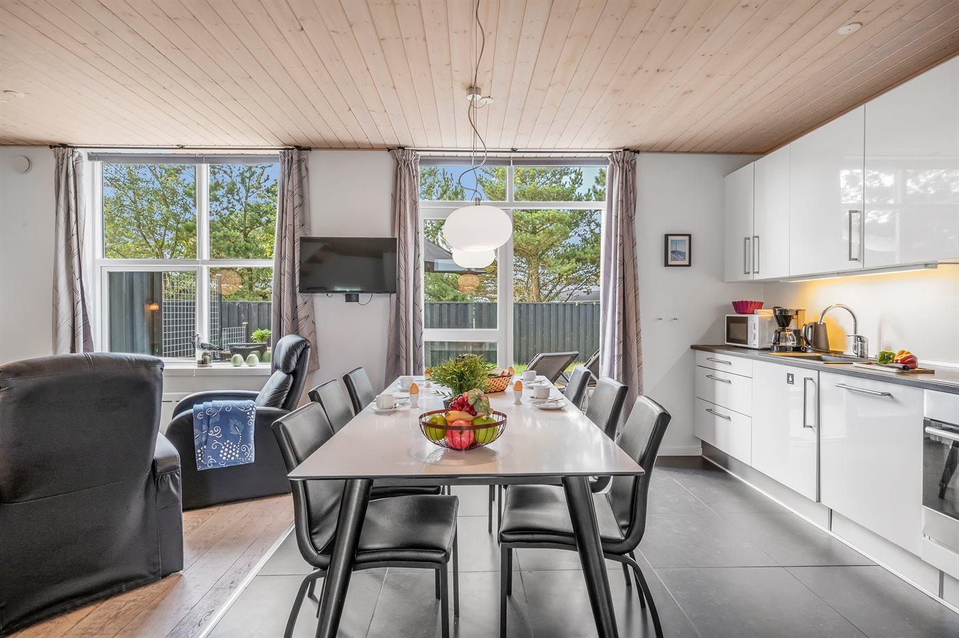 Køkkenet er udstyret med 1 køleskab. Der er 4 keramiske kogeplader, varmluftovn, mikrobølgeovn samt opvaskemaskine.
