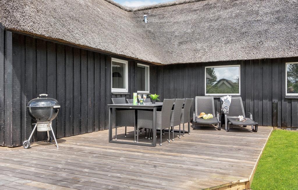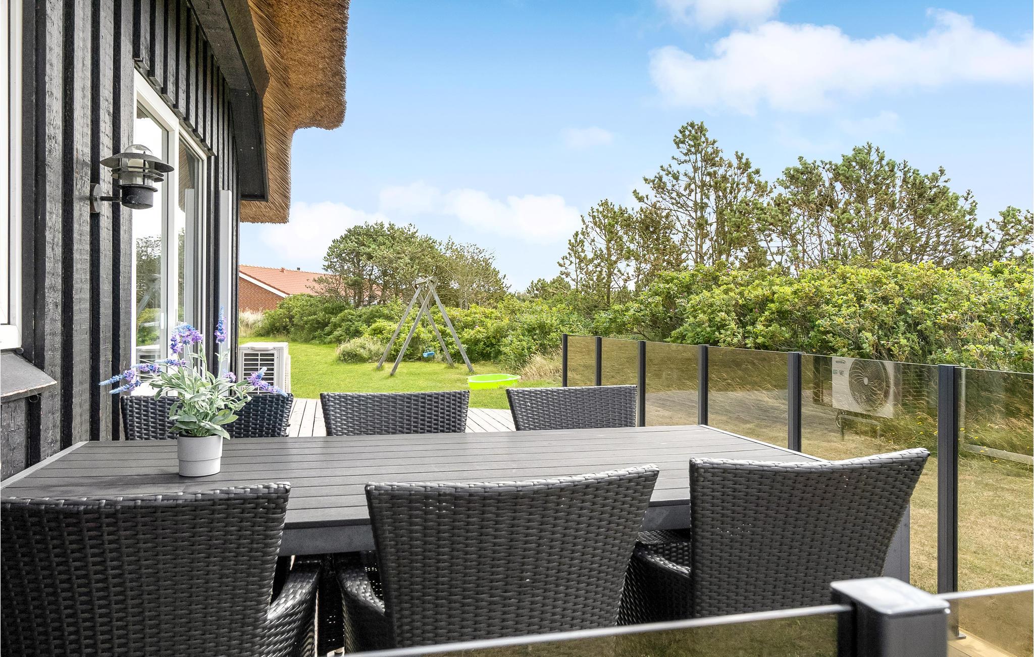 Kom til den jyske vestkyst og oplev en fantastisk ferie i dette skønne feriehus, hvor I kan se frem til frisk havluft i grønne omgivelser. Huset har plads til en stor familie eller et par familier, der holder ferie sammen, inkl. kæledyr. Nyd godt af den enkle og klassiske indretning samt den rummelige terrasse foran huset. Slap i solen på liggestolene, eller sæt jer til bords med et godt sommermåltid i godt selskab og med en smuk solnedgang i baggrunden.