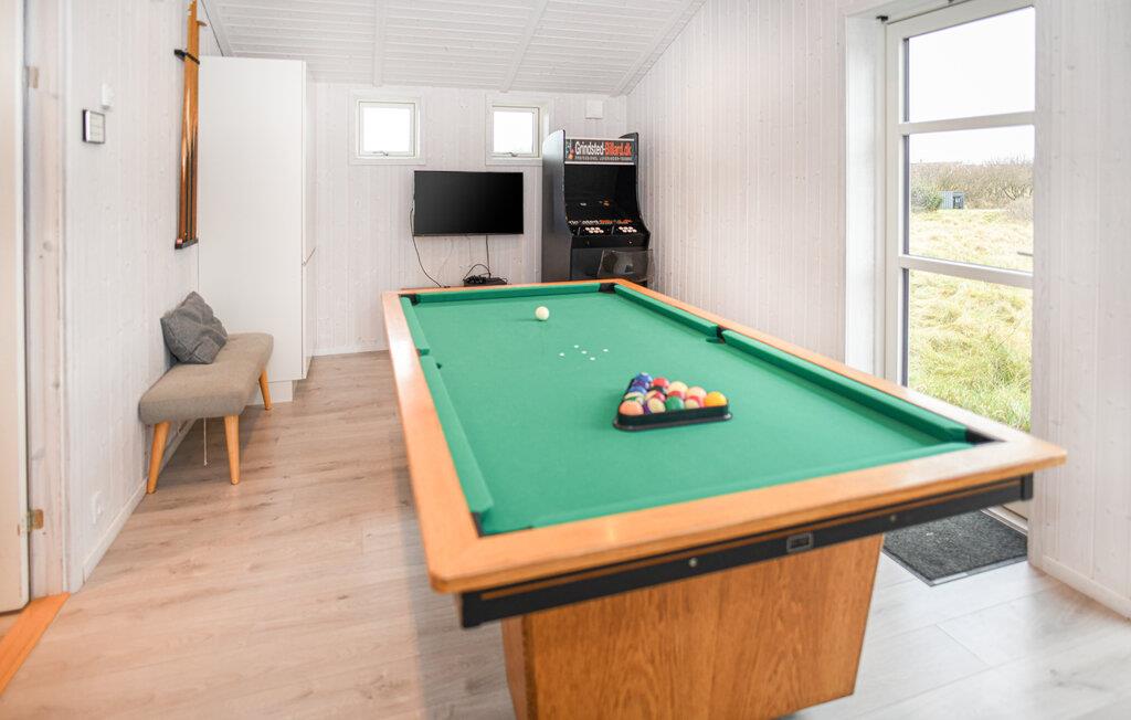 Nyd den lyse opholdsstue med den store sofagruppe. Tilbered jeres måltider i det elegante, moderne køkken, som tilbyder rigeligt med bordplads til fælles madlavning. Brug det lange spisebord til fælles måltider eller til hyggelige aftener med spil og underholdning. Slap af i spabadet, eller nyd varmen fra brændeovnen efter en lang dag på stranden. Tag et spil billard, eller udfordr hinanden ved spillekonsollen.