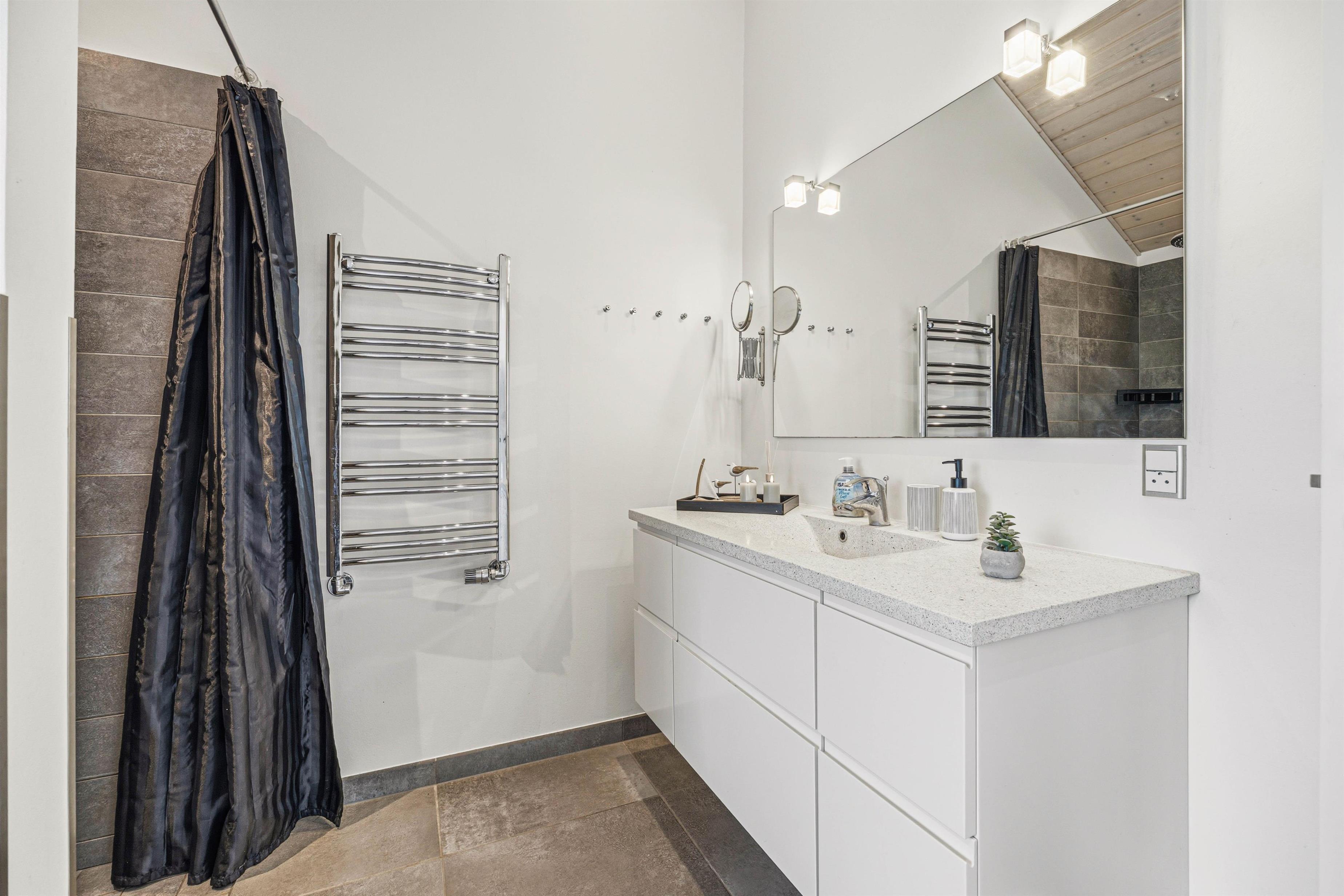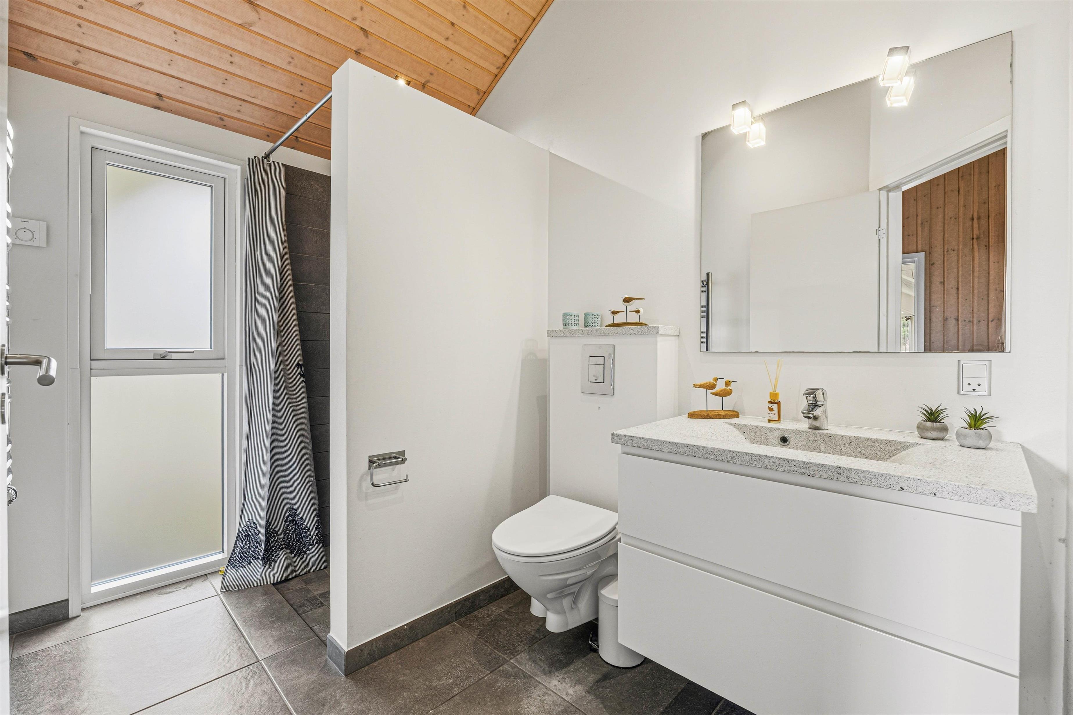 Udvendigt finder I en stor terrasse, som fortsætter hele huset rundt og gemmer på masser af hyggekroge, hvor I kan sidde i solen med en god bog. De høje træer rundt om den 1500 kvadratmeter store grund gør beliggenheden ugeneret og sørger for god læ sammen med afskærmningen på terrassen.