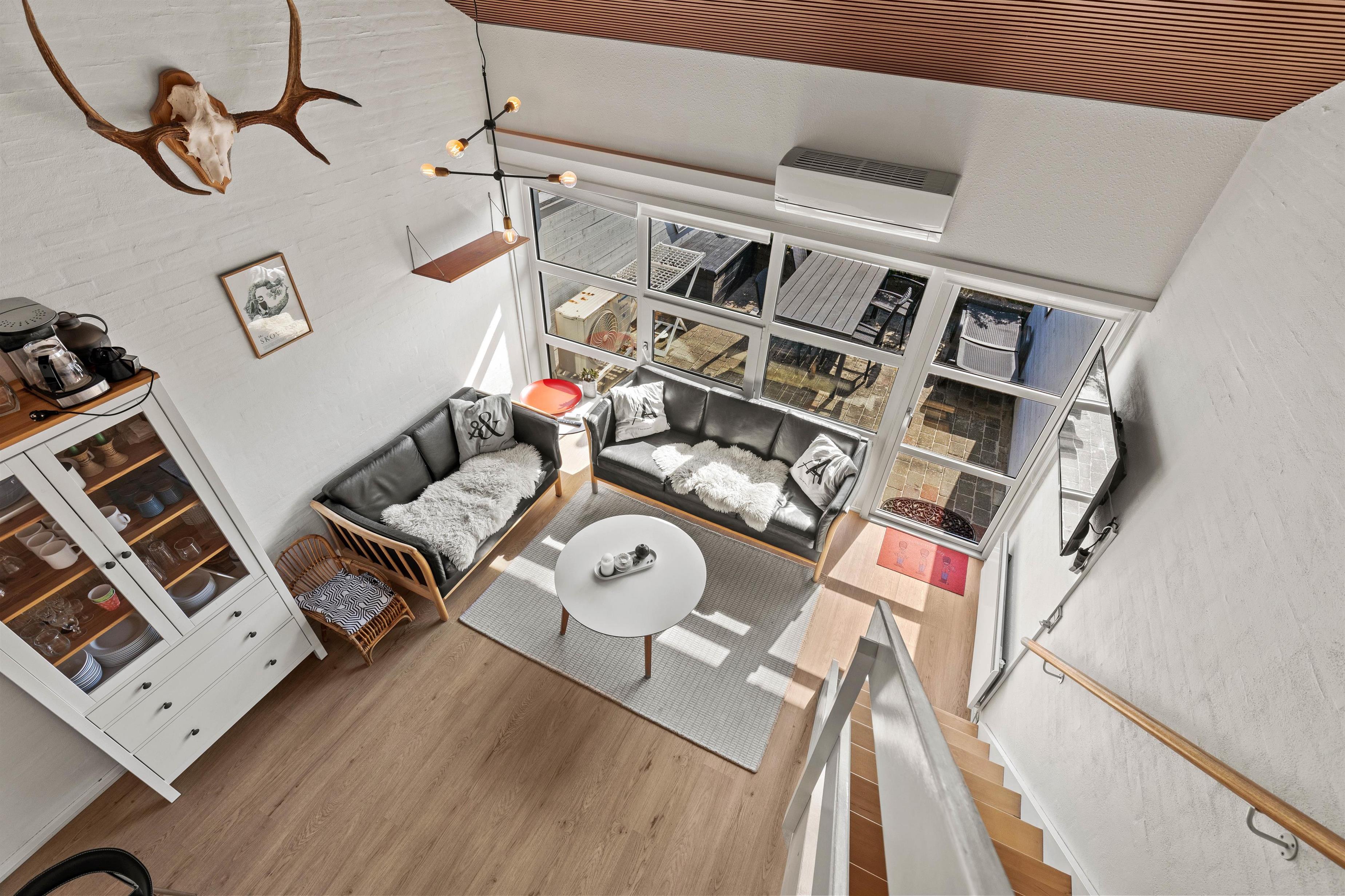 Fra sofaområdet er det muligt at gå direkte ud på den sydvestvendte terrasse, hvor du kan sidde og nyde solen eller sidde ude og spise i det gode vejr.
