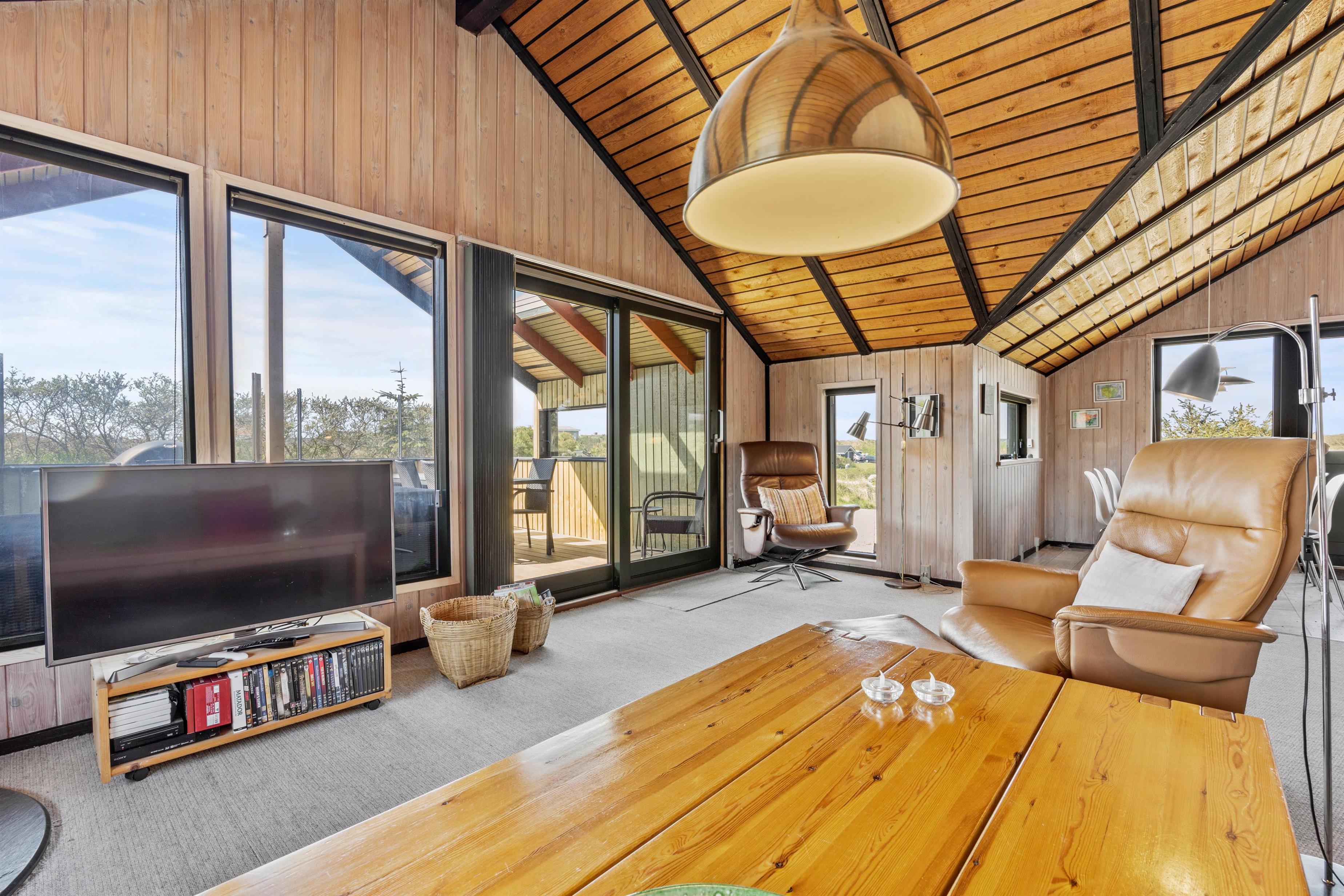 Velkommen i et charmerende og ur typisk feriehus, hvor stue og køkken-alrum går ud i et, og alt ånder hygge og afslapning, med personlig indretning og trævægge. Når det er råkoldt udenfor eller når mørket sænker sig over klit og hede, så tænd op i brændeovnen og hyg med familien i stuen eller ved spiseborde imens det varme skær fra ilden danser på trævæggene.