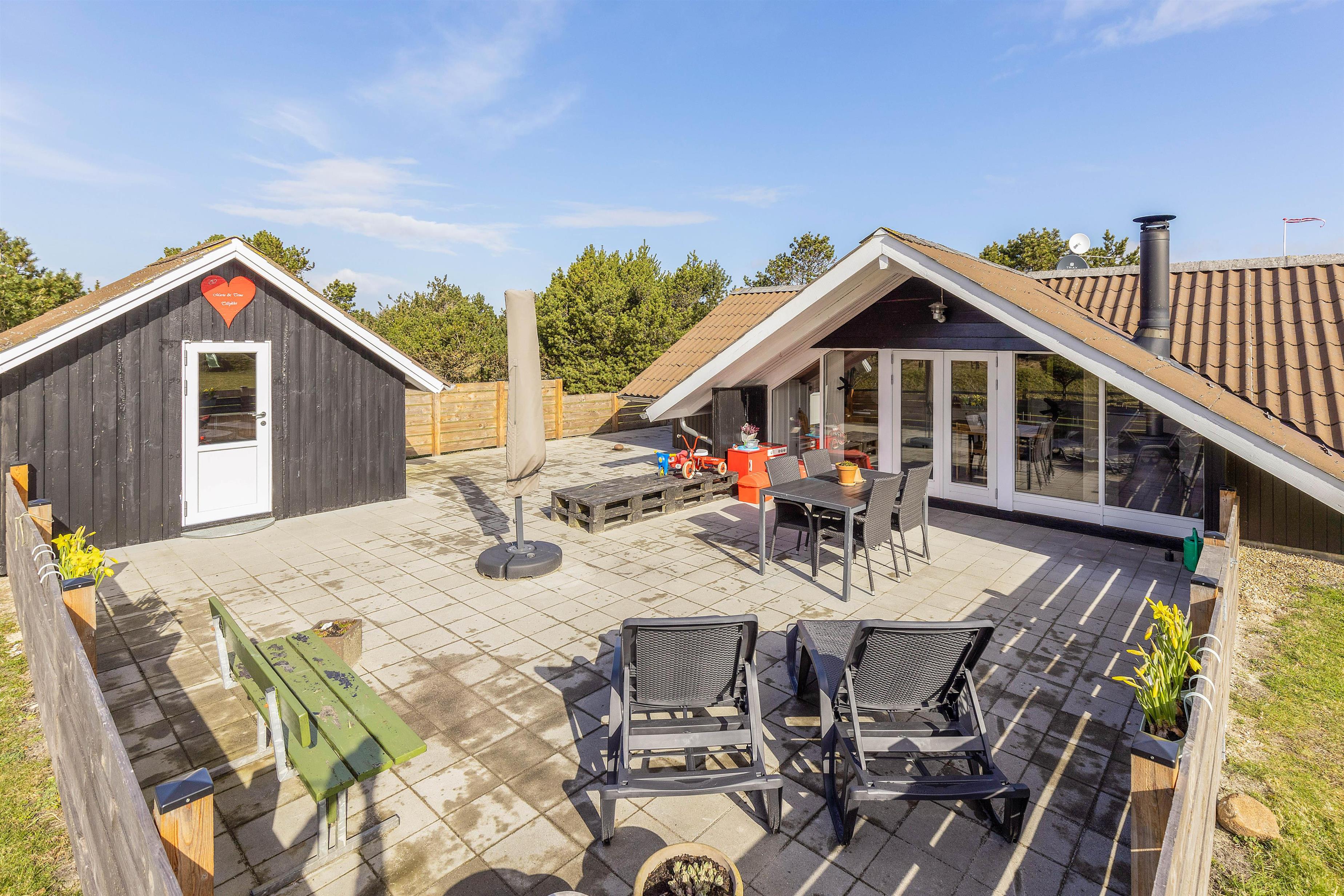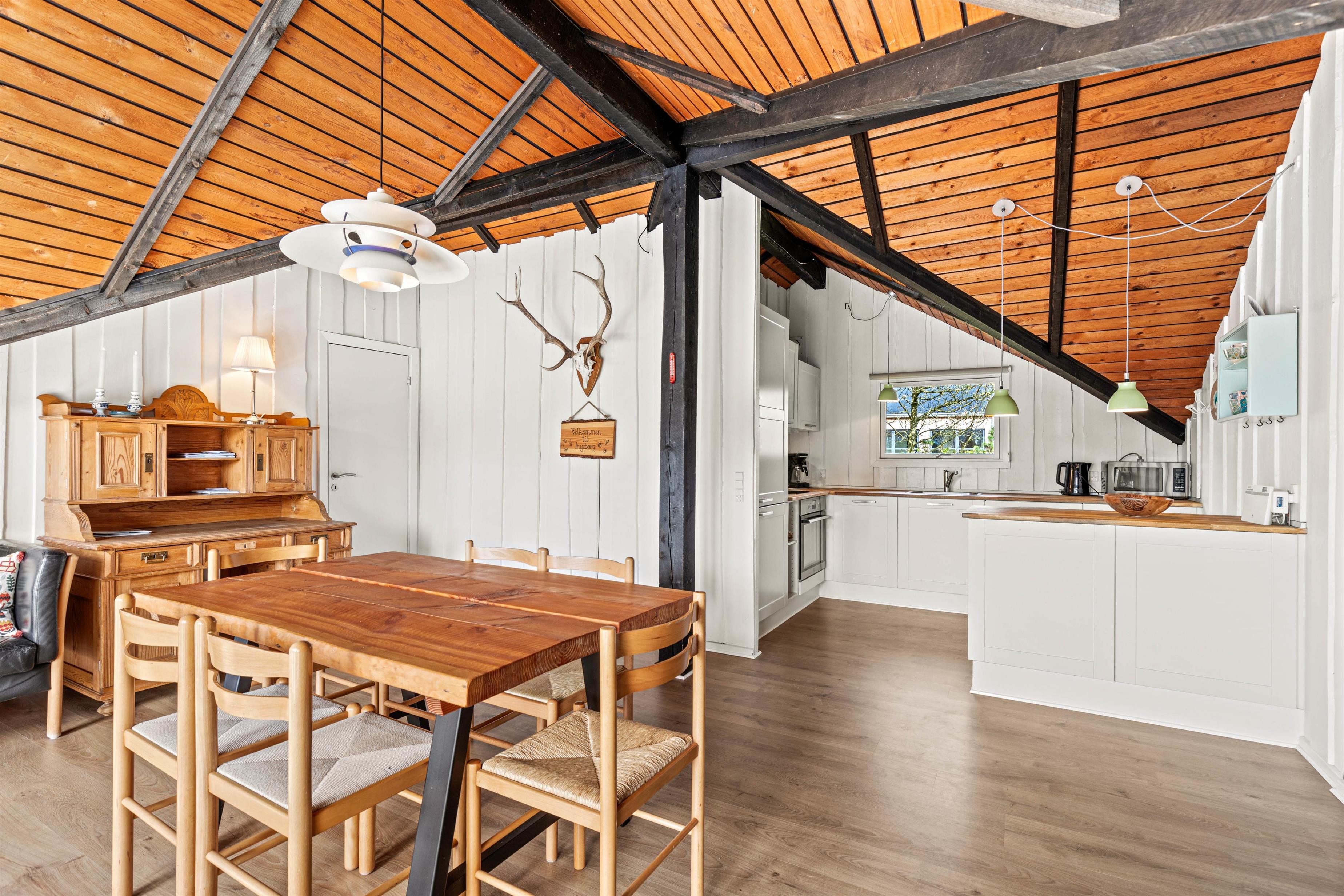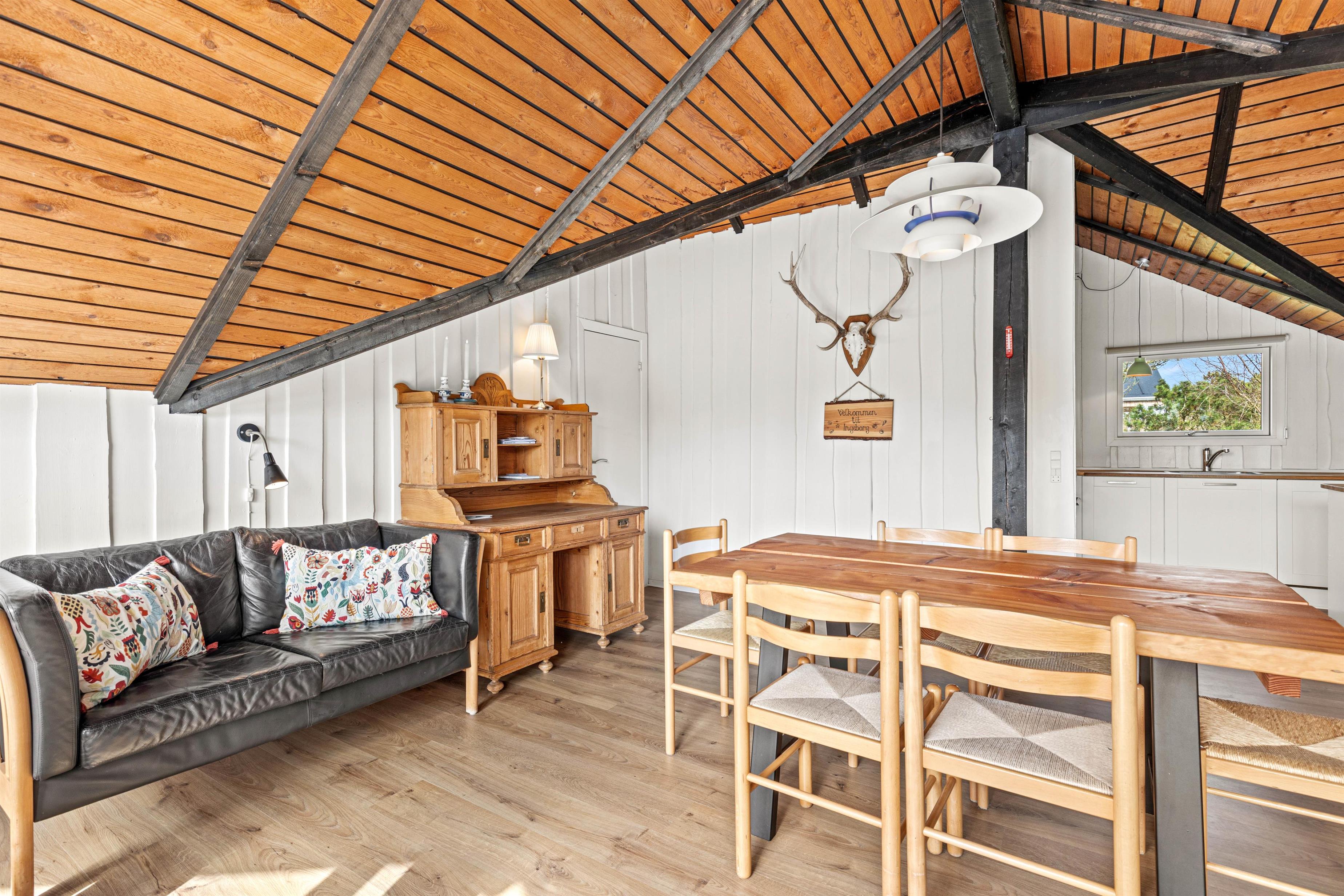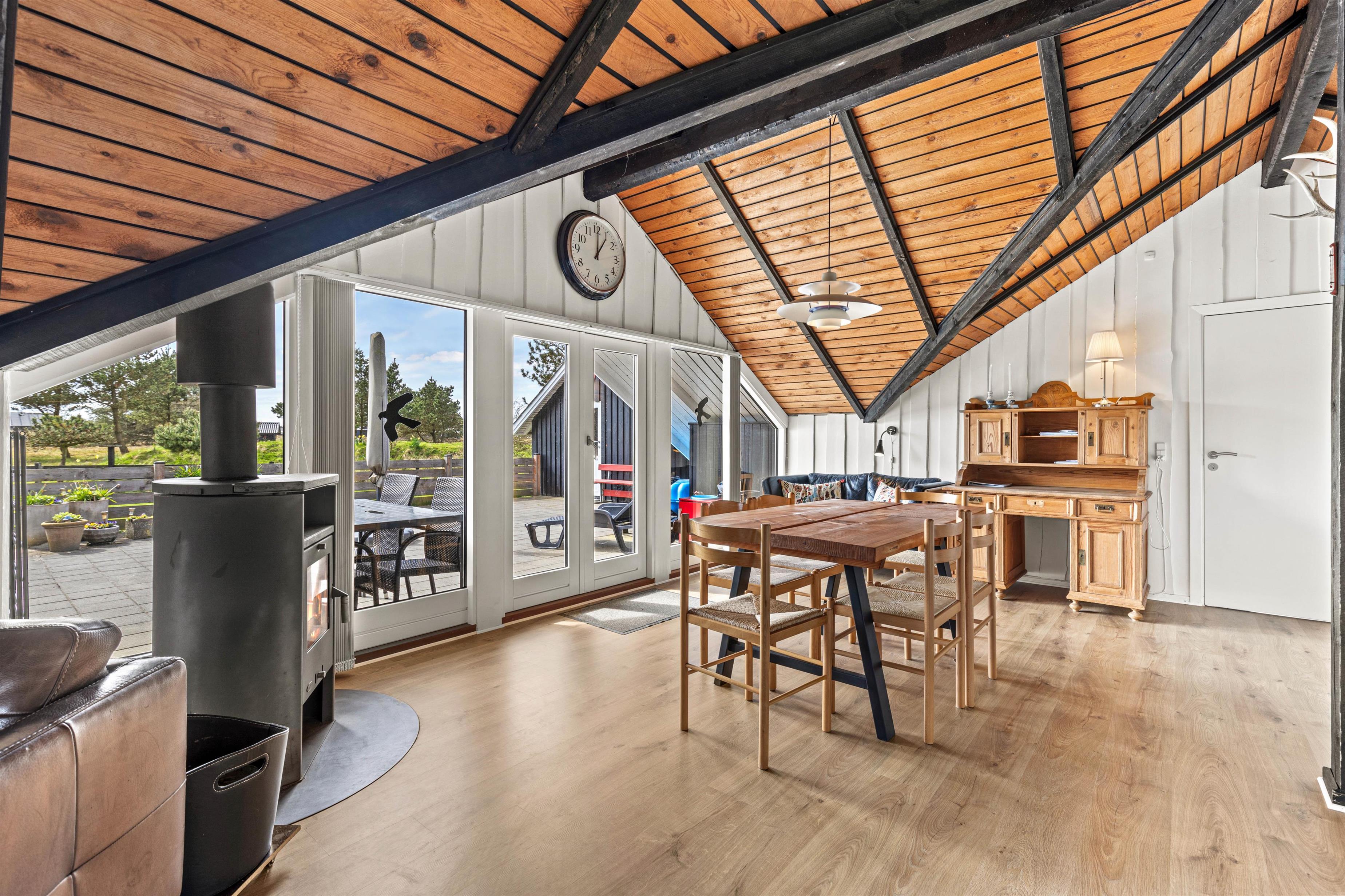 Sommerhuset på Engesøvej 48 i Vejers rummer en virkelig hyggelig indretning, hvor I hurtigt vil finde jer godt til rette, når I ankommer. Her udgør alrummet, hvor køkken, stue og spiseplads er samlet, det store samlingspunkt på jeres ferie. Her kan I nyde hinandens selskab, mens I laver mad, spiller spil og ser film. Brændeovnen fuldender feriestemningen og spreder samtidig god varme.