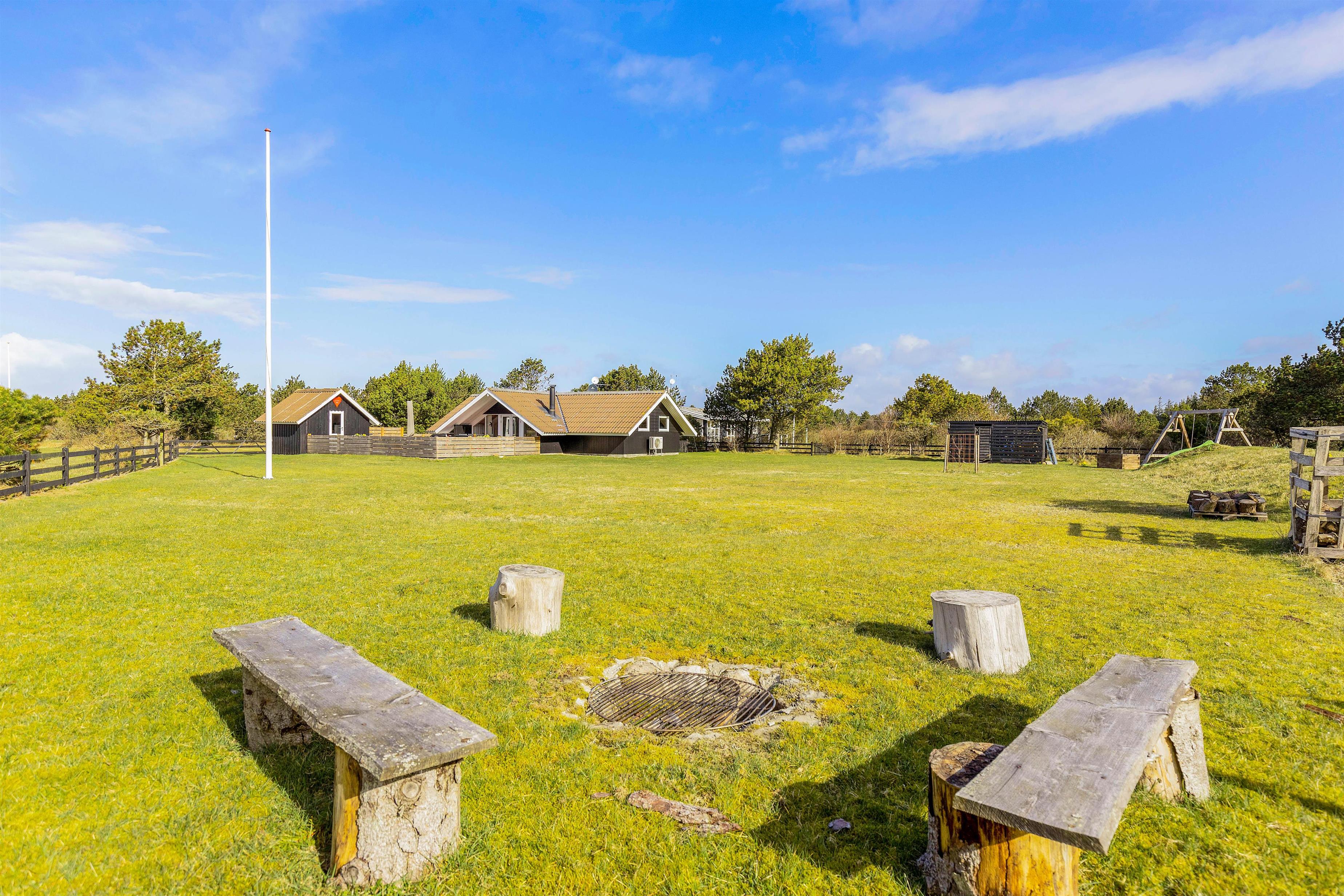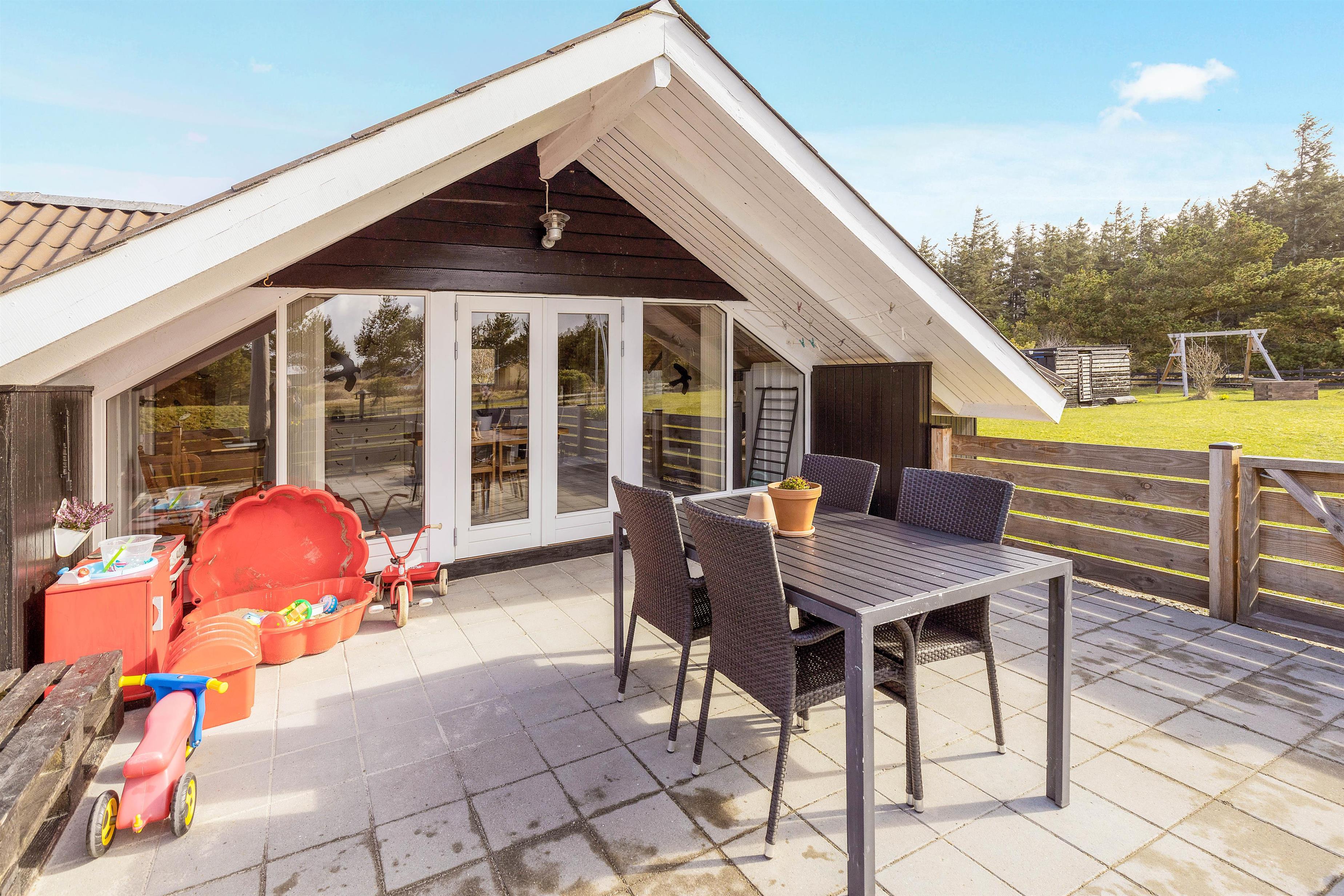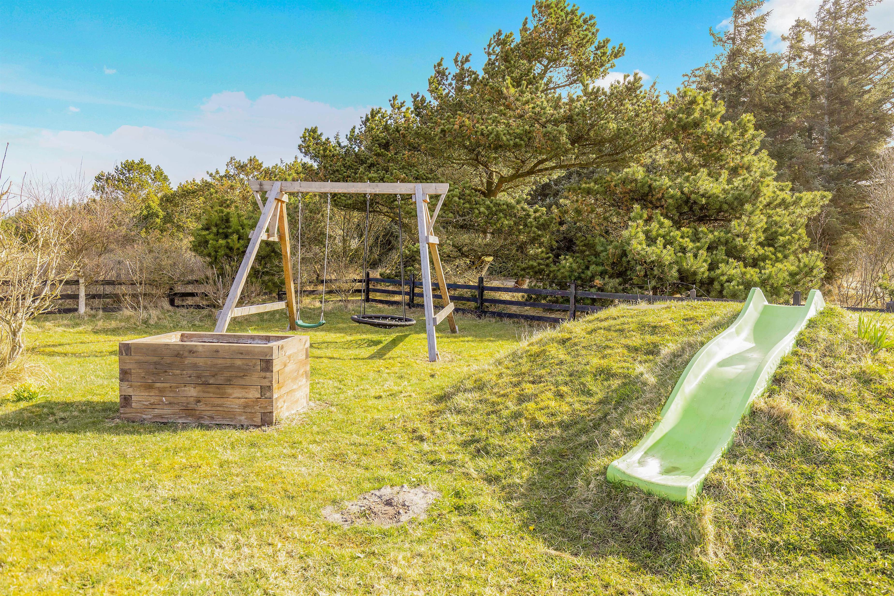 På grunden er der også noget for feriens yngste gæster. Her er nemlig både sandkasse og gyngestativ, som de kan få stor glæde af på ferien, mens I andre slapper af i havemøblerne og liggestolene på terrassen. På terrassen kan I også samles om aftenen til en lækker middag på grillen.