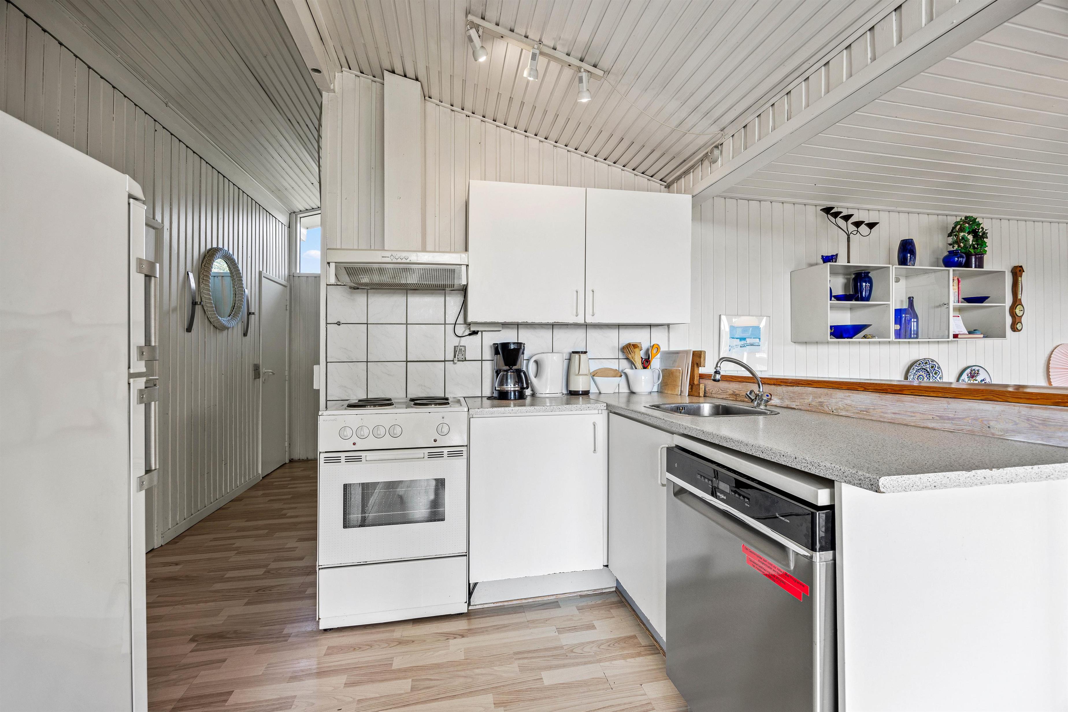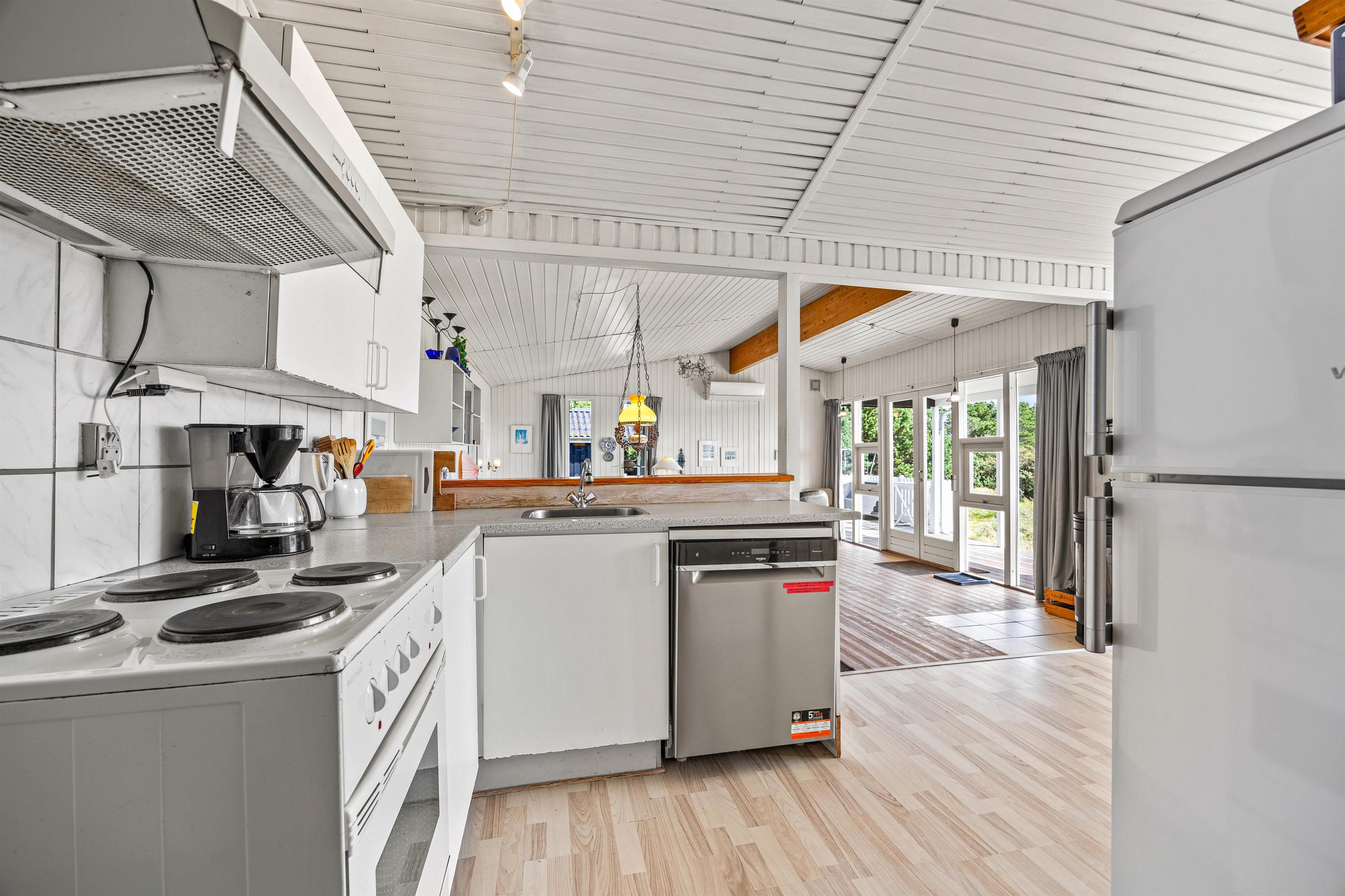 Sommerhusets hjerterum er det store lyse køkken/alrum, som ligger i åben forbindelse med stuen. Køkkenet er fuldt udstyret med opvaskemaskine, mikroovn og en separat fryser på 30 liter, og måltiderne kan I nyde ved spisebordet kun et trin nede fra køkkenet. Herefter kan I slappe af i sofaerne eller slå jer ned i udestuen og måske være heldige at se nogle af de lokale, vilde dyr lægge vejen forbi de store panoramavinduer, som giver jer et skønt kig ud over hedelandskabet.