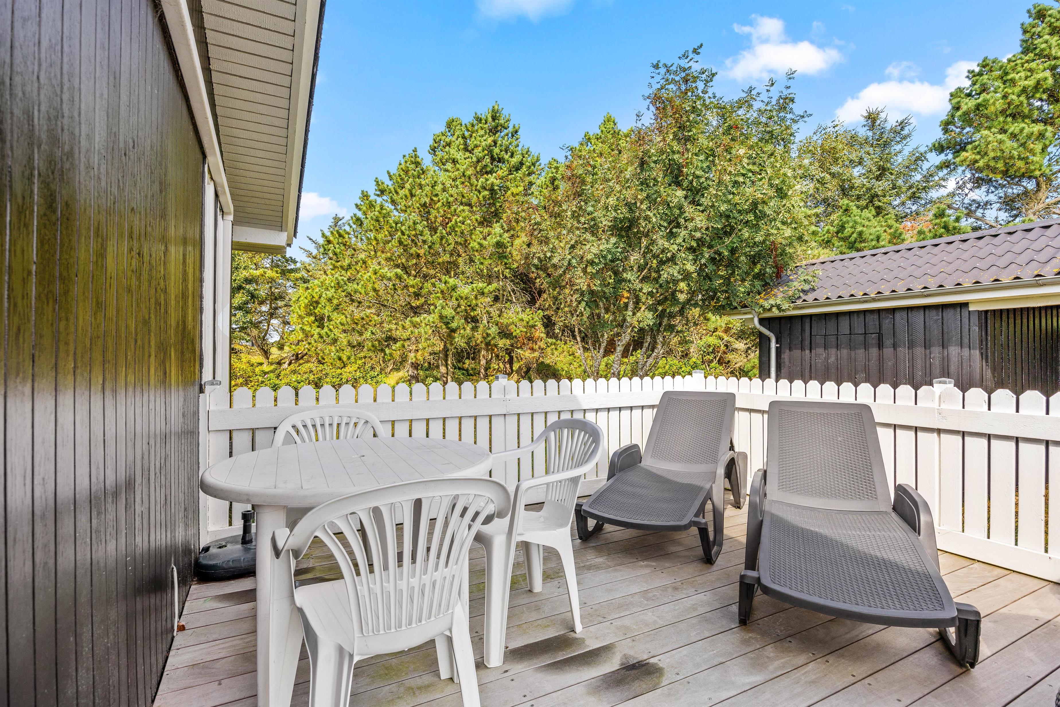 Sommerhuset byder på både en overdækket og en åben, fin terrasse, hvilket gør det muligt at nyde den friske luft uanset vejret. Imens I laver dejlig feriemad på kulgrillen, kan I kan sætte jer til rette i de komfortable havemøbler og nyde udsigten til den skønne natur, der omgiver jer, og børnene, som hygger sig på gyngestativet og har masser af plads til leg og livsglæde.