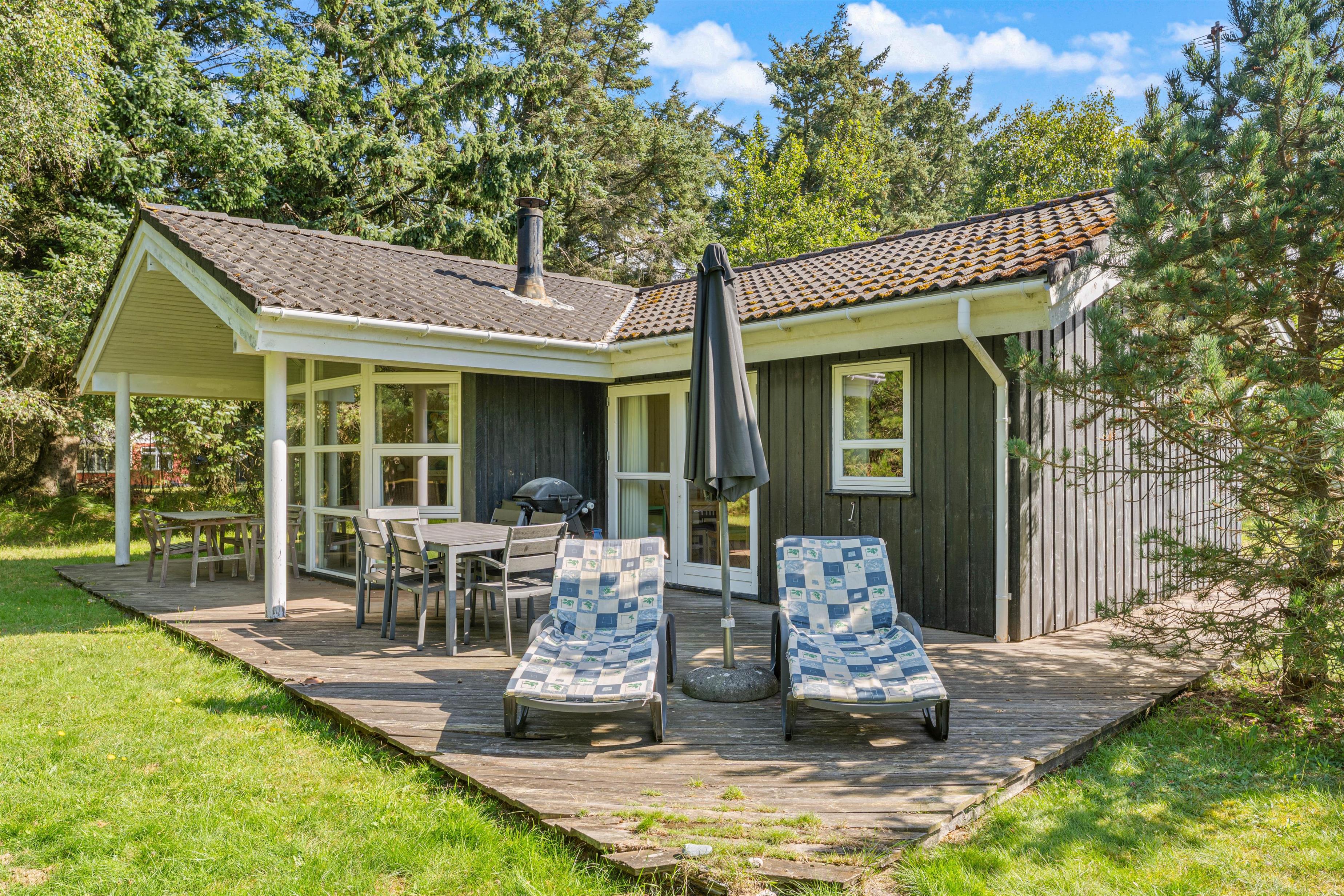 Feriehuset ligger på en stor naturgrund omgivet af høje træer. Her kan I helt ugeneret nyde de dejlige solskinsdage på terrassen, mens fuglene kvidrer i trætoppene, og ungerne spiller bold på græsplænen.