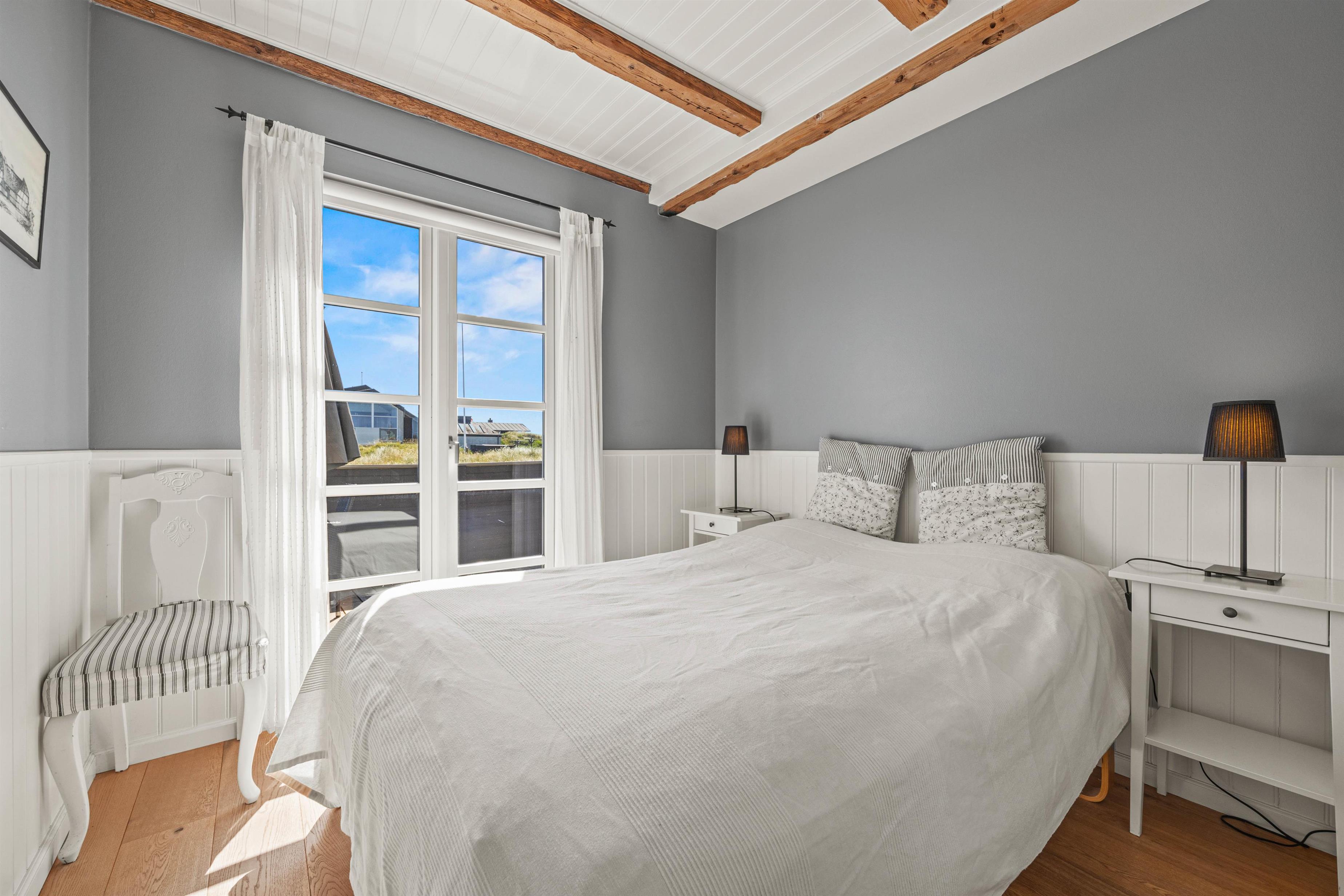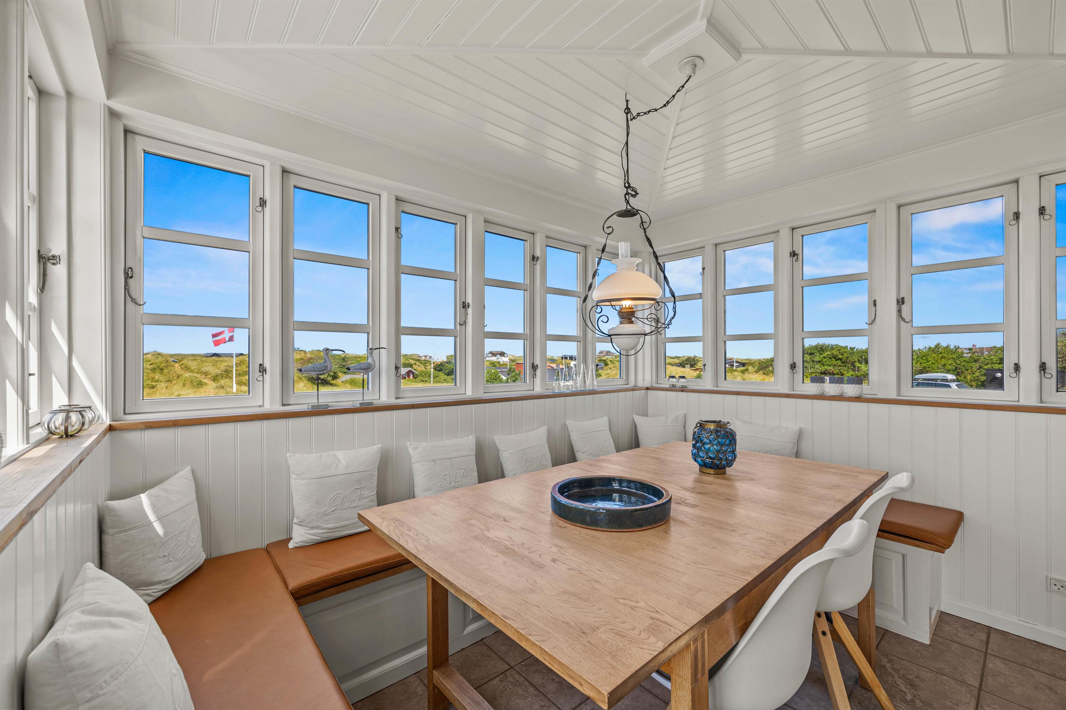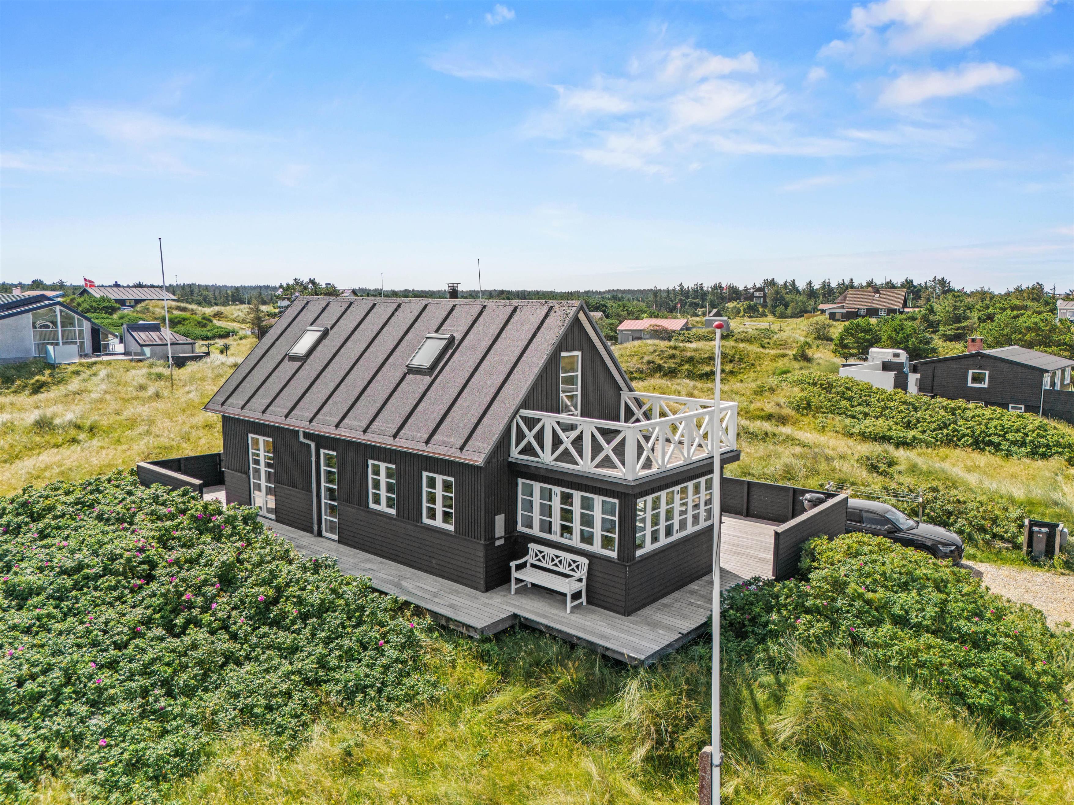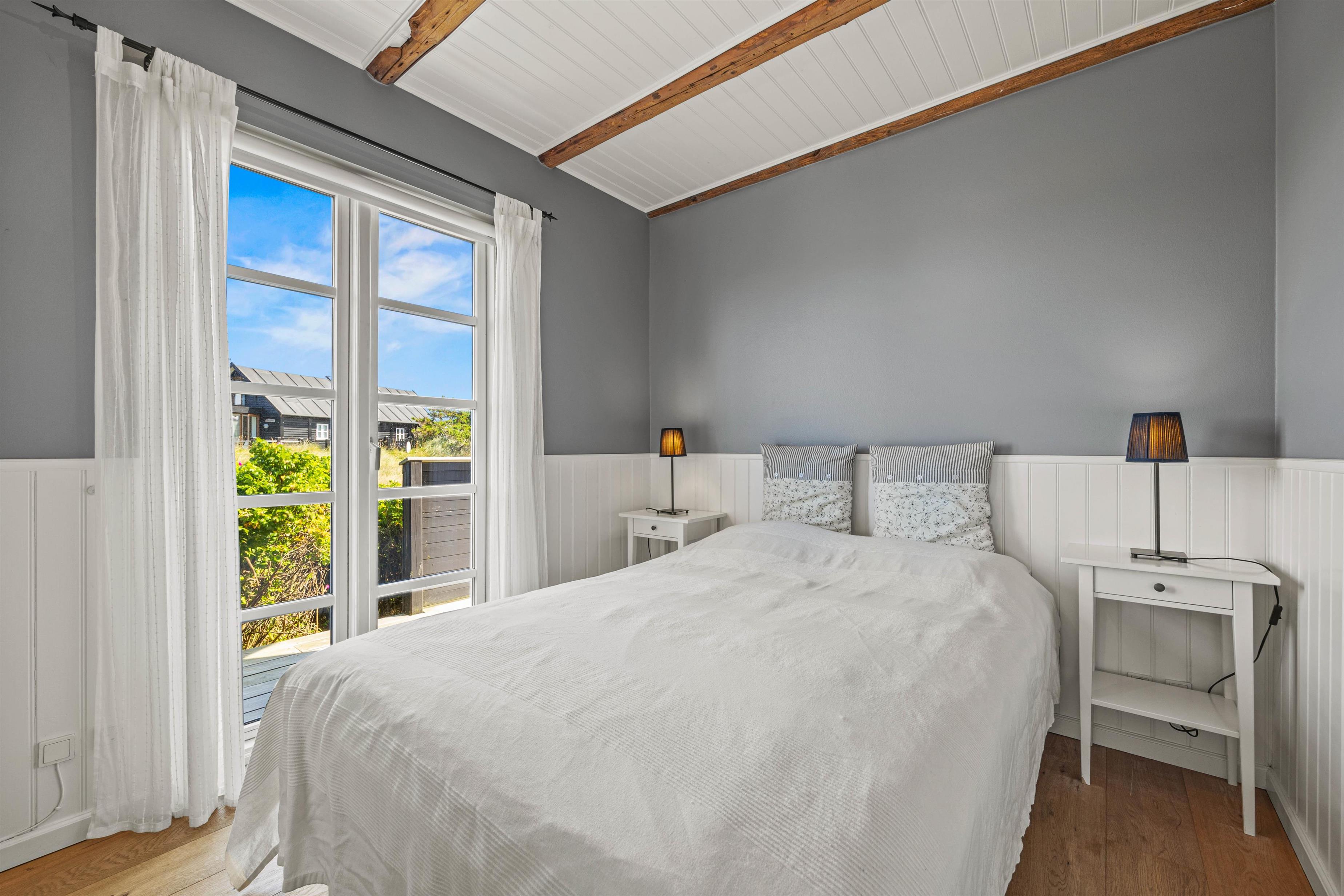 Det 80 kvadmeter store sommerhus i Vejers byder på en charmerende beliggenhed på en klitgrund. Parkér bilen og følg trapperne op til huset. Her bliver I budt velkommen indenfor i et hyggeligt og smagfuldt indrettet sommerhus. Her er smukke frie spær, afstemte farvenuancer og ikke mindst den smukke udsigt udover klitterne, som blandt andet kan nydes under aftensmaden.