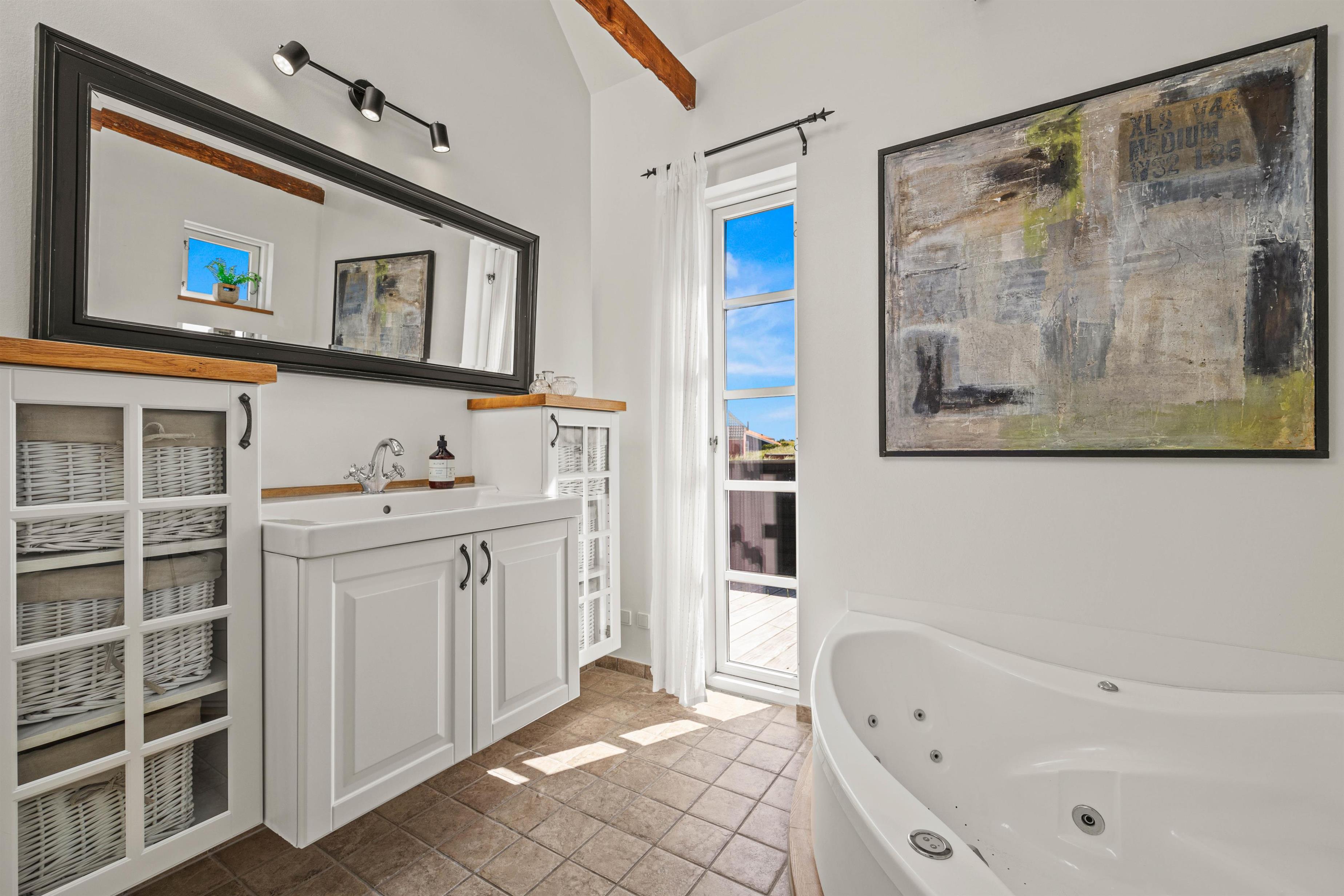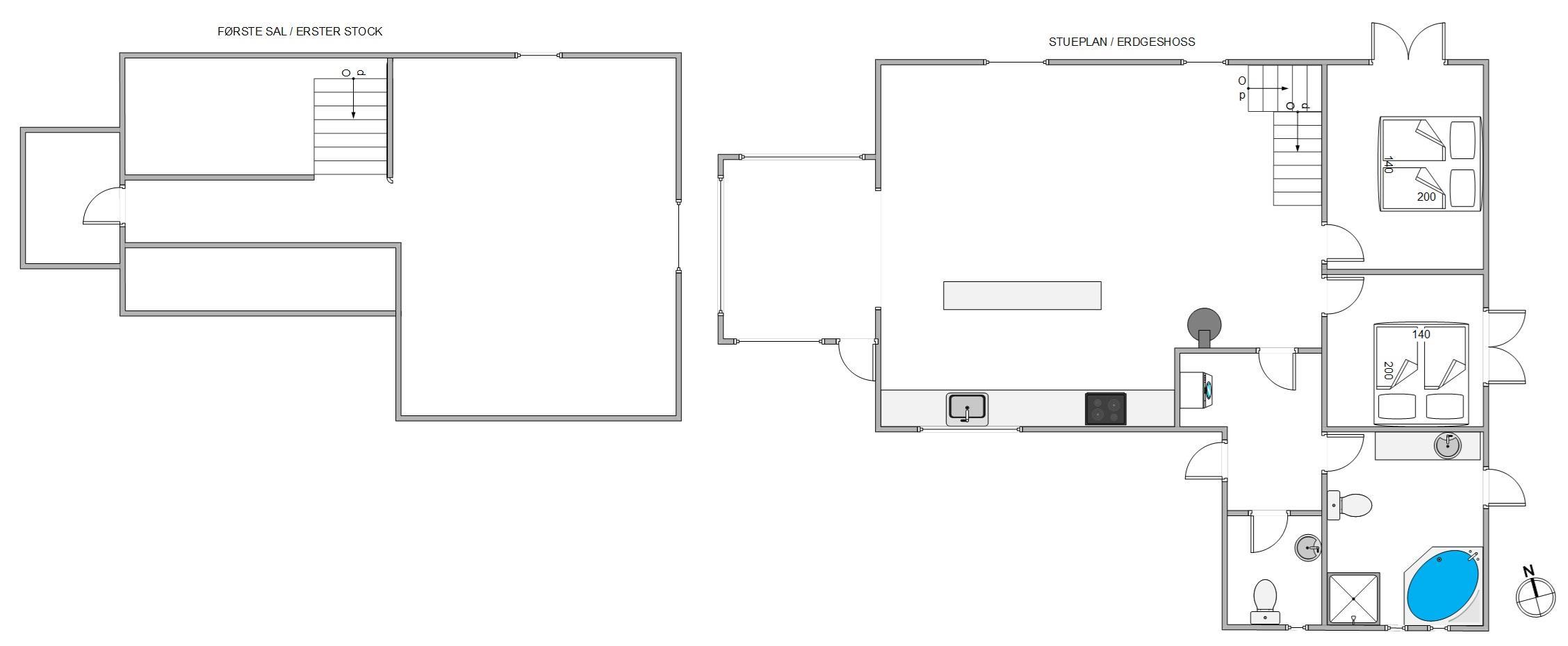 I stueetagen finder I først og fremmest to soveværelser, badeværelset med spabad og det rummelige køkkenalrum. Her er plads til familielivet – uanset om I skal lave dejlig mad i det veludstyrede køkken, spille brætspil ved slagbænken eller slappe af med en god bog foran den knitrende brændeovn, der skaber varme og hygge. I stueetagen er der gulvvarme overalt, og trappen fører jer op til tv-stuen.
