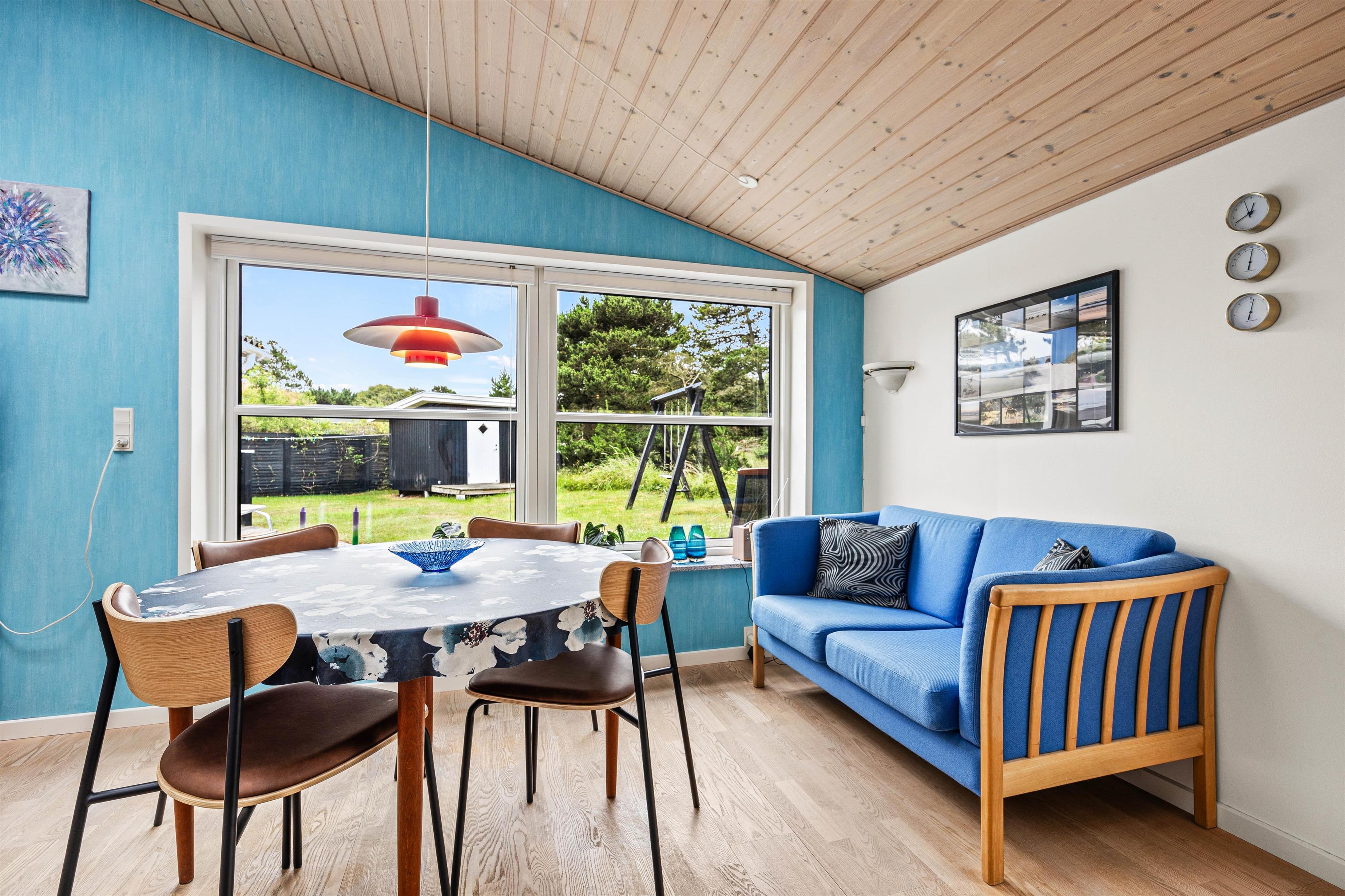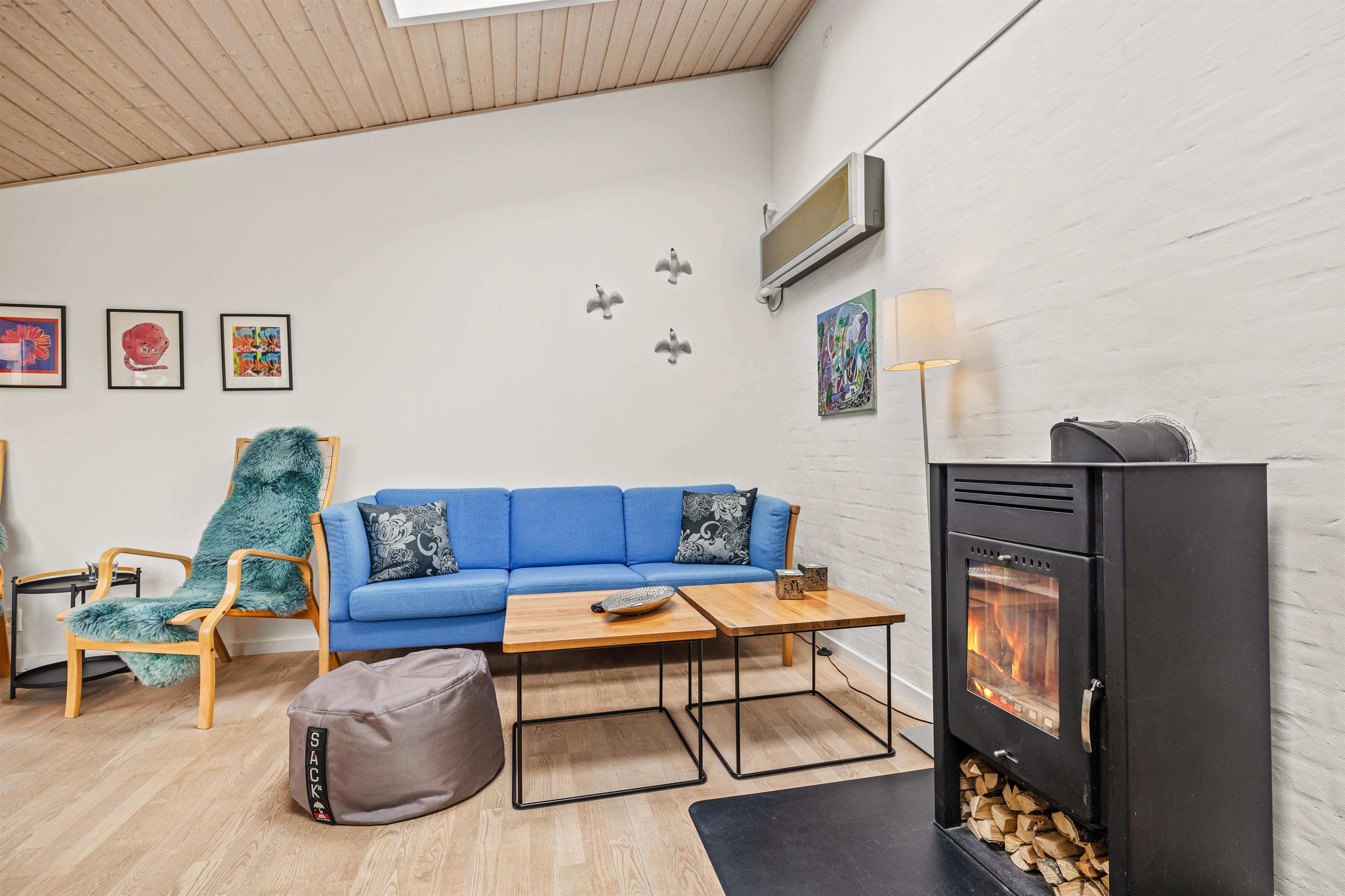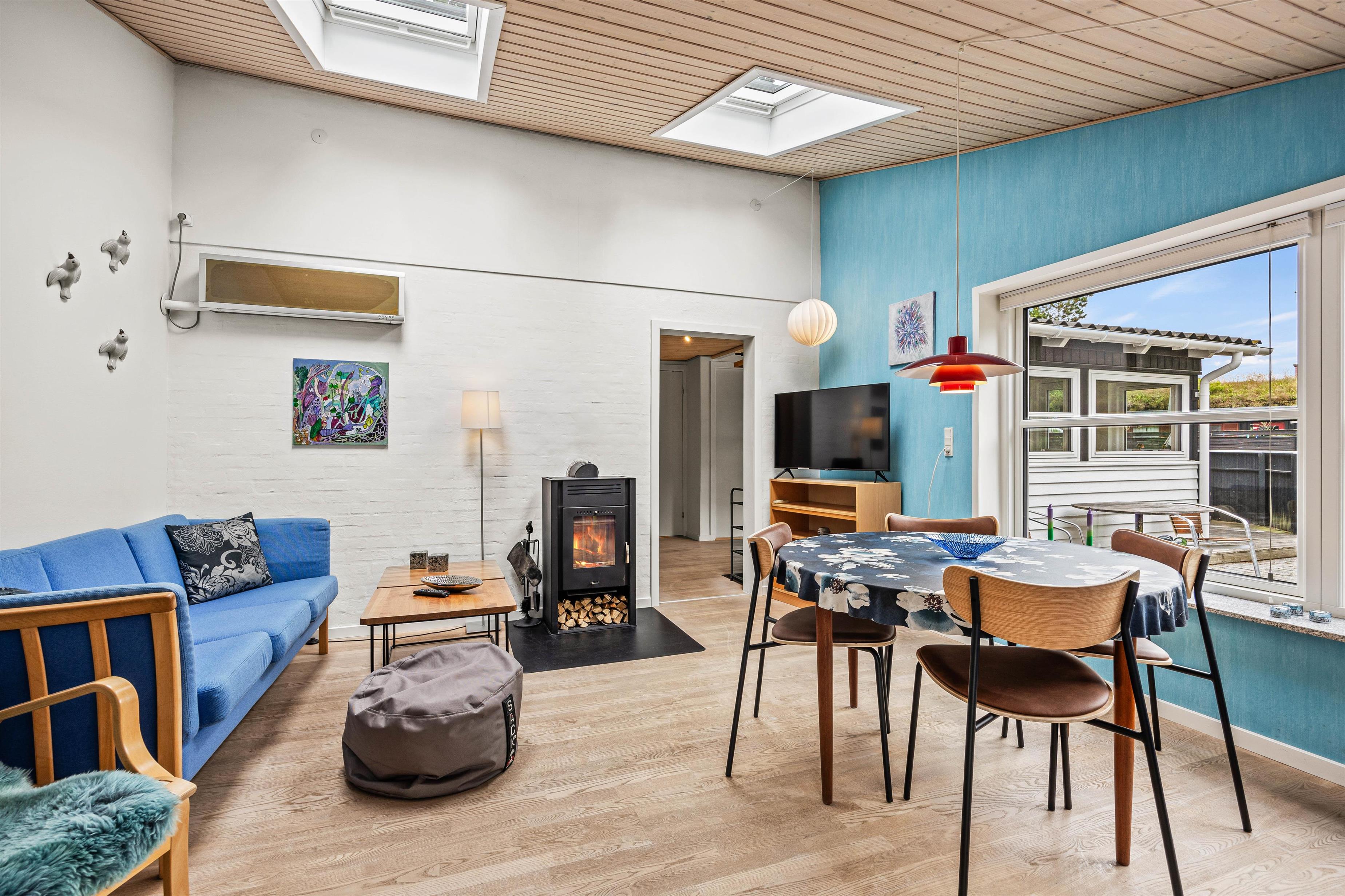 Ovenlysvinduet i stuen sørger for et rigtig fint lysindfald, og derudover er der en brændeovn, som med sine knitrende flammer skaber en rigtig hyggelig atmosfære på de kolde dage. Huset bliver desuden hele året rundt hurtigt opvarmet med den energibesparende varmepumpe.