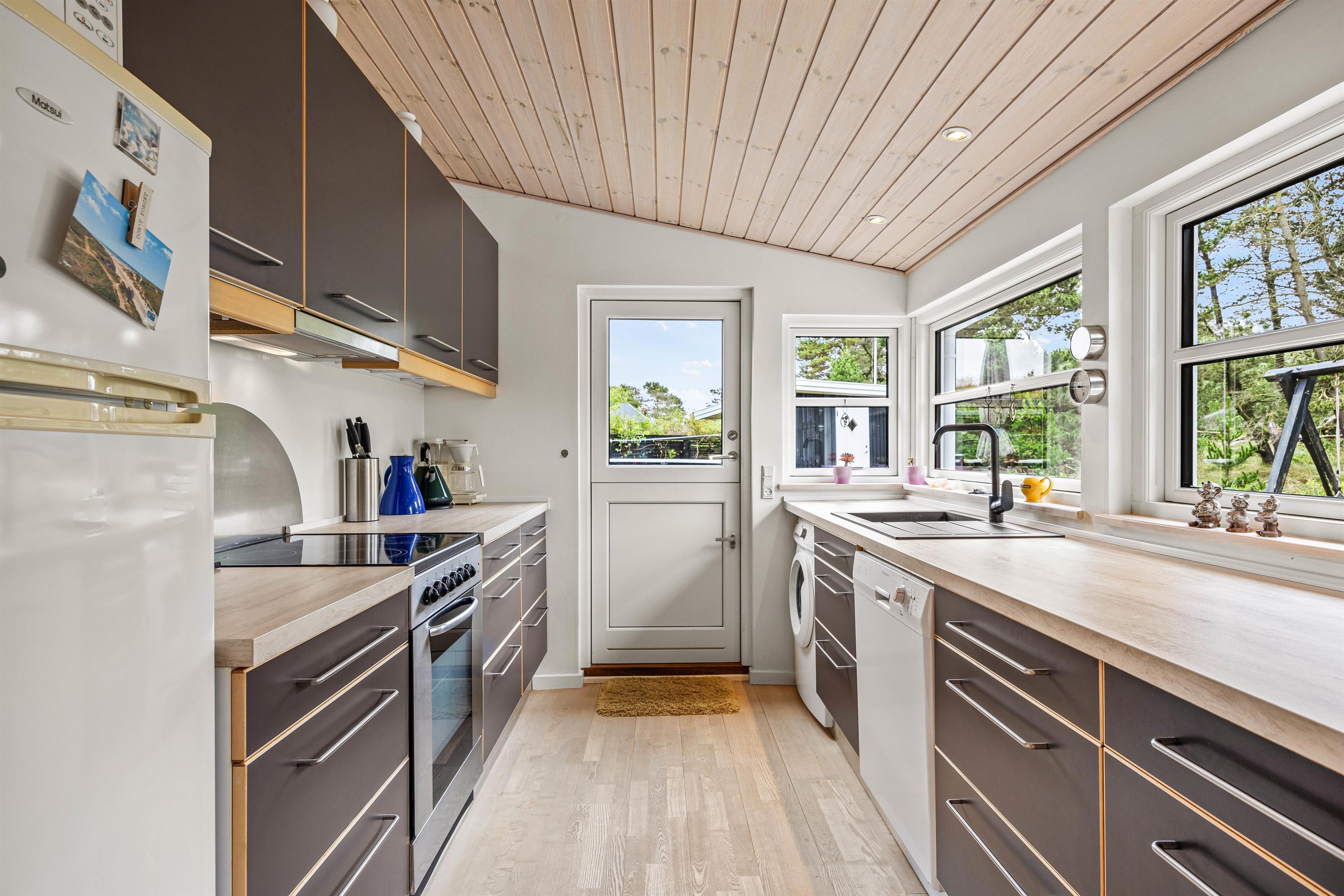 Med ferieadresse på Kratvej 32 i Vejers er rammerne sat for en idyllisk ferie i fredfyldte omgivelser. I det moderne køkken med opvaskemaskine kan hele familien samles om dagens madlavning. Meget praktisk er køkkenet placeret lige ved siden af stuen med integreret spiseafdeling.