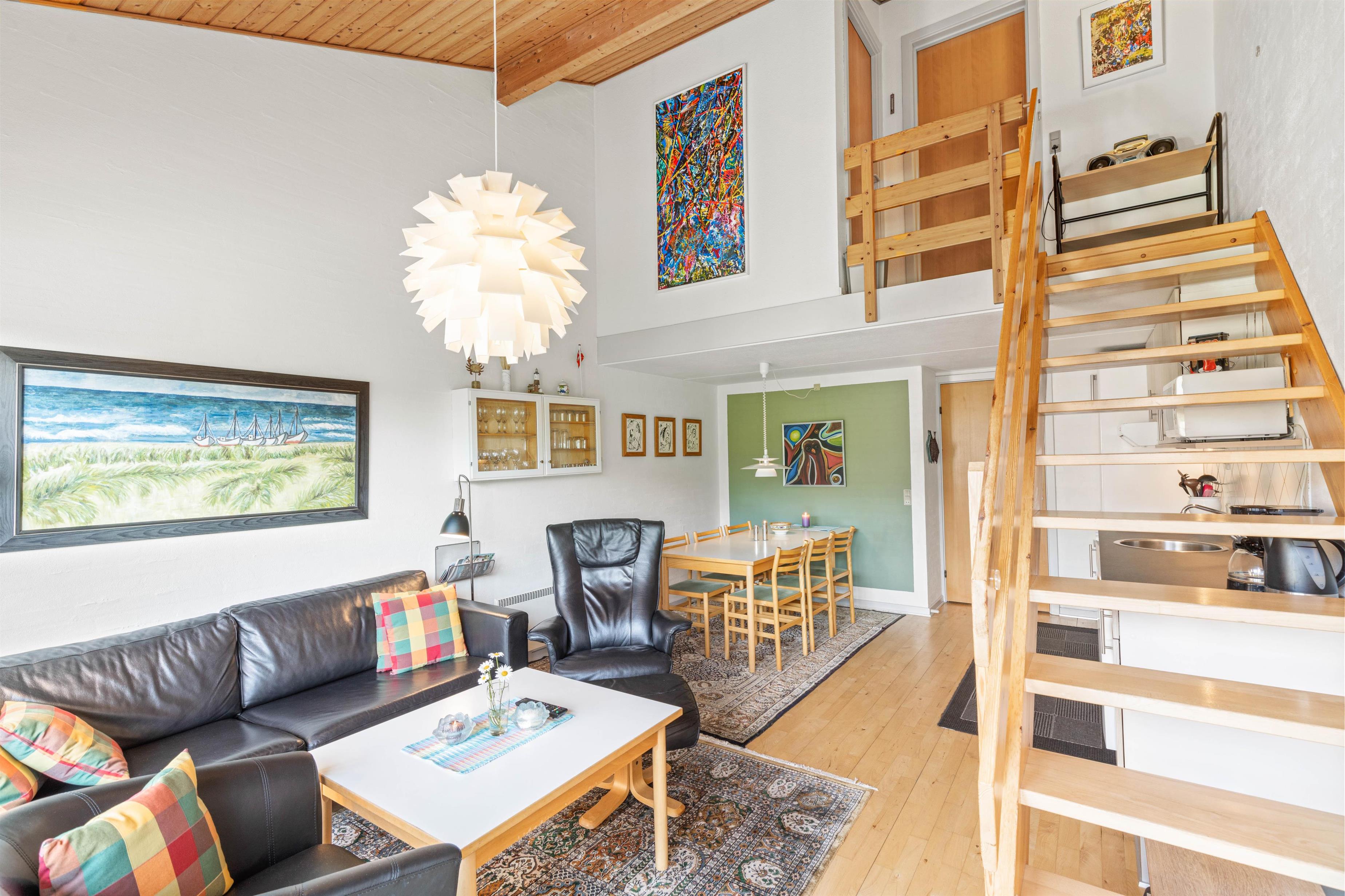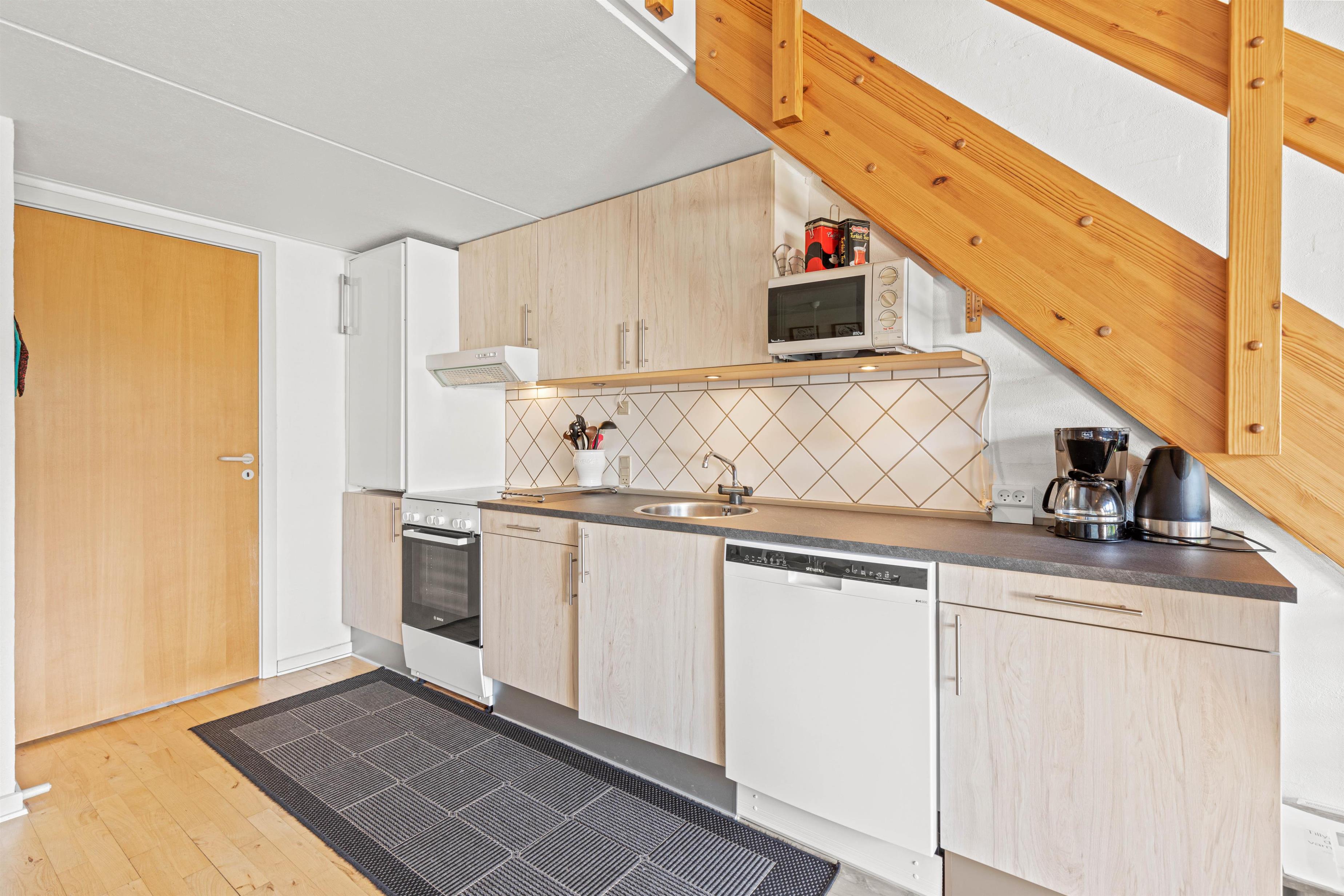 Lejligheden fordeler sig på to etager - ovenpå finder I to soverum, et med enkeltsenge og et med en køjeseng, mens underetagen er delt op i et kombineret køkken- og stuerum, et enkelt soveværelse med dobbeltseng og badeværelset, som er udstyret med gulvvarme.