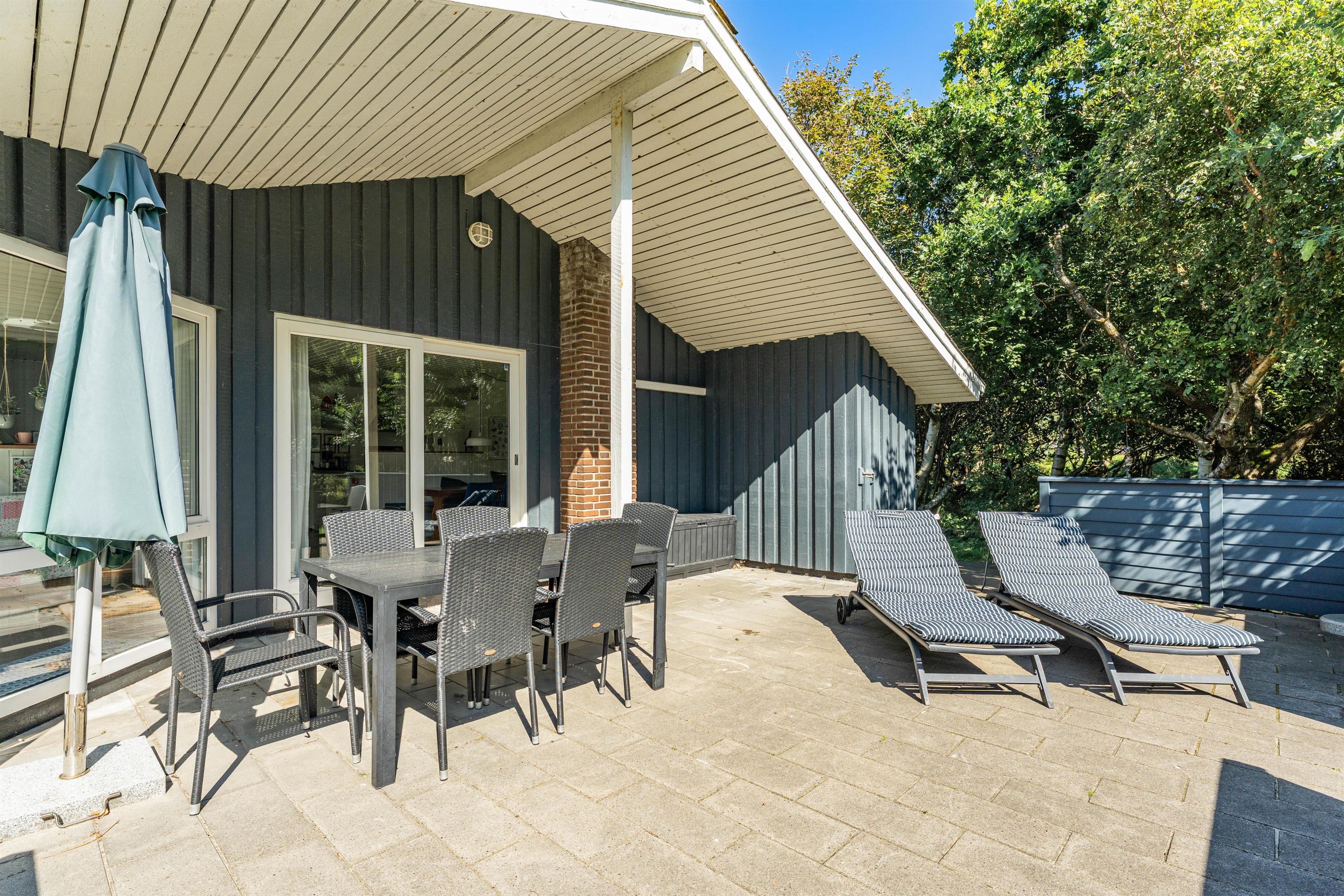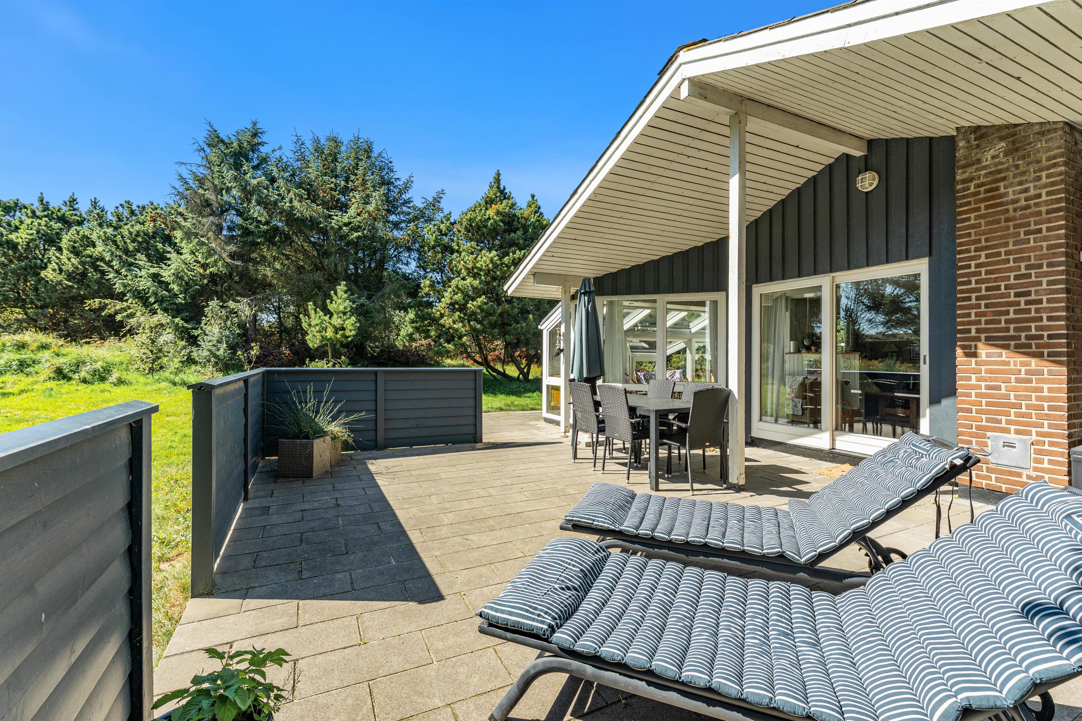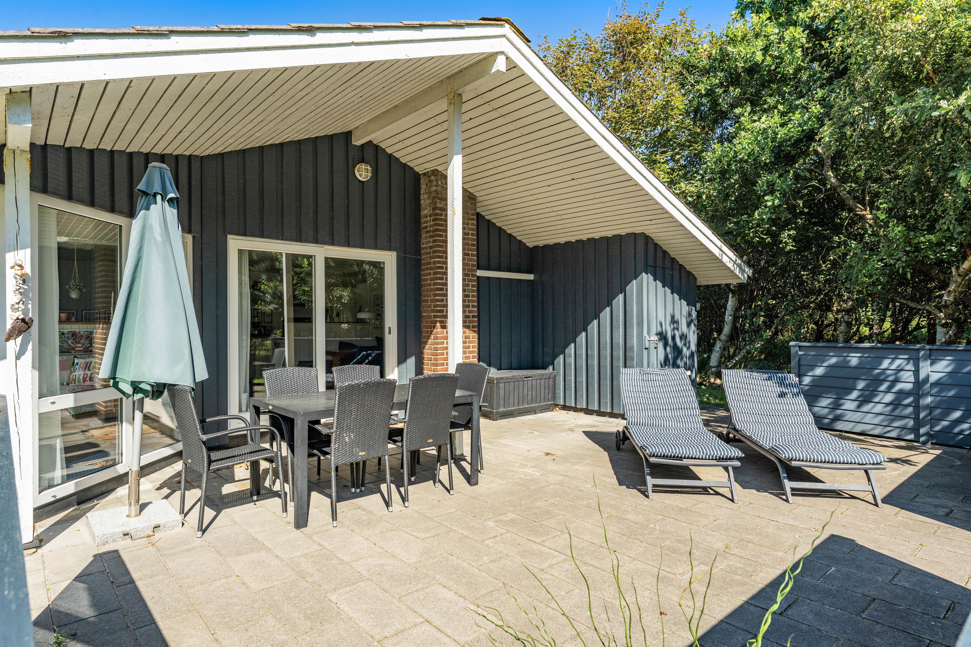 Den 2000 kvm store naturgrund er omgivet af buske og træer, så her kan I føle jer fri. Der er masser af plads til, at børnene kan lege. Imens kan I slappe af på den afskærmede og delvist overdækkede terrasse. De gode havemøbler indbyder til at blive hængende - f.eks. med en kop friskbrygget kaffe og et lækkert stykke kage. Om aftenen kan I tænde op i grillen til en lækker barbeque og afslutte dagen sammen.