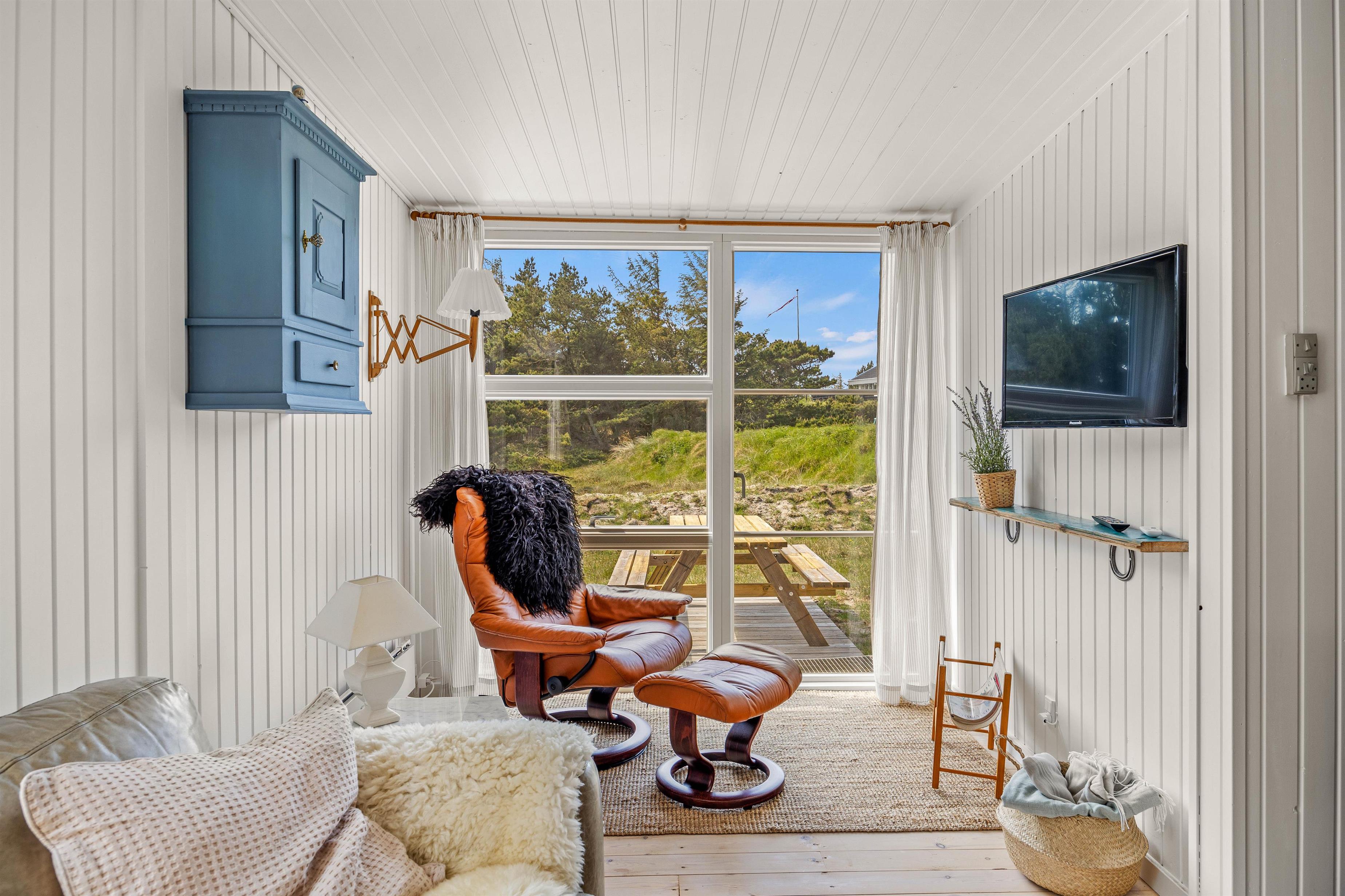 I stuen mødes I af en blanding af lyse farver, puder, brændeovn og fine møbler, der giver rummet en meget hyggelig atmosfære. De store vinduer lukker en masse lys ind i rummet og giver jer en vidunderlig udsigt over lyng og marehalm. Når opvarmningen skal gå lidt hurtigere, kan I tænde den energivenlige varmepumpe og feriehuset vil snart være opvarmet.