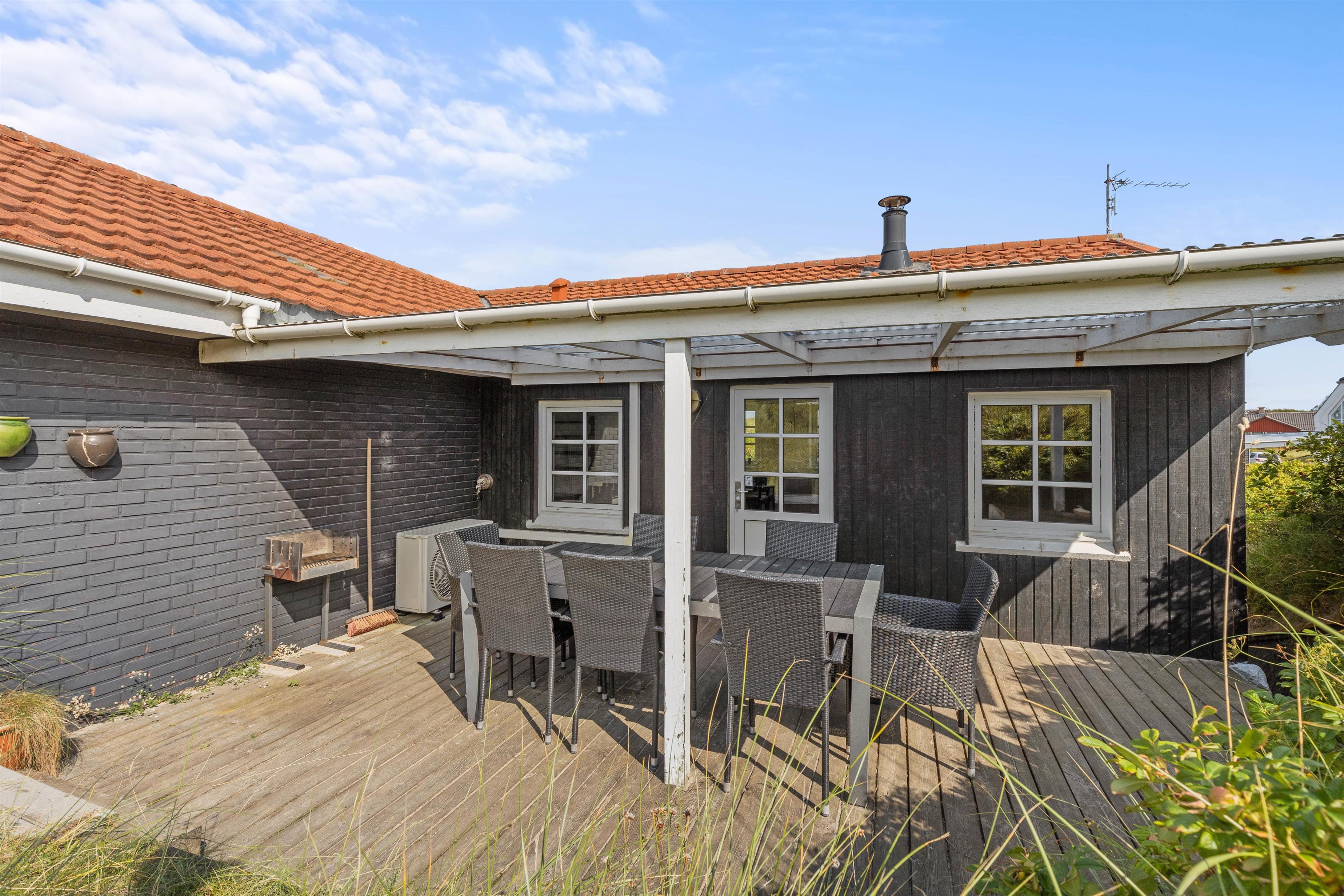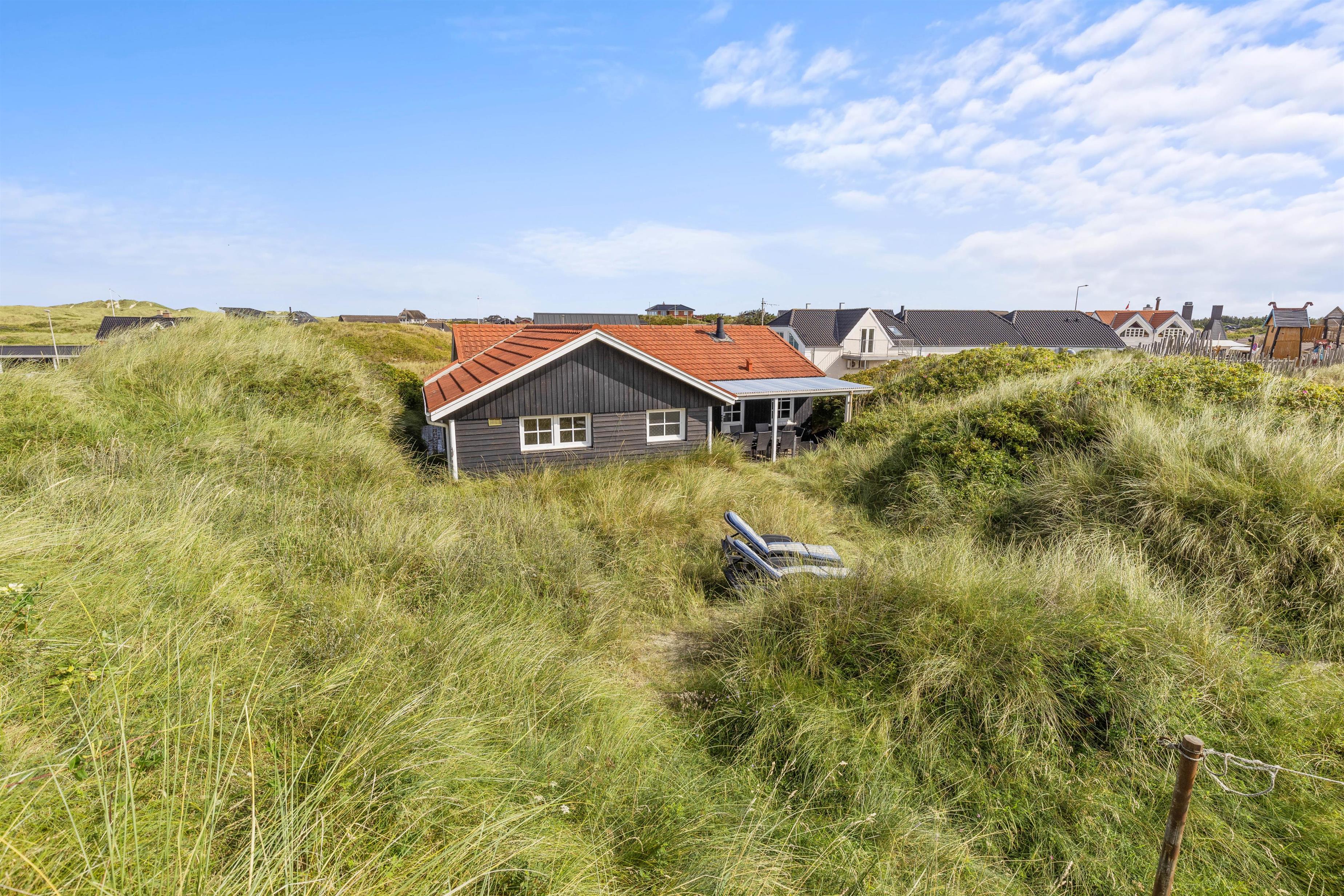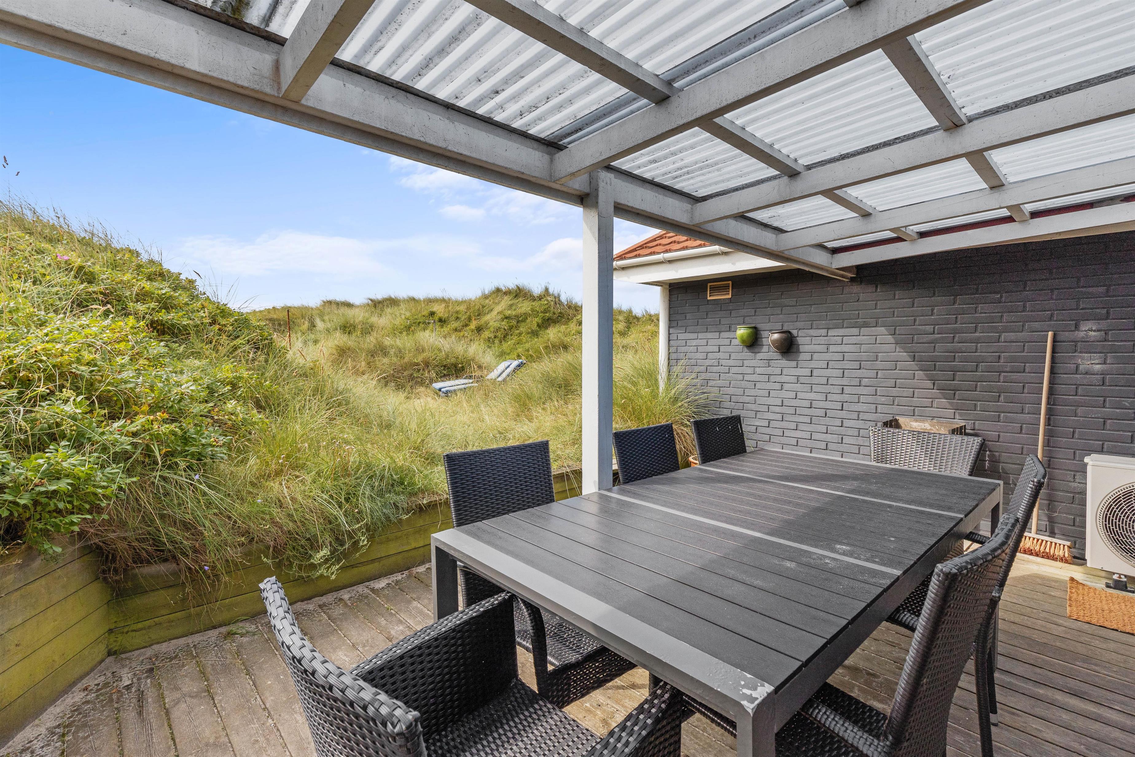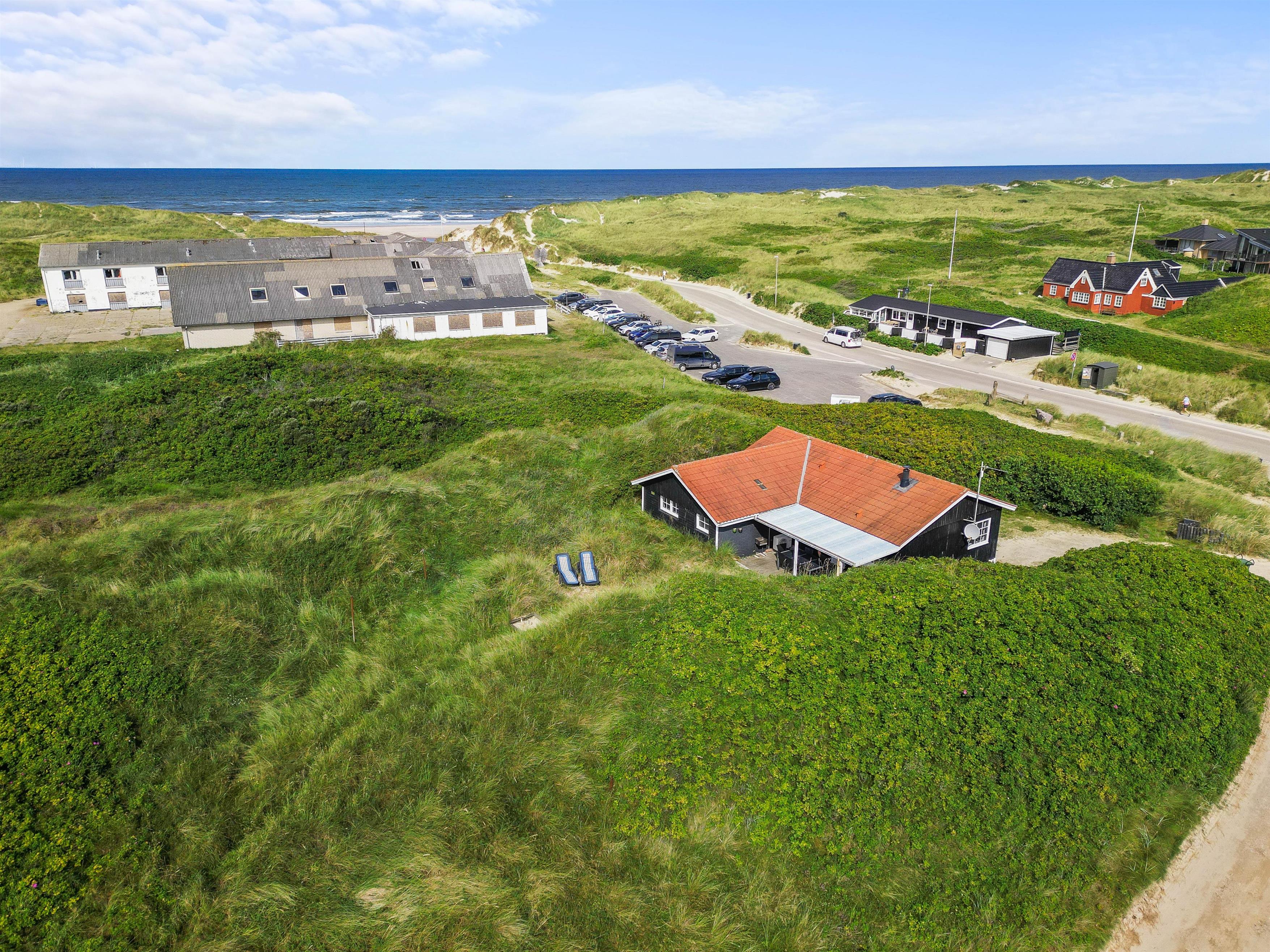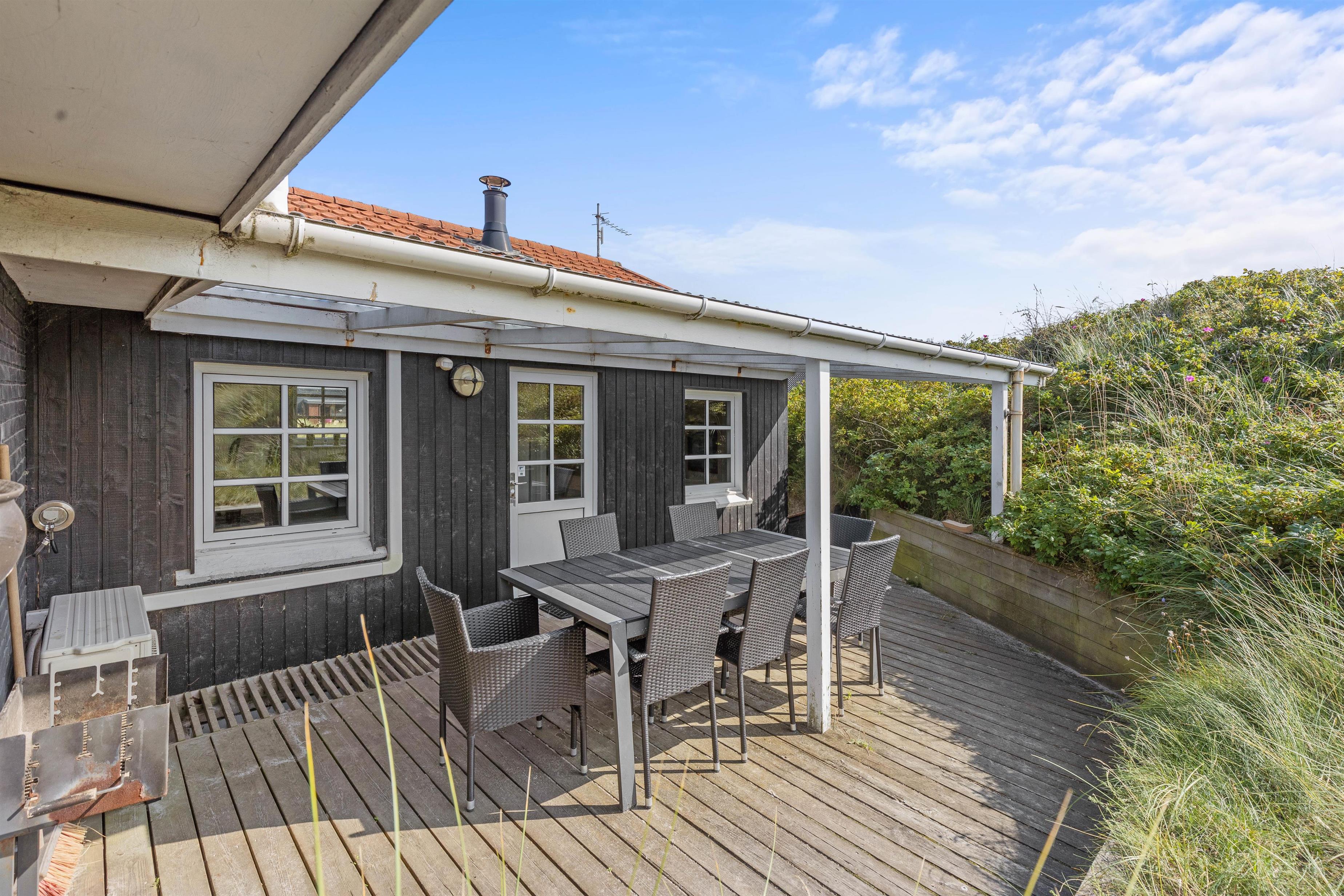 Dette hyggelige sommerhus ligger ind i en klit, kun 100 meter fra vandet. Gå en lang tur på stranden - måske er I så heldige, at I finder rav. Vejers by indbyder med små butikker, restauranter og et galleri.