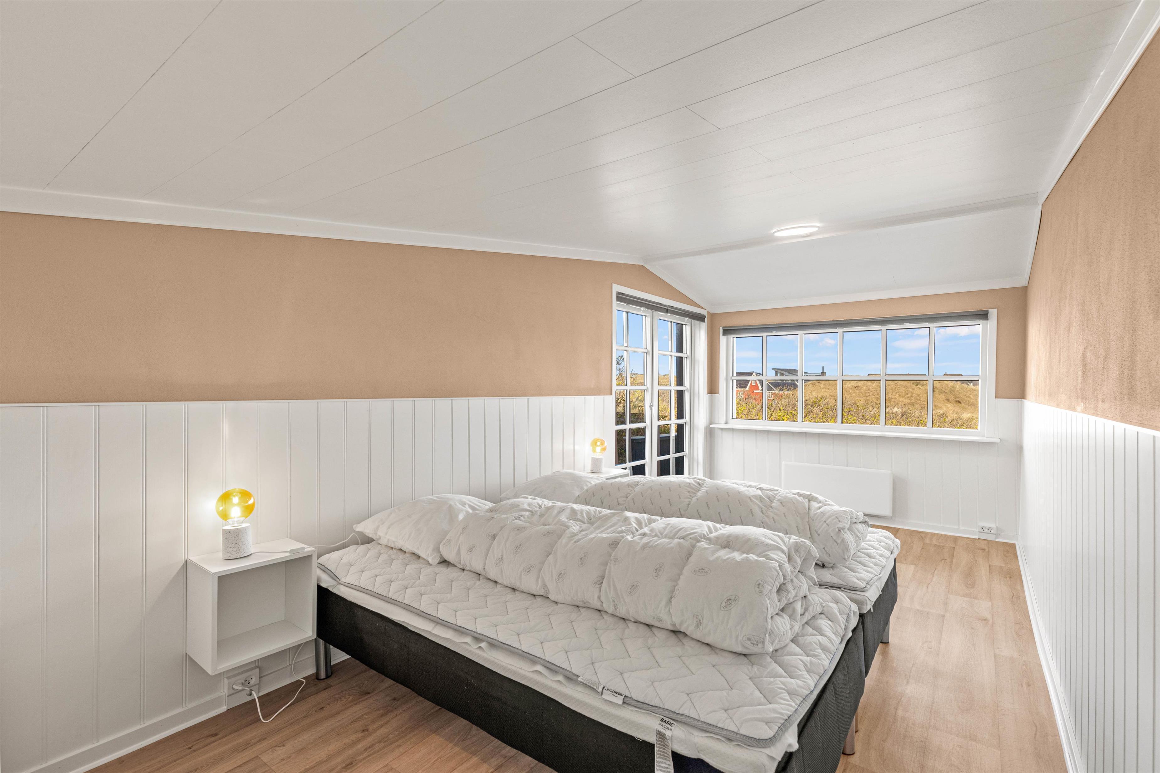 Med 125 m2 fordelt på 2 etager er her masser af plads til feriehygge med familien eller vennerne. De 3 soverum er dejligt store, 2 har dobbeltsenge og i det sidste er der 2 enkeltsenge. En dejlig luksus udgør de 2 badeværelser, som begge har gulvvarme – i det store badeværelse står der både sauna og spa.