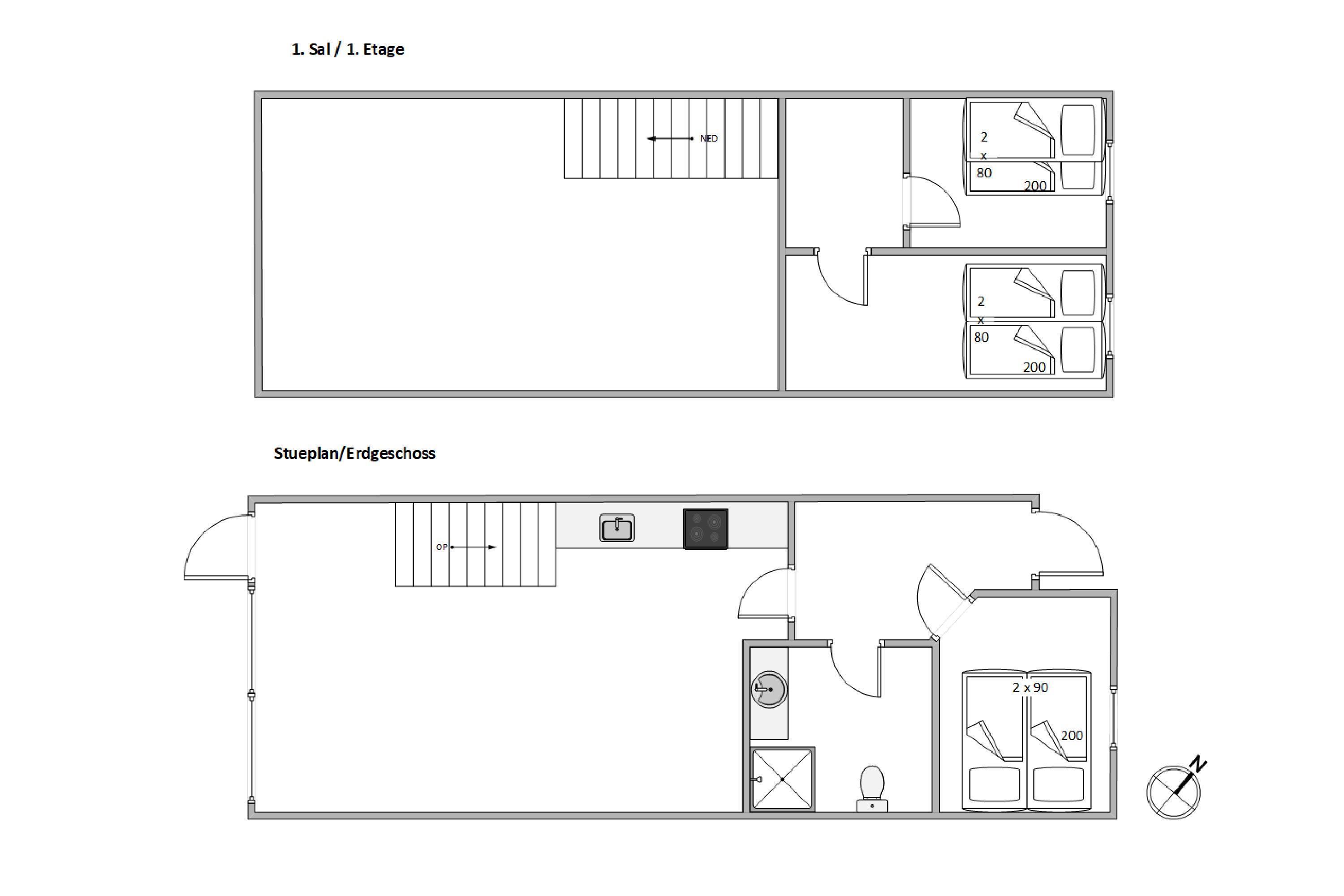 Ferielejligheden er opdelt i to etager, hvor du på første sal finder to enkeltsenge og en køjeseng fordelt på to værelser. I stueetagen bliver du mødt af et åbent og venligt indrettet køkkenalrum, hvor du både har køkken og stue i forlængelse af hinanden. Der er også et fint lyst badeværelse og et soveværelse med en dobbeltseng.