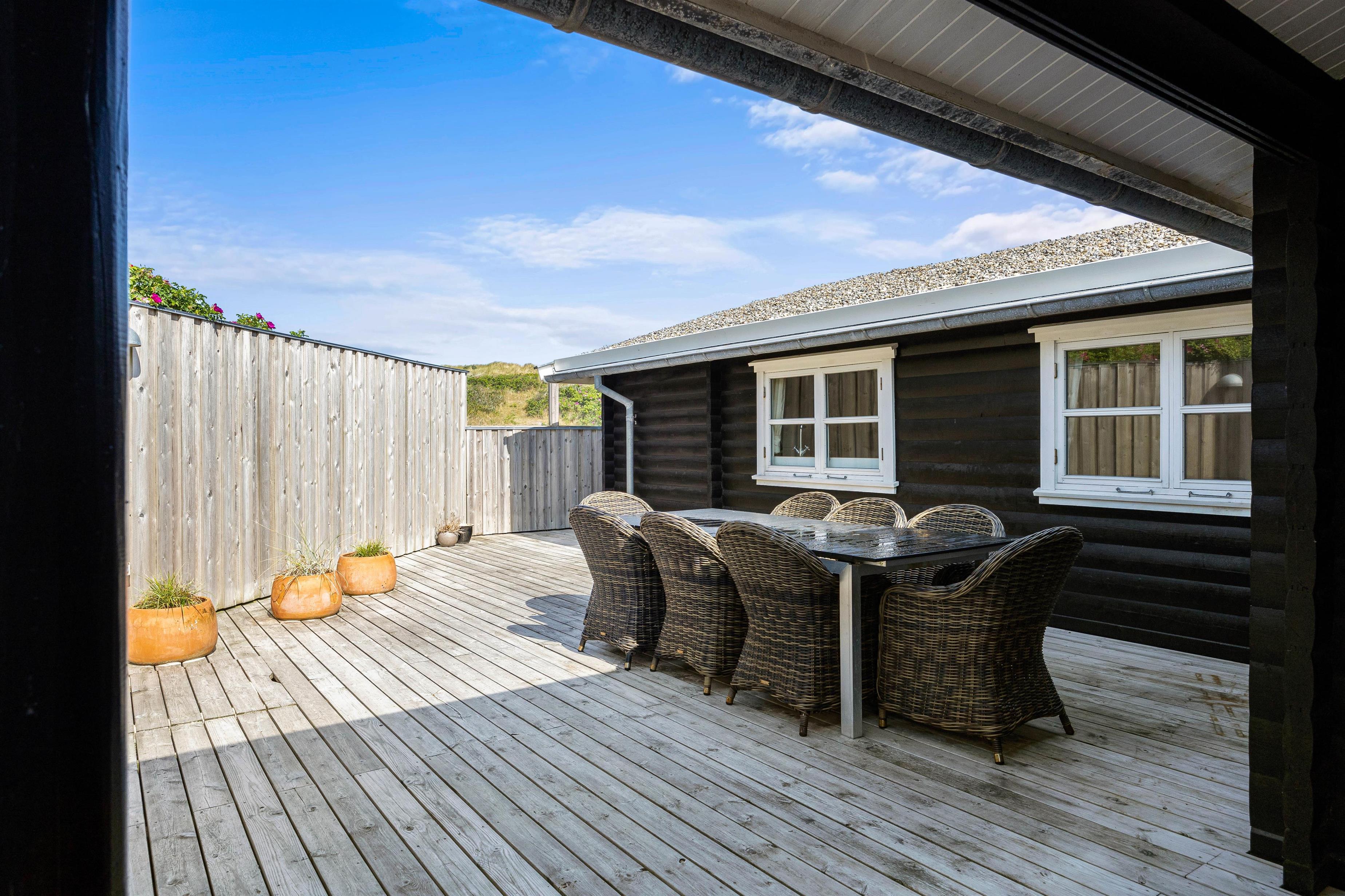 Sommerhuset omsluttet af en skøn træterrasse, som er afskærmet på hele sydsiden. Her venter havemøbler og liggestole på jer, og I kan altid finde et solrigt spot eller, hvis det er nødvendigt, et læ- og skyggefuldt sted at slappe af. Til den perfekte sommeraften hører sig grillmad til – tilbered et lækkert måltid på sommerhusets gasgrill og sæt jer til rette om bordet med en kold cola eller et godt glas rosé.