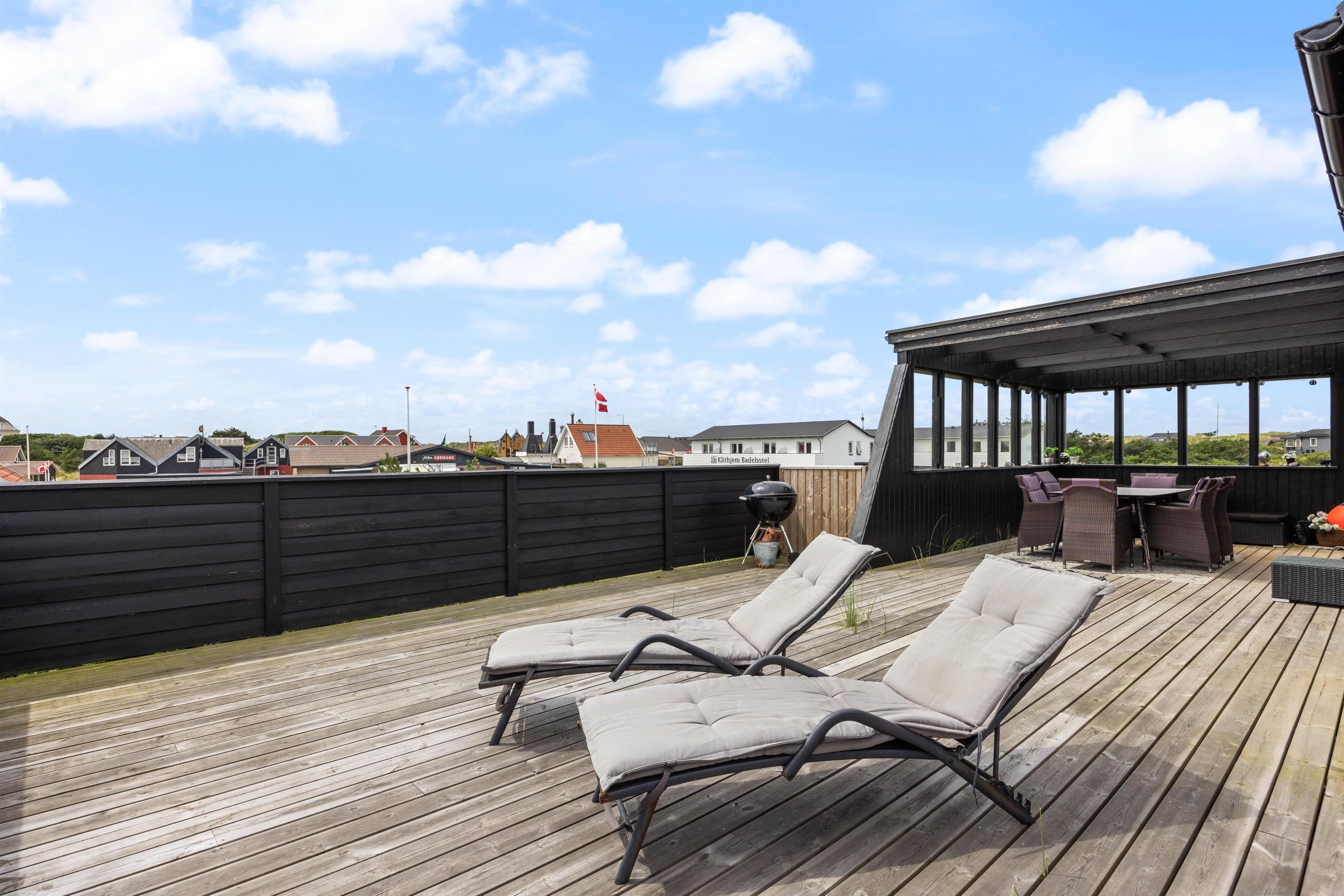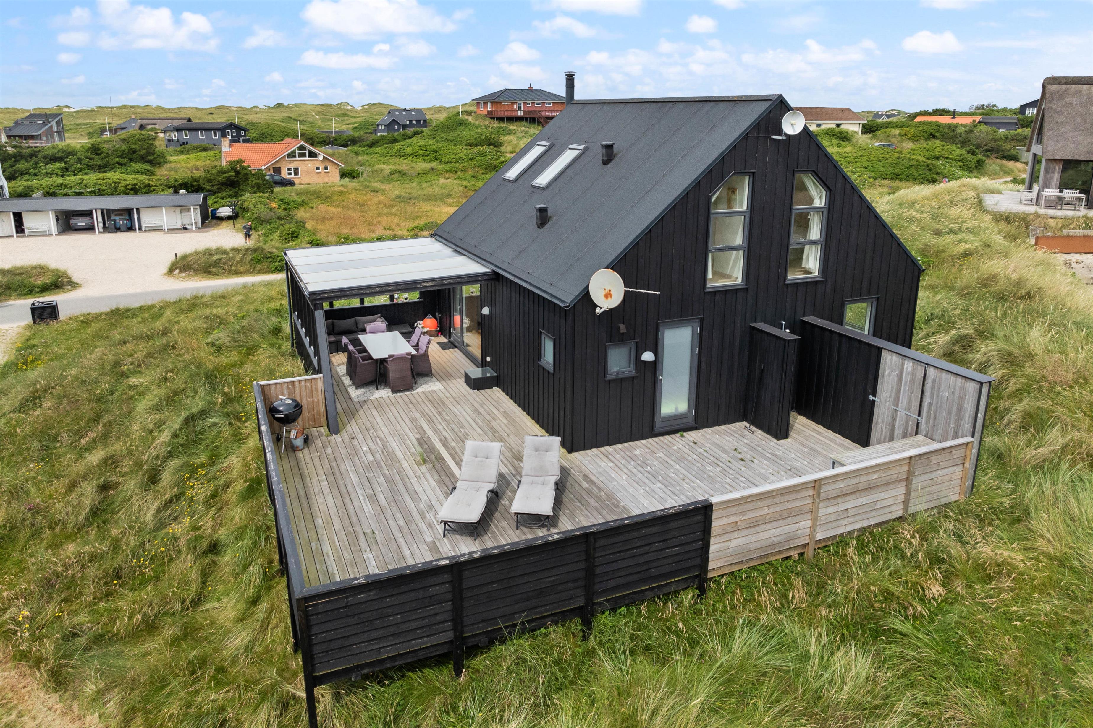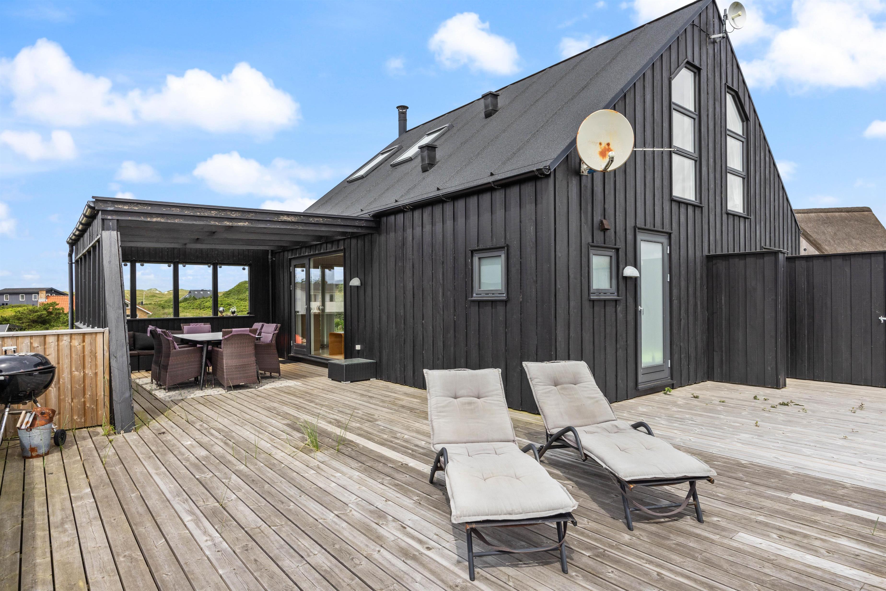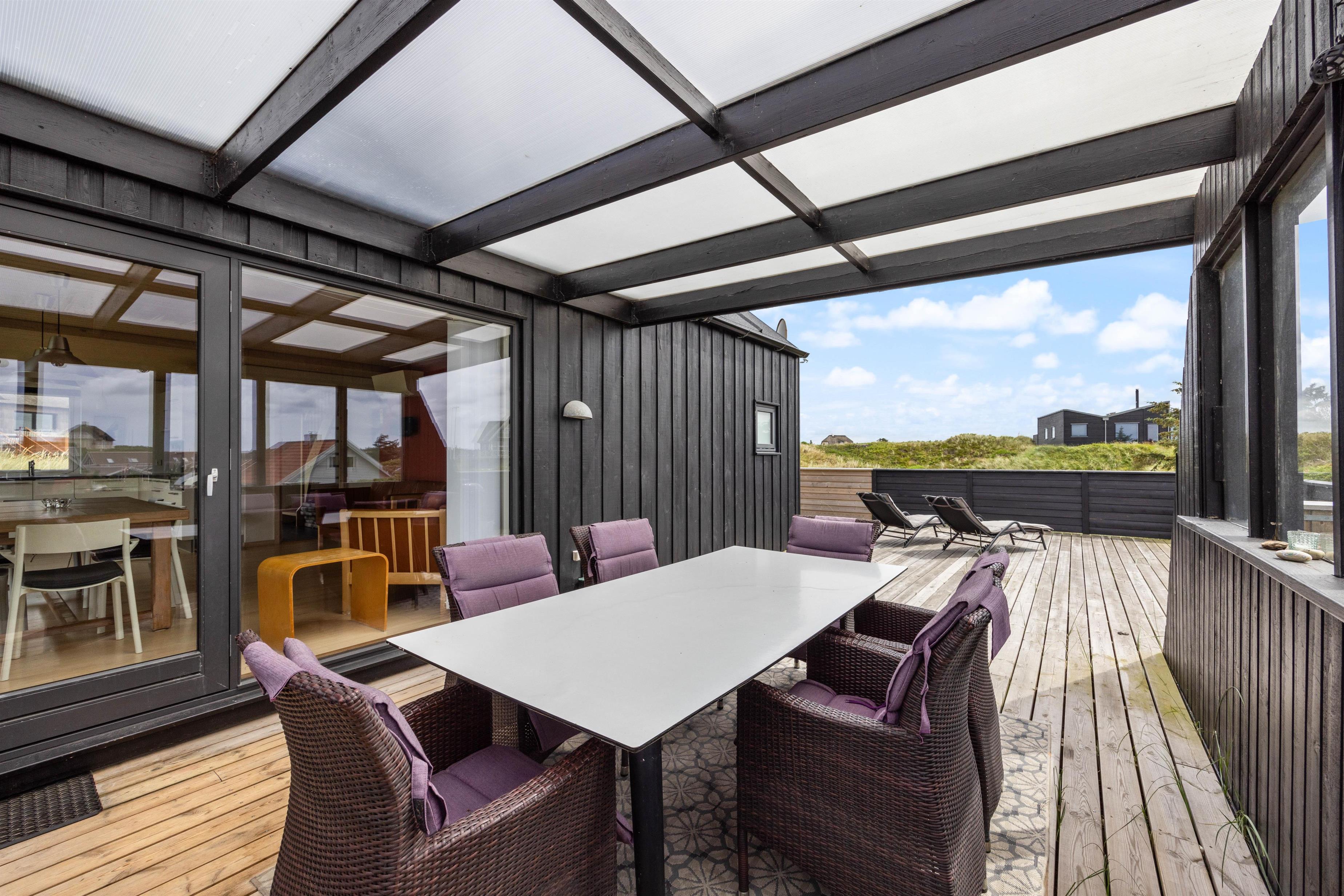 Også udenfor kan I nyde den fortryllende udsigt. Her venter havemøbler og liggestolene på jer. Slap af i solen, spil med familien og spis en lækker frokost i skyggen under terrassens overdækning. Her kan I sidde i læ for vinden. Dæk bordet, mens familiens grillmester får lov at trylle på grillen. Nyd maden sammen med et køligt glas rosé efterfulgt af solnedgangen på stranden – det er ægte sommerhygge.