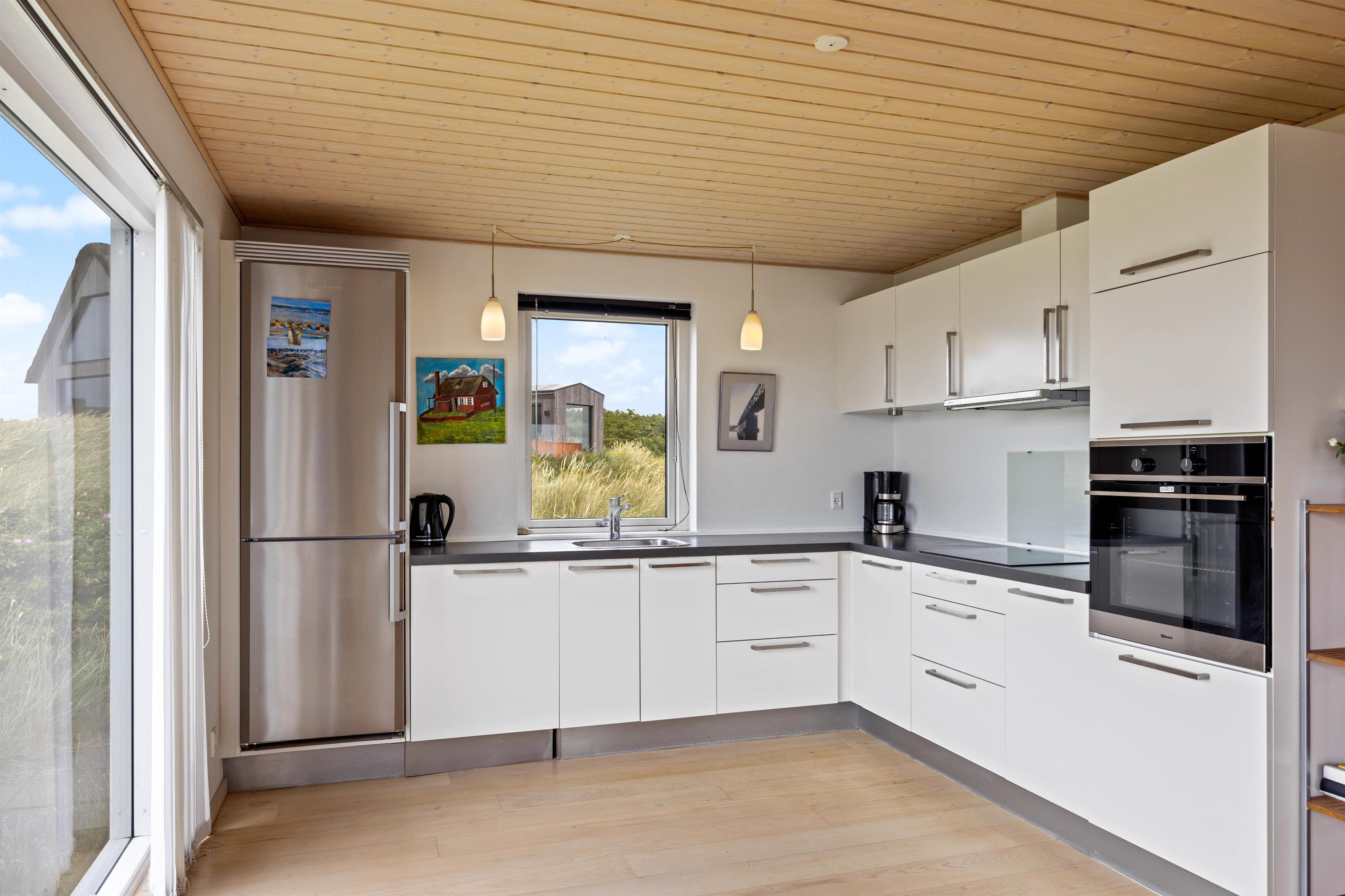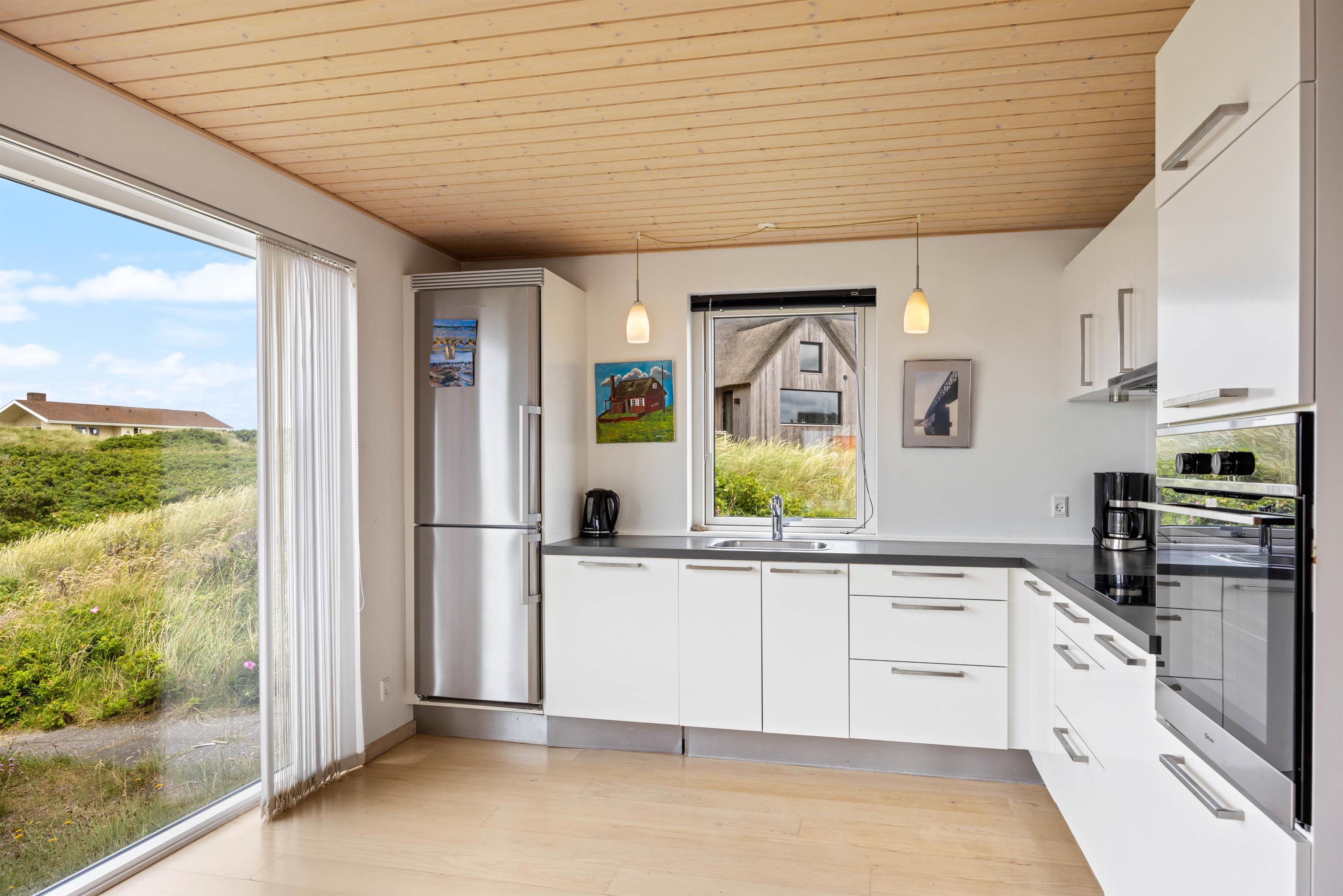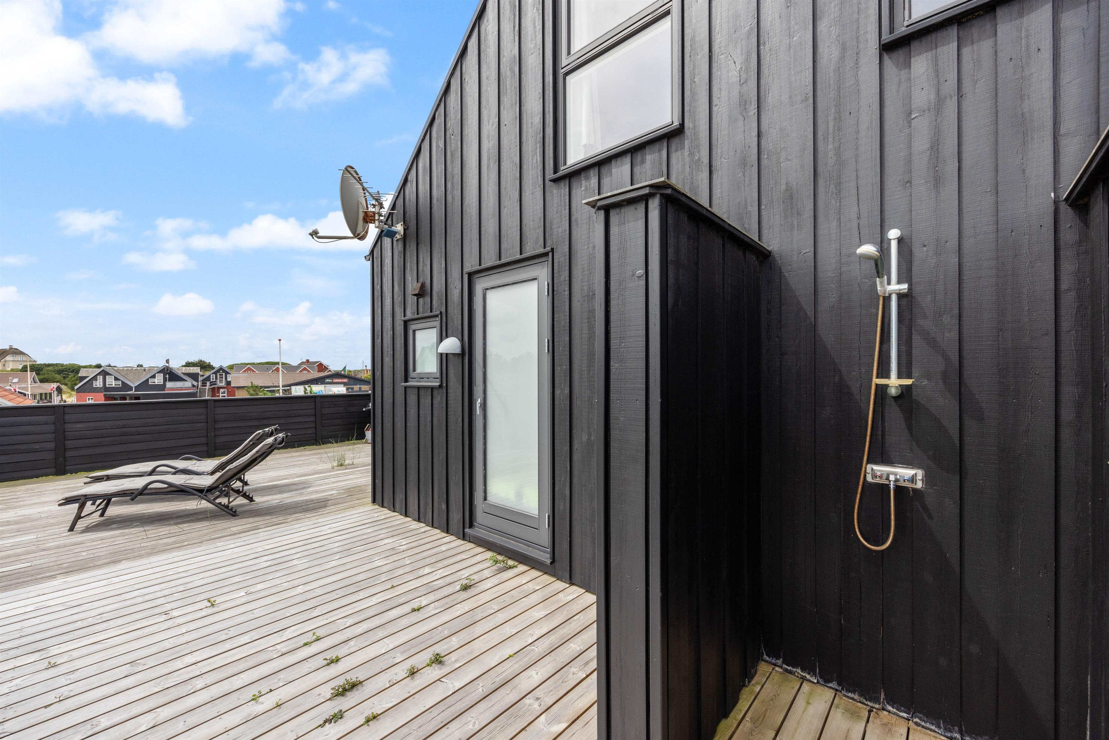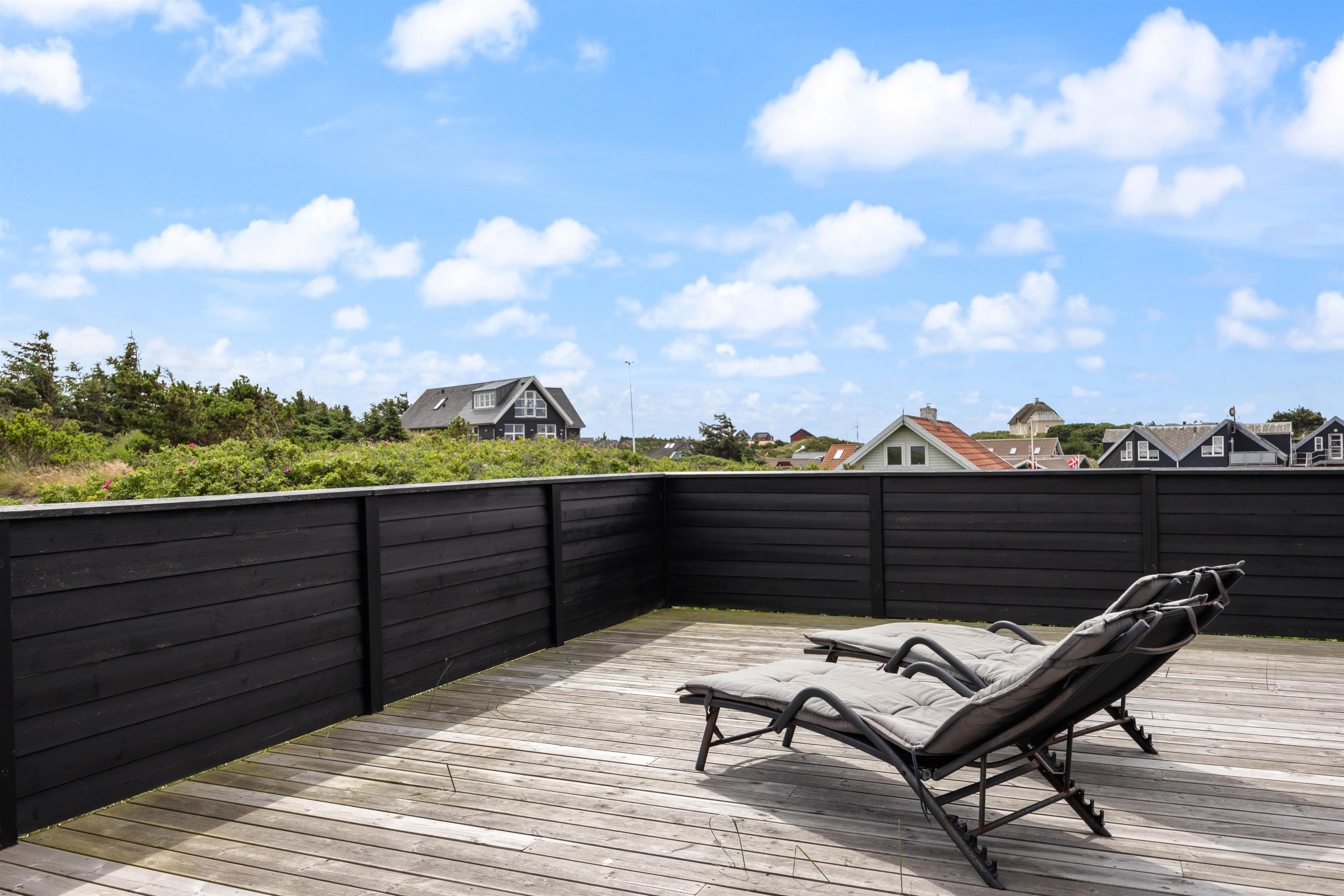Også udenfor kan I nyde den fortryllende udsigt. Her venter havemøbler og liggestolene på jer. Slap af i solen, spil med familien og spis en lækker frokost i skyggen under terrassens overdækning. Her kan I sidde i læ for vinden. Dæk bordet, mens familiens grillmester får lov at trylle på grillen. Nyd maden sammen med et køligt glas rosé efterfulgt af solnedgangen på stranden – det er ægte sommerhygge.