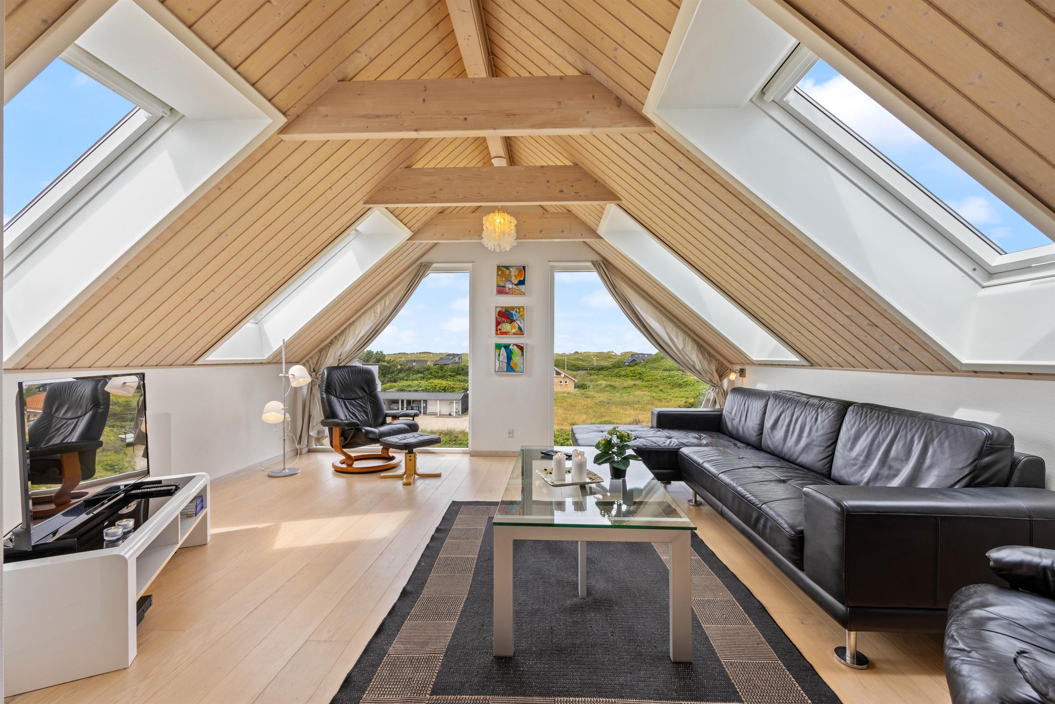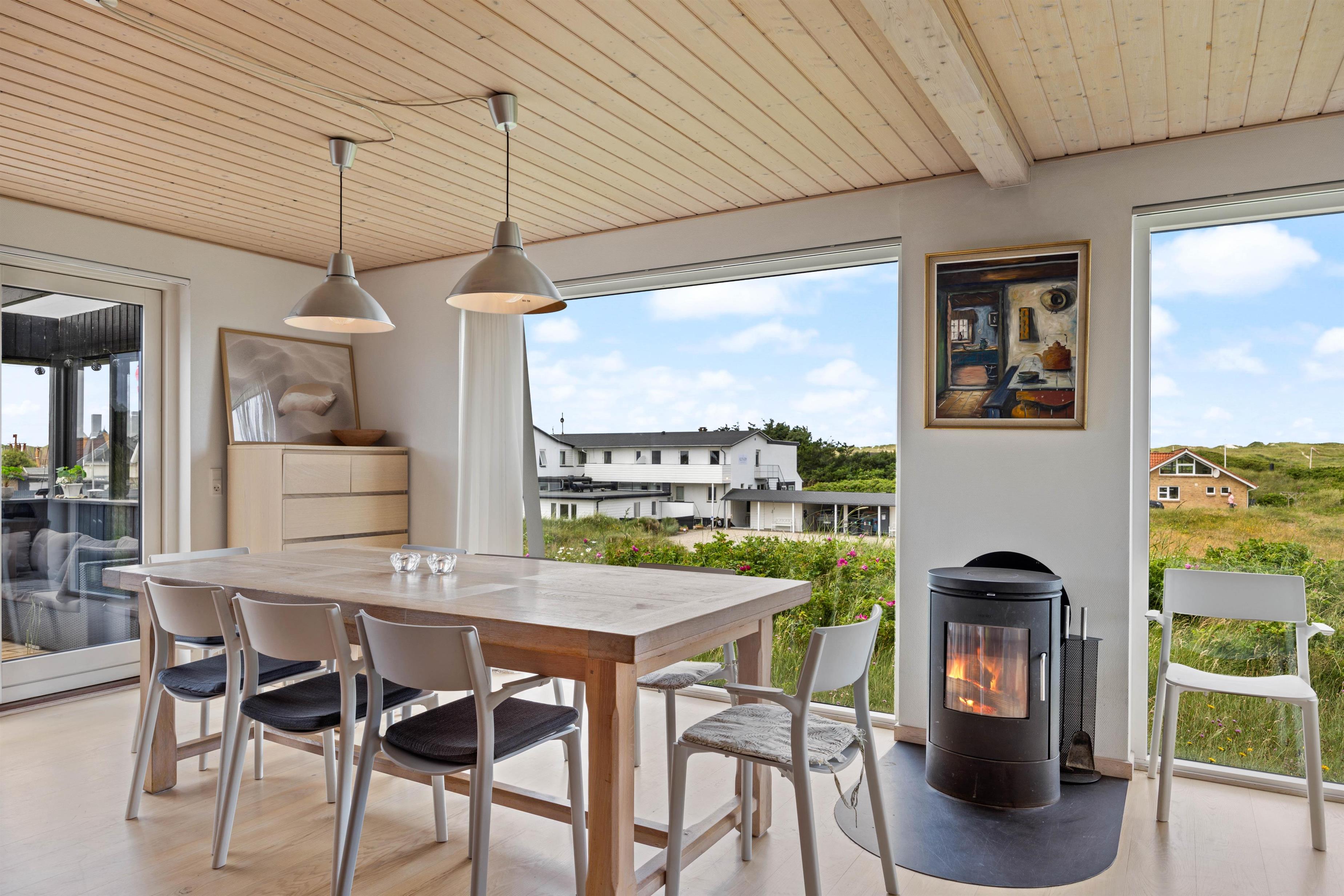 Med plads til 6 personer og 119 smagfuldt indrettede kvadratmeter, er her god plads til familien. Her er et skønt opholdsrum, hvor den smukke udsigt imponerer. Her er plads til fællesmadlavning i det funktionelle køkken, ferielæsning i sofaen og brændeovnen sørger for den rette feriestemning. På første salen finder I feriehusets stue, hvor I kan samles til hyggelige filmaftner og meget mere – også herfra er den fineste udsigt udover området.