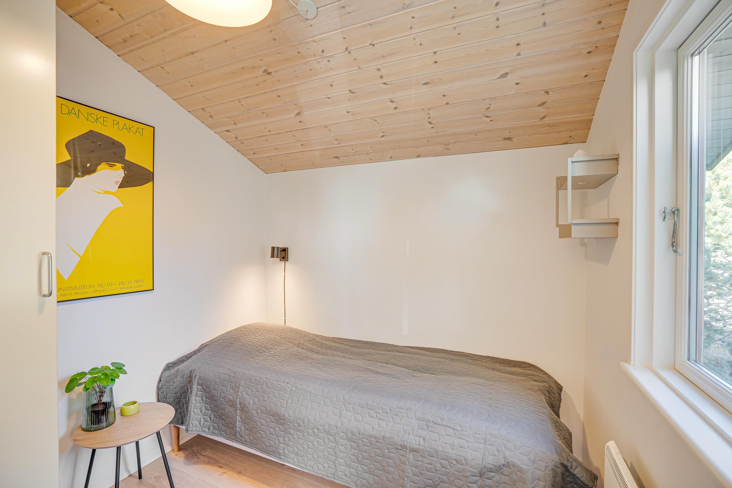 Det store samlingspunkt i sommerhuset er alrummet, der forener køkken, stue og spiseplads. Her kan I nyde hinandens selskab, selv når nogle står for madlavningen i køkkenet, og andre ser film i stuen – alt imens sørger brændeovnen for at sprede varme og hygge. Den lyse indretning i rummet bliver på bedste vis komplementeret af det skønne lysindfald, der tilsammen skaber en fantastisk ferieatmosfære.