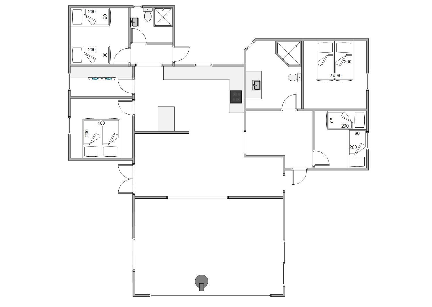 Det 129 kvadratmeter store sommerhus har en indretning, der er særdeles praktisk, hvis I er 2 familier på ferie sammen, da hver familie her kan få hver sin afdeling. I den ene ende af sommerhuset finder I 2 soveværelser og 1 badeværelse, og i den anden ende af sommerhuset finder I ligeledes 2 soveværelser og 1 badeværelse.