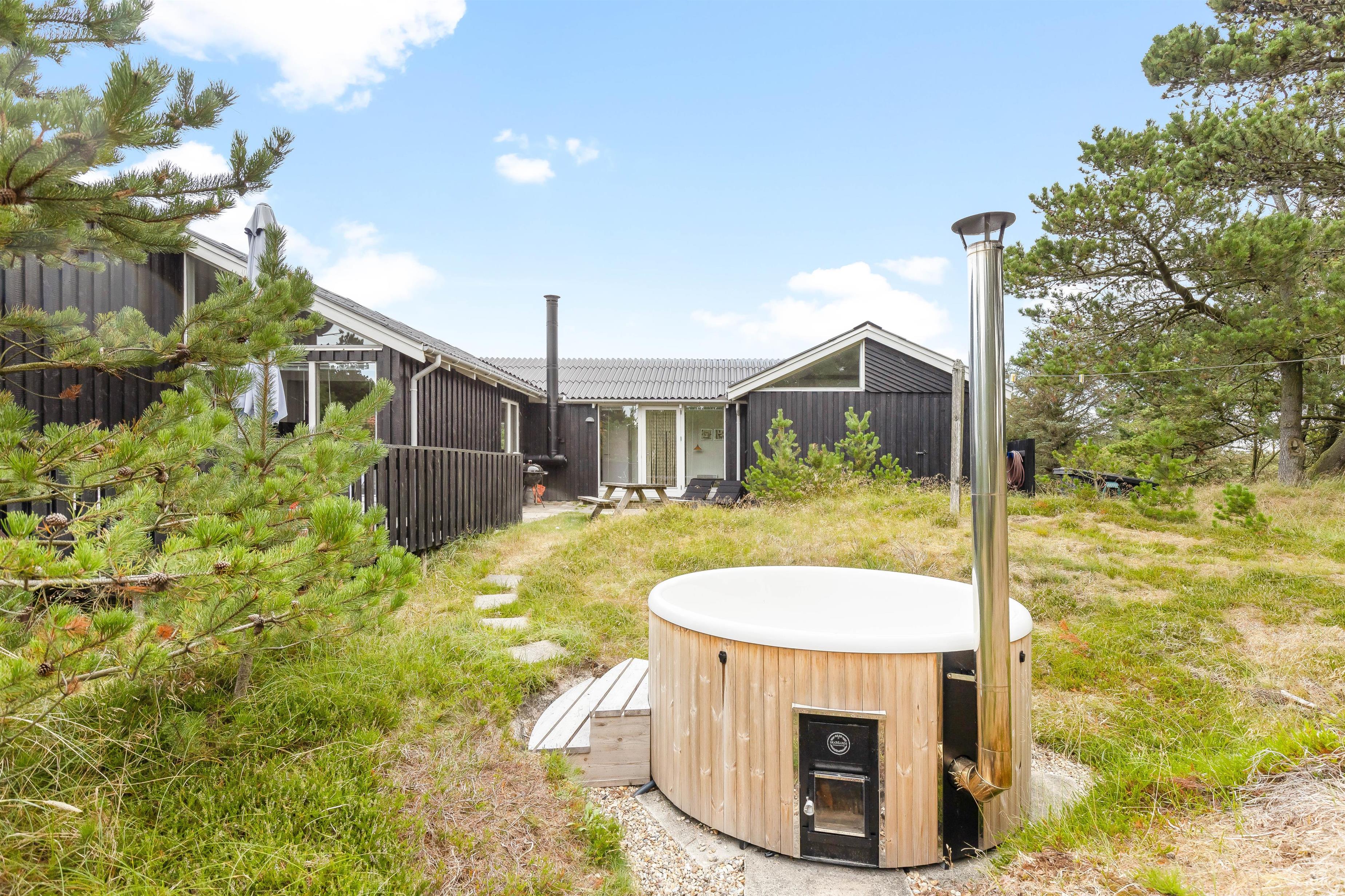 Dette skønne træhus ligger i midt i Vejers' smukke natur, kun 10 minutter fra den brede sandstrand. Og det er ikke det eneste highlight; i huset finder I jeres egen lille wellnessoase med sauna og spabad, og en hyggelig brændeovn i stuen.
