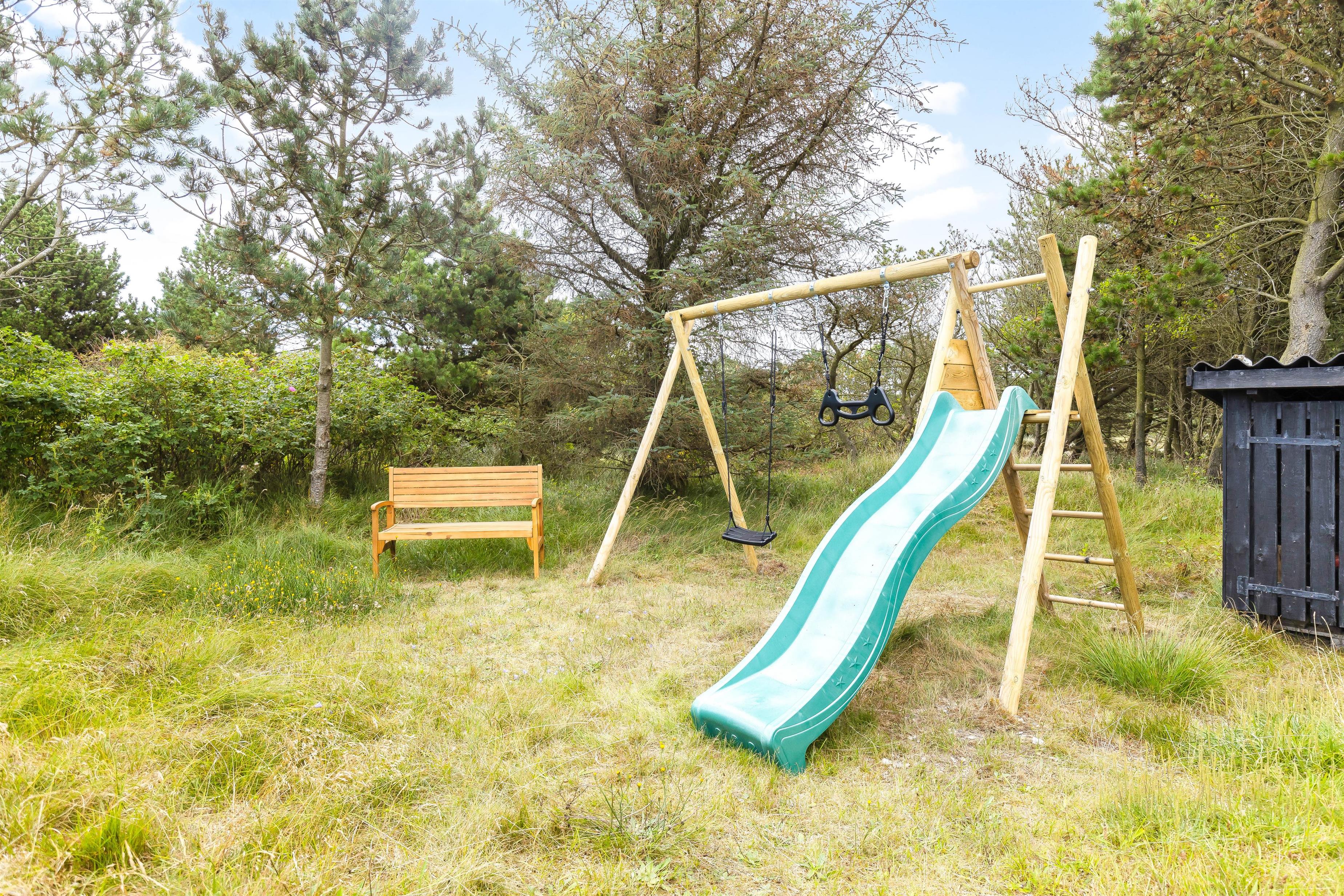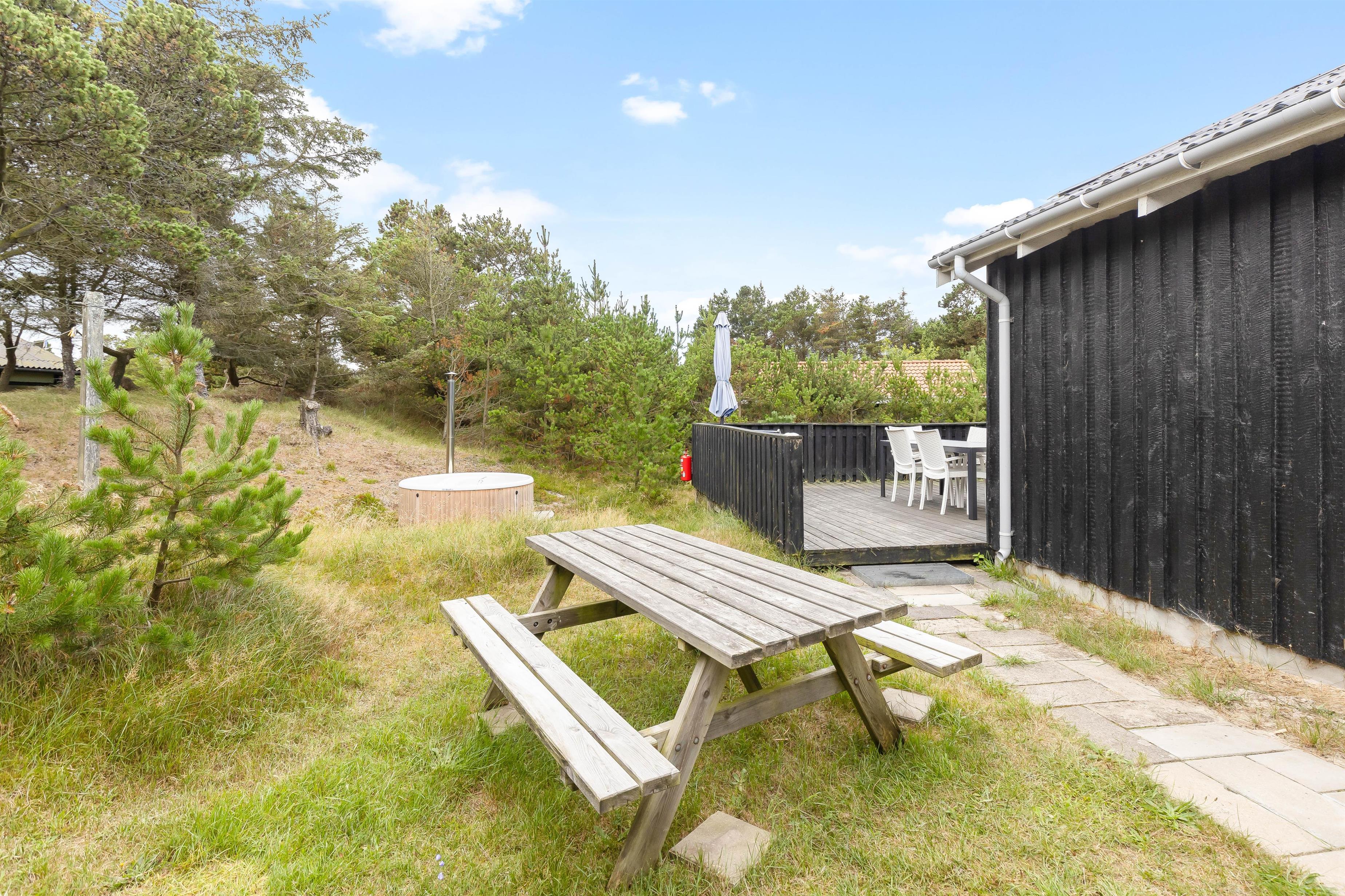 På de varme solskinsdage er det tid til at rykke ud på den store træterrasse, hvor havemøbler, liggestole og grill står klar til jer fra feriens start. Her kan I nyde solen helt uforstyrret på den naturskønne grund, der er omgivet af grantræer og køle af i udebruseren, der er tilgængelig fra april til november. Til glæde for de mindste feriegæster er der sørget for en gyngestativ.