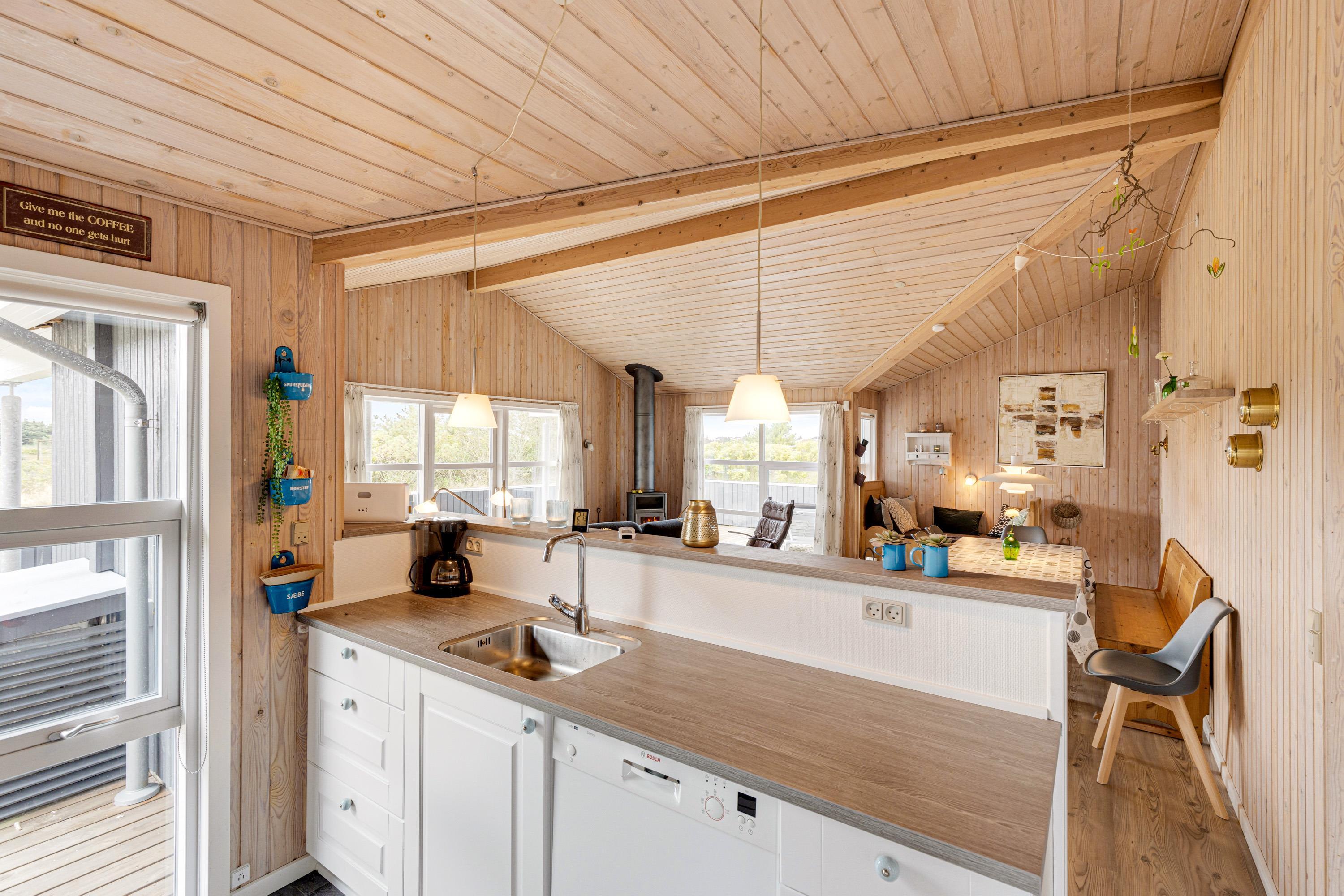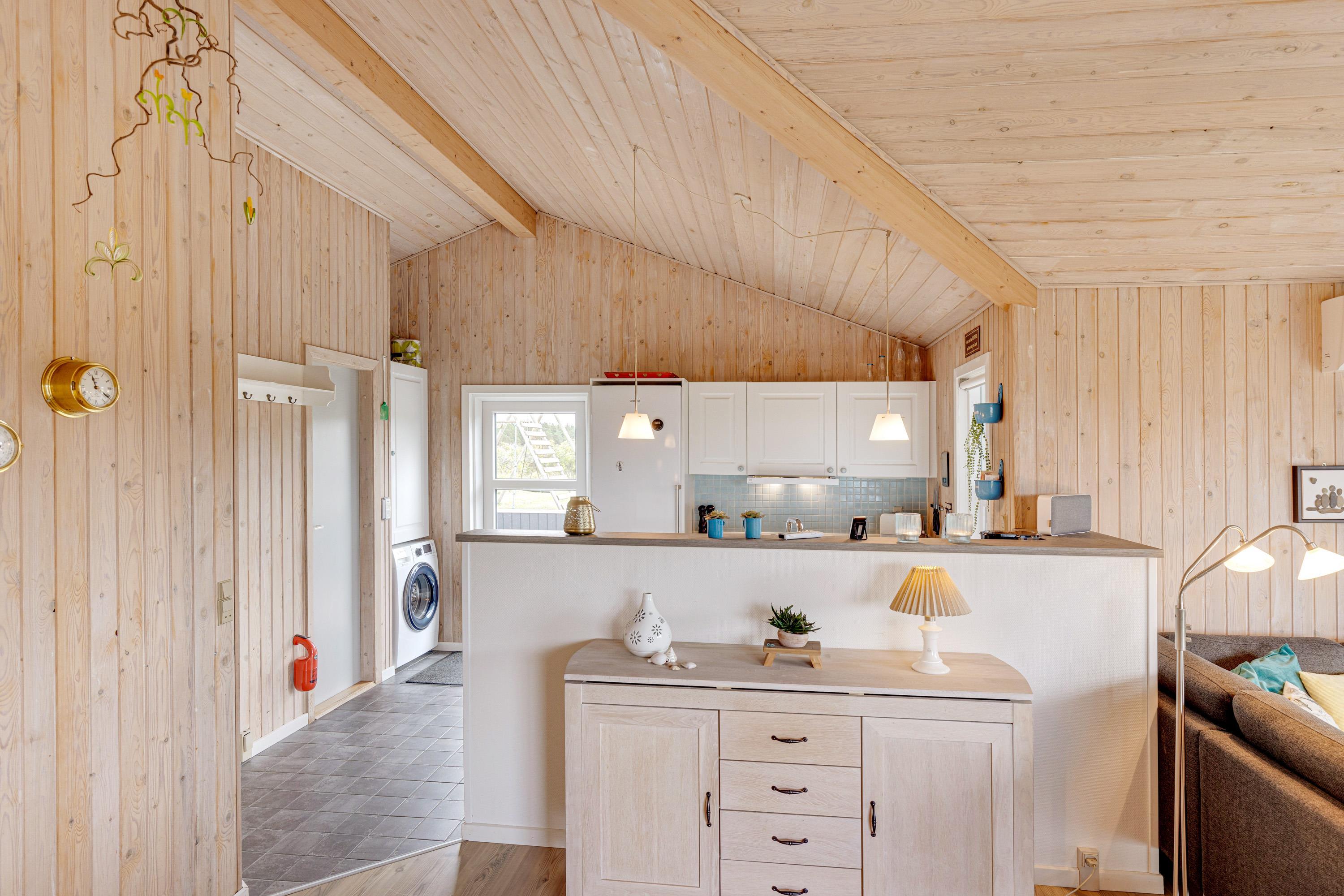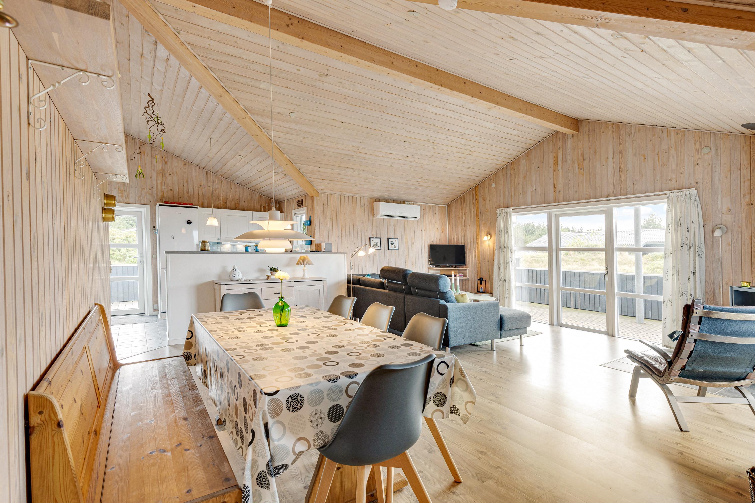 Allerede når I træder inden for i sommerhuset på Jafdalvej 79 i Vejers Strand, vil I blive mødt af den hyggelige og indbydende indretning. De lyse trævægge og -lofter samt det skønne lysindfald skaber tilsammen en dejlig ferieatmosfære for jer at holde ferie i.