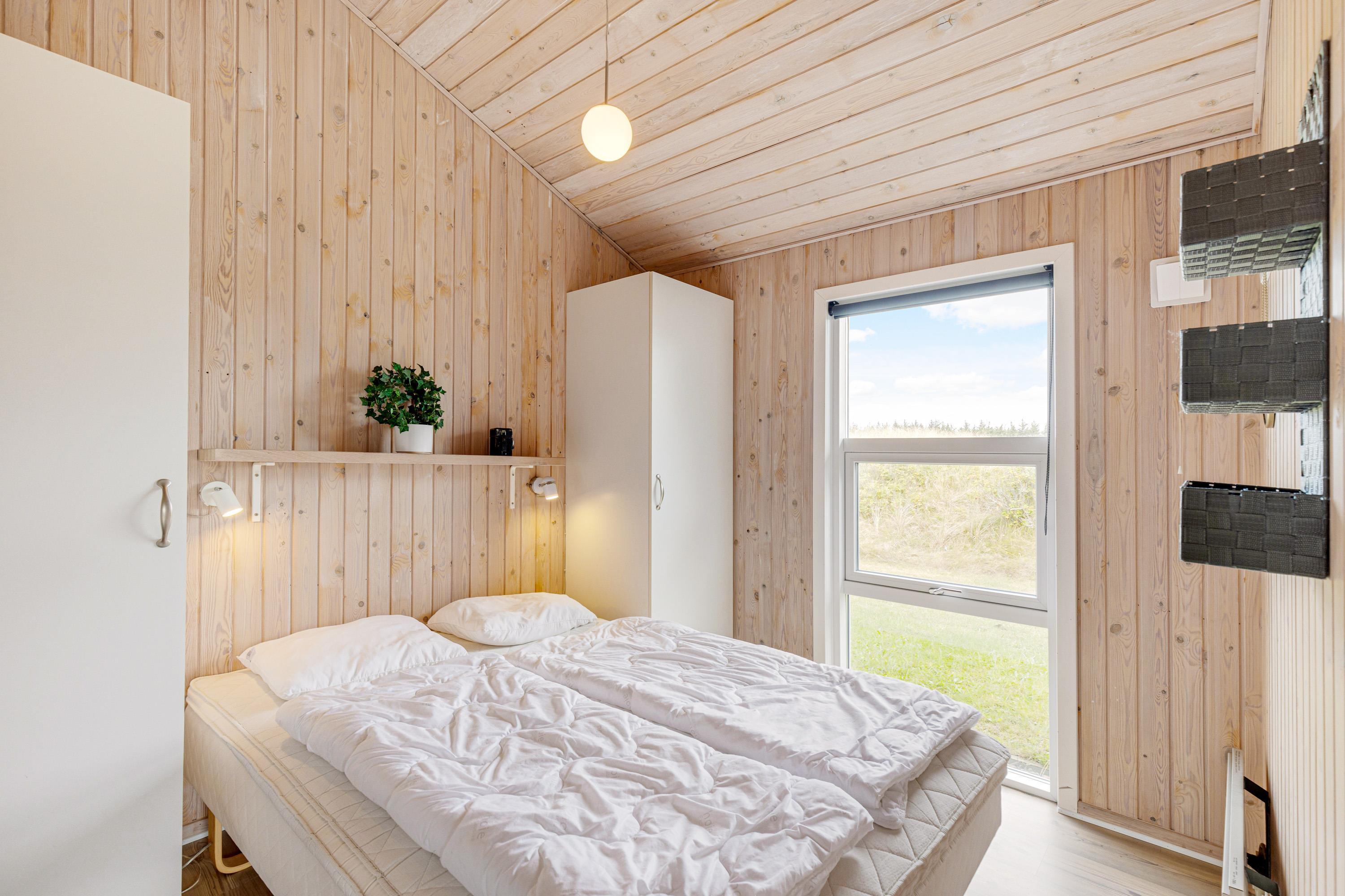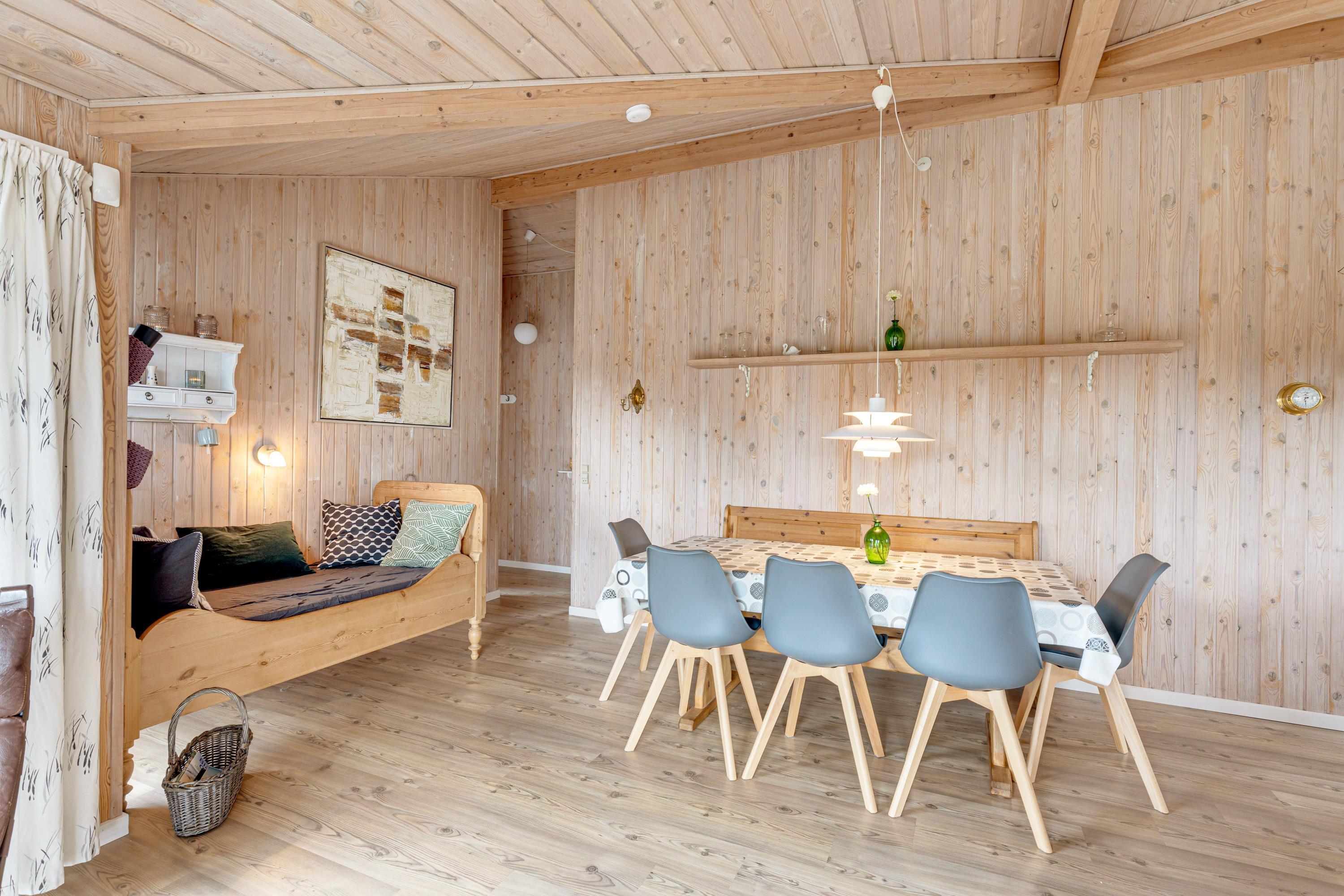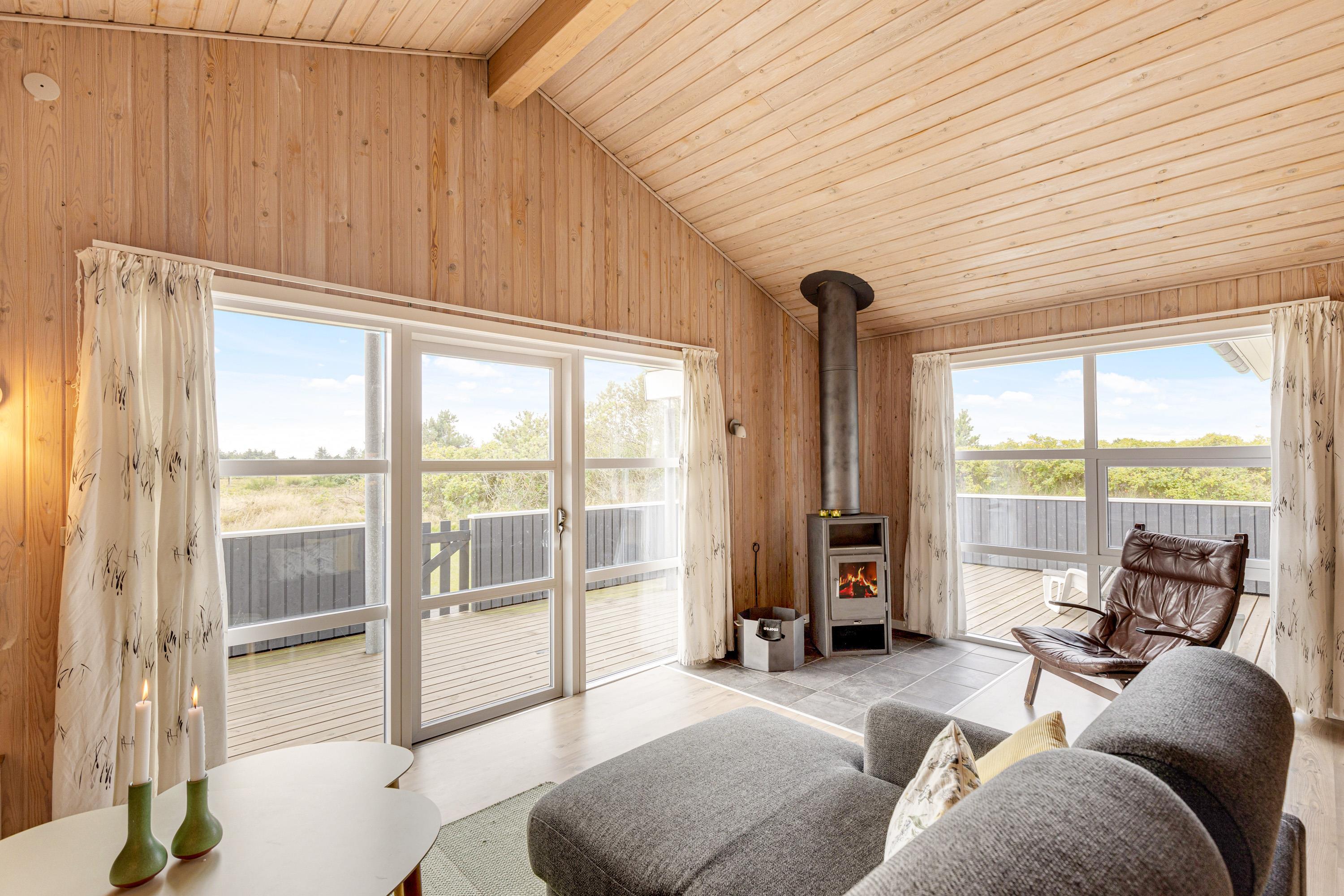 Allerede når I træder inden for i sommerhuset på Jafdalvej 79 i Vejers Strand, vil I blive mødt af den hyggelige og indbydende indretning. De lyse trævægge og -lofter samt det skønne lysindfald skaber tilsammen en dejlig ferieatmosfære for jer at holde ferie i.