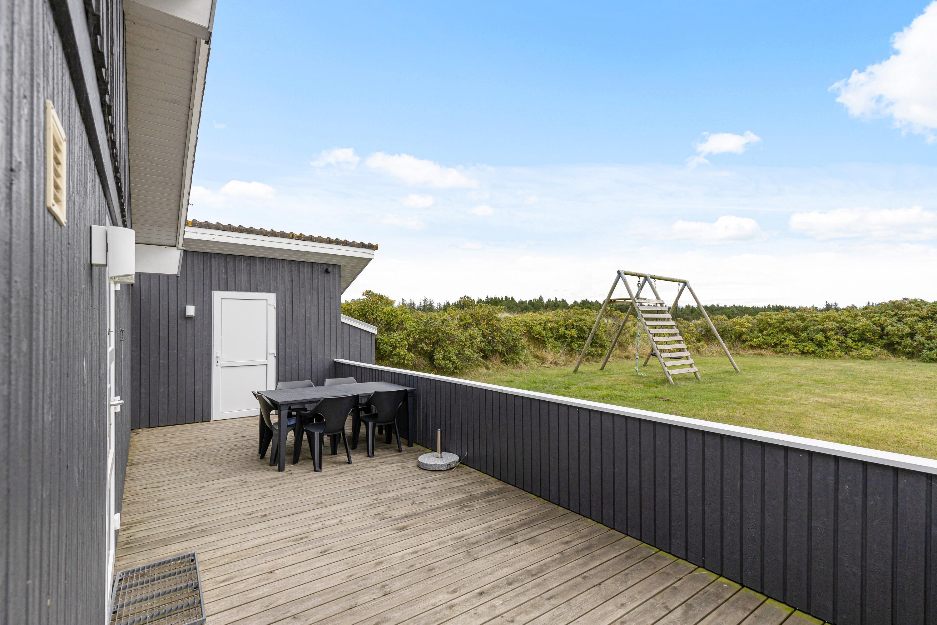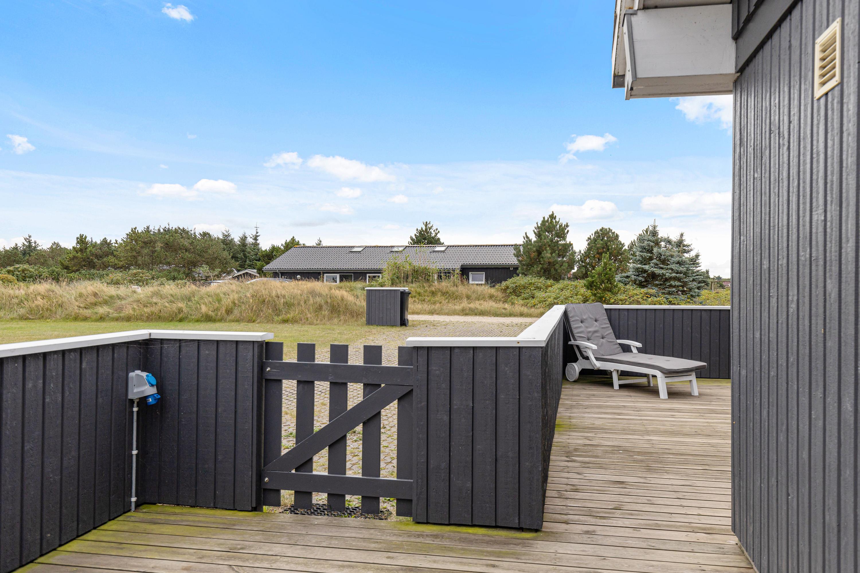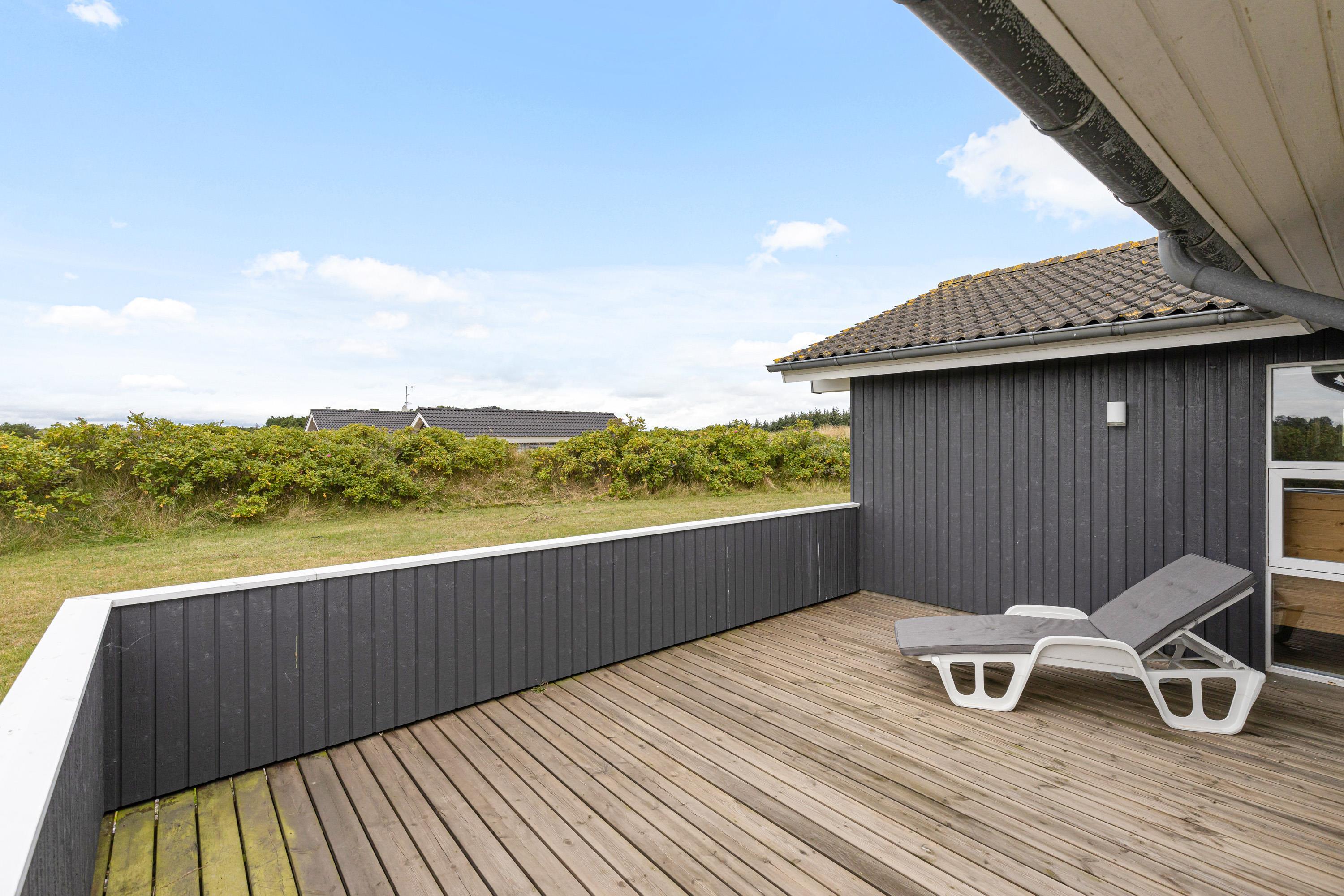 Omkring det meste af sommerhuset løber der en skøn terrasse, som I kan tilbringe de solrige feriedage på. Både havemøbler og liggestole står klar til jer, så I kan finde jer godt til rette på et godt spot i solen. Terrassen er desuden lukket, så her kan I have hunden med ud, uden den går på opdagelse på egen hånd.