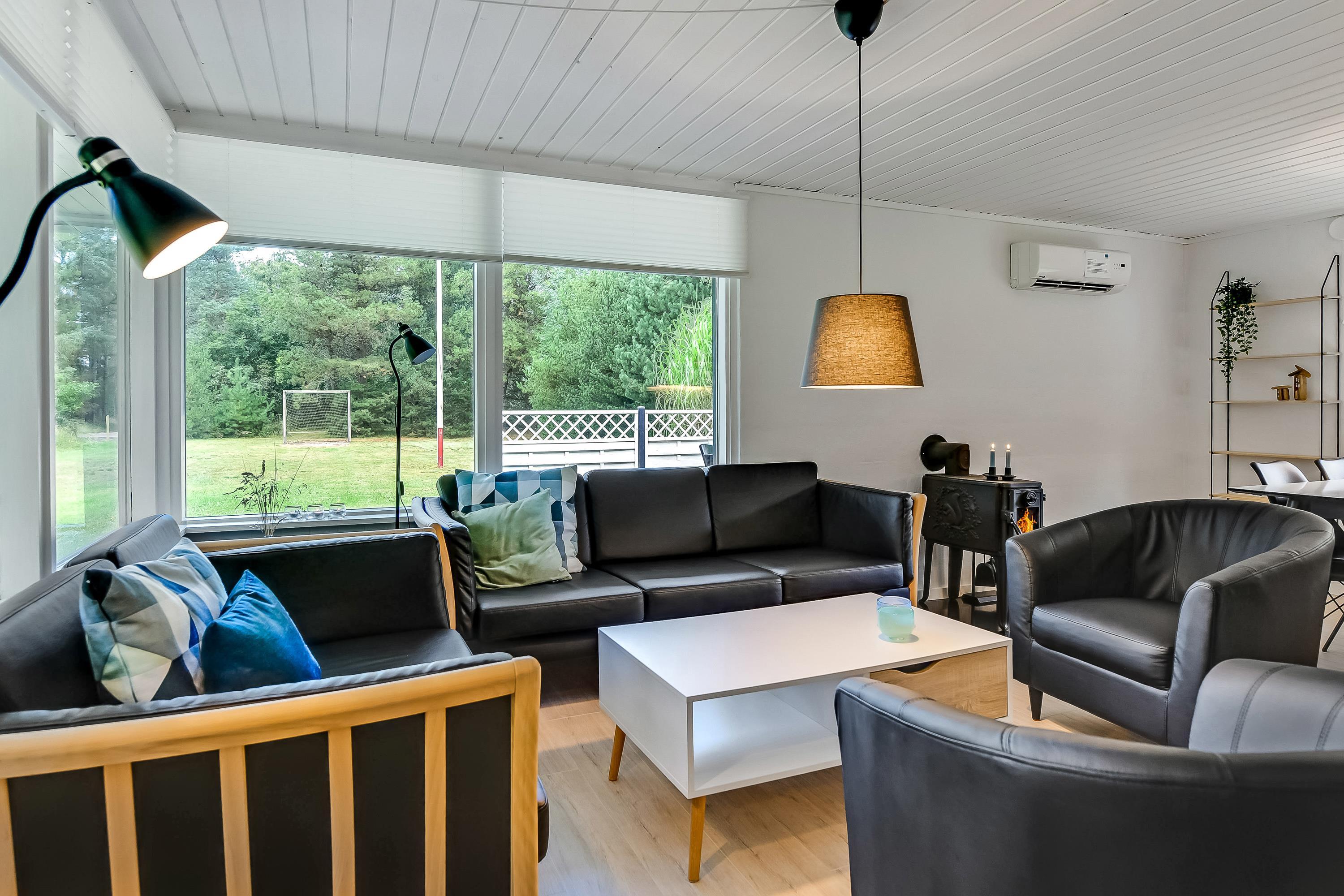 Indenfor venter jer en kombineret stue- og spiseafdeling med integreret køkken - smagfuldt indrettet i sort-hvide toner og med masser af komfort, der fuldender den afslappende sommerhusferie. På den moderne lædersofa er der lagt op til hyggelige filmaftener og læsning foran den knitrende brændeovn.