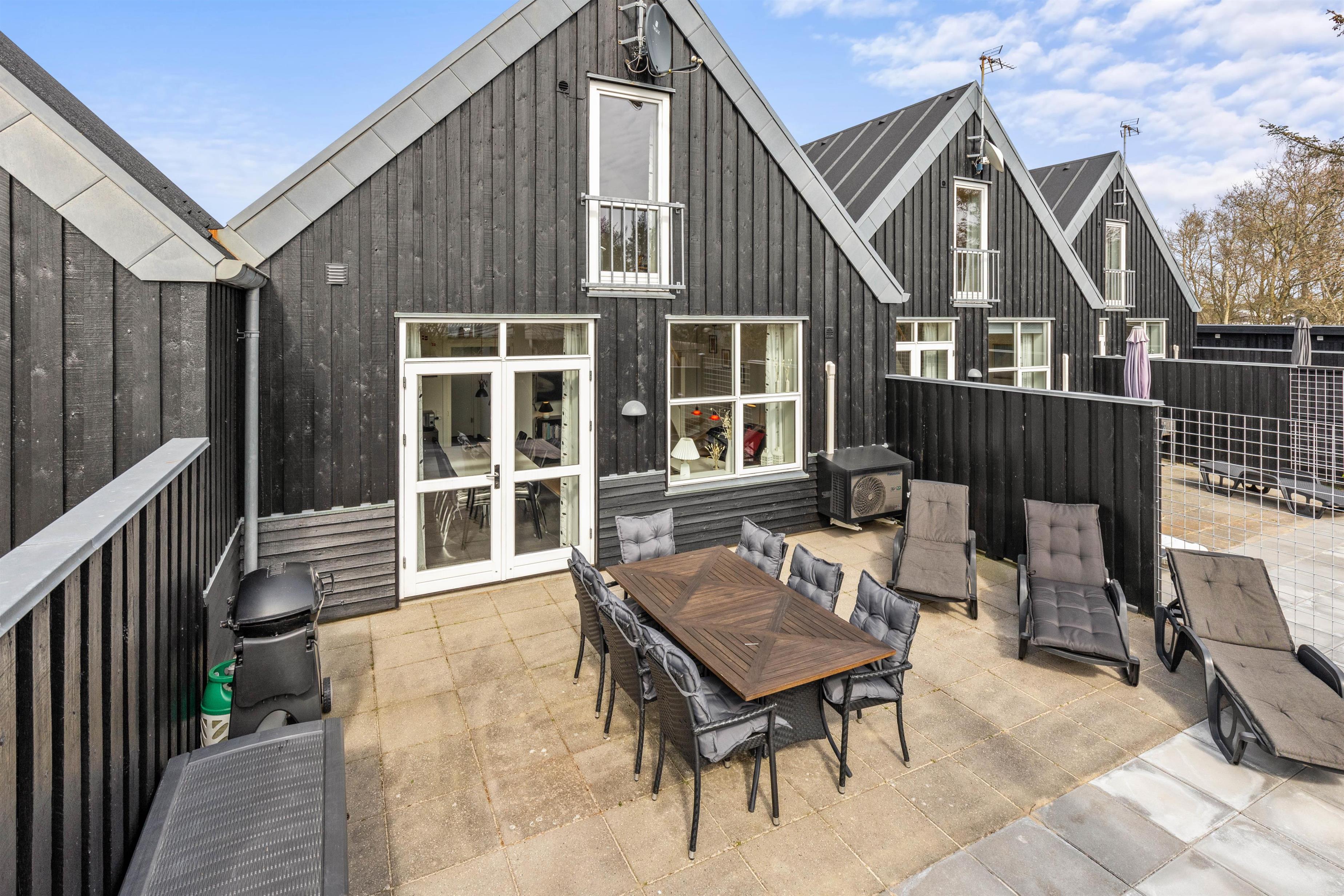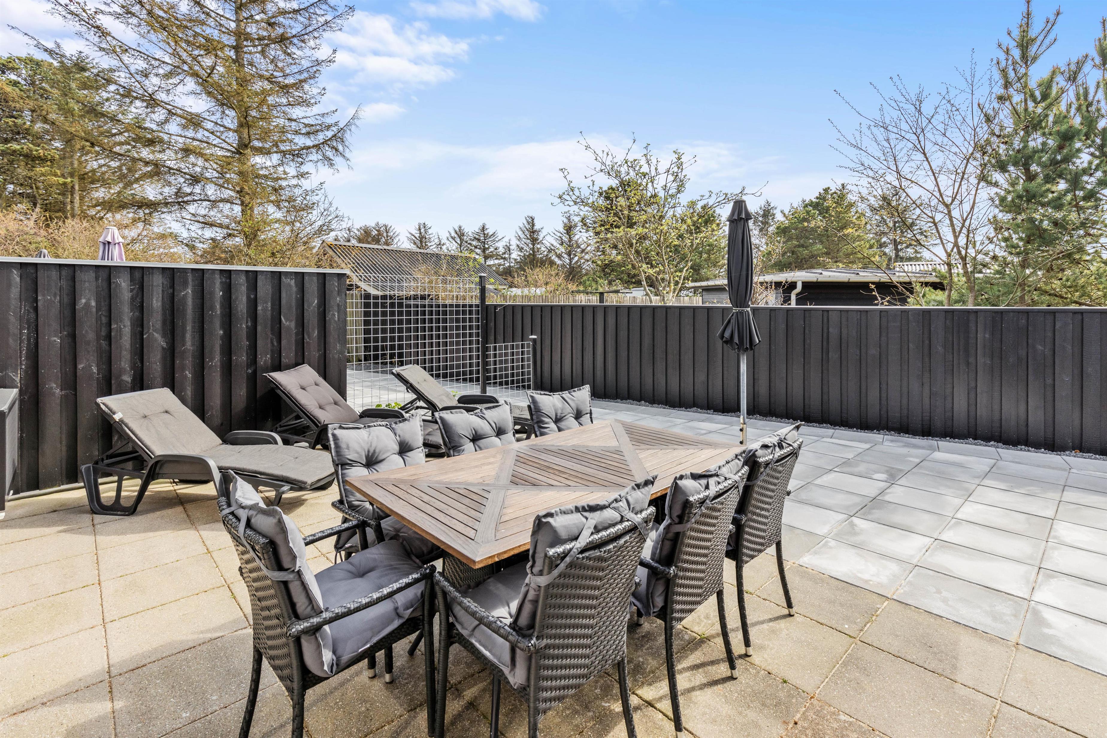 Med til huset hører en dejlig afskærmet terrasse, som I har adgang til gennem stuen. Havemøbler såvel som liggestole og grill står til rådighed, så I kan udnytte de dejlige solskinsdage fuldt ud.