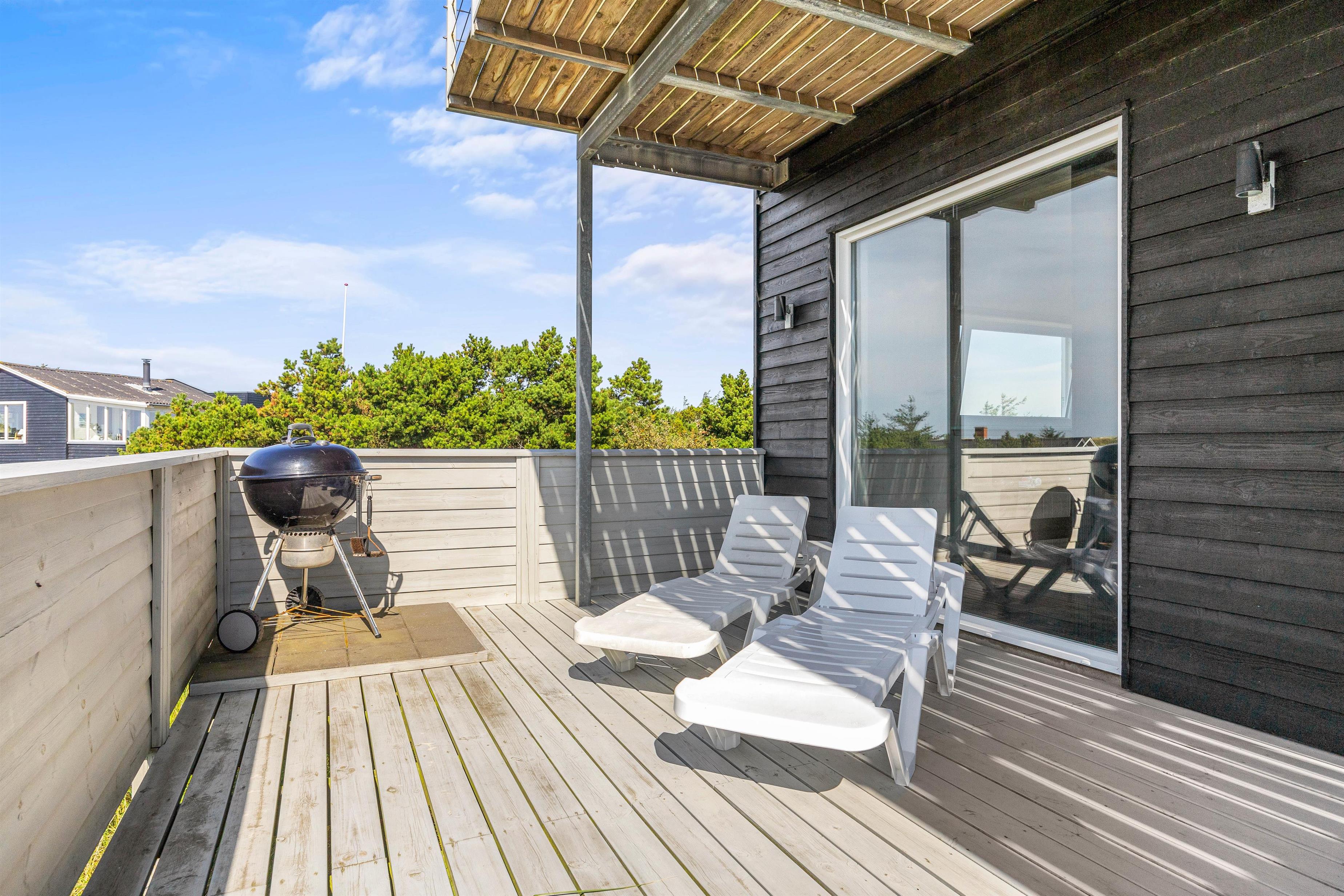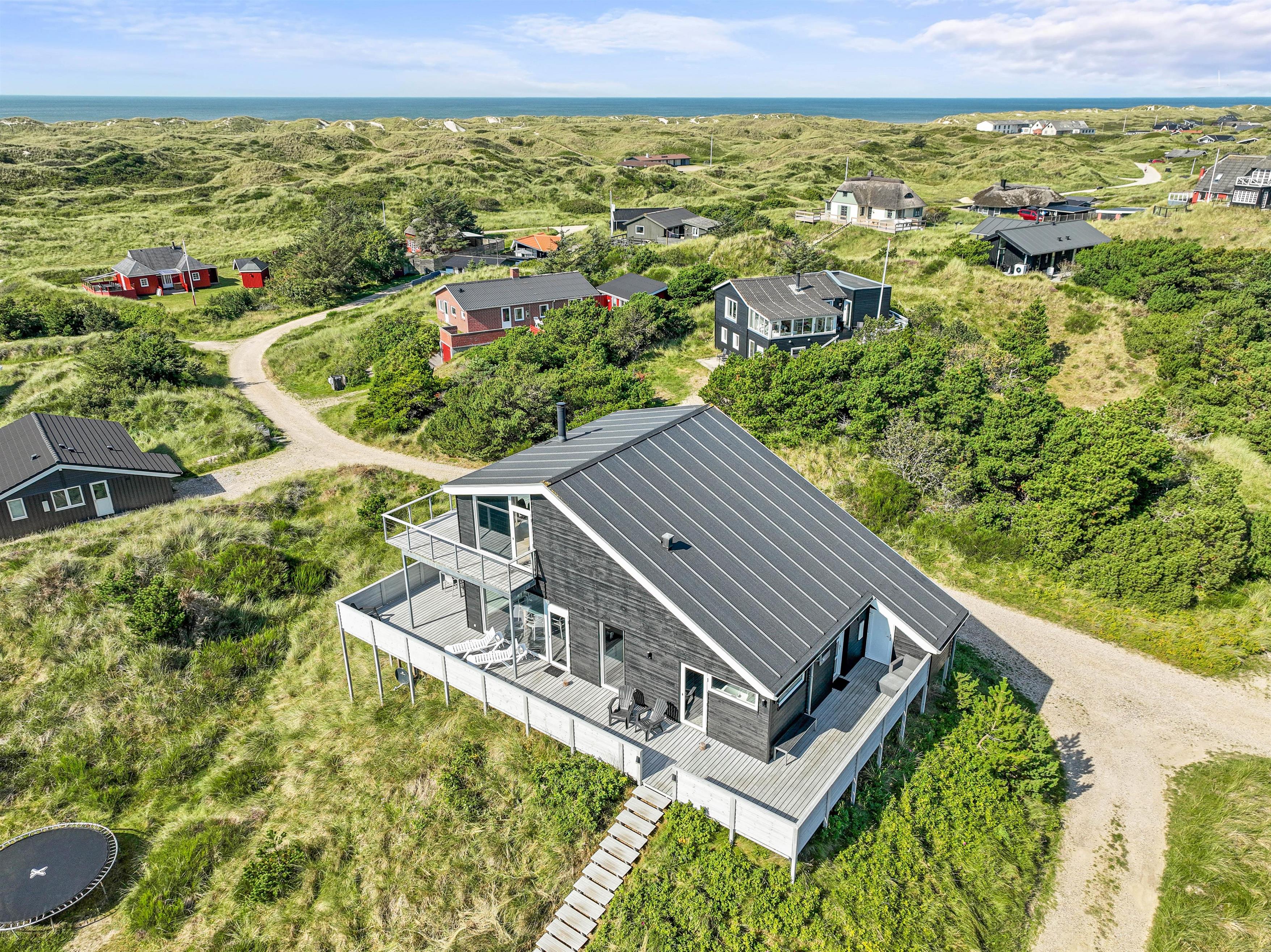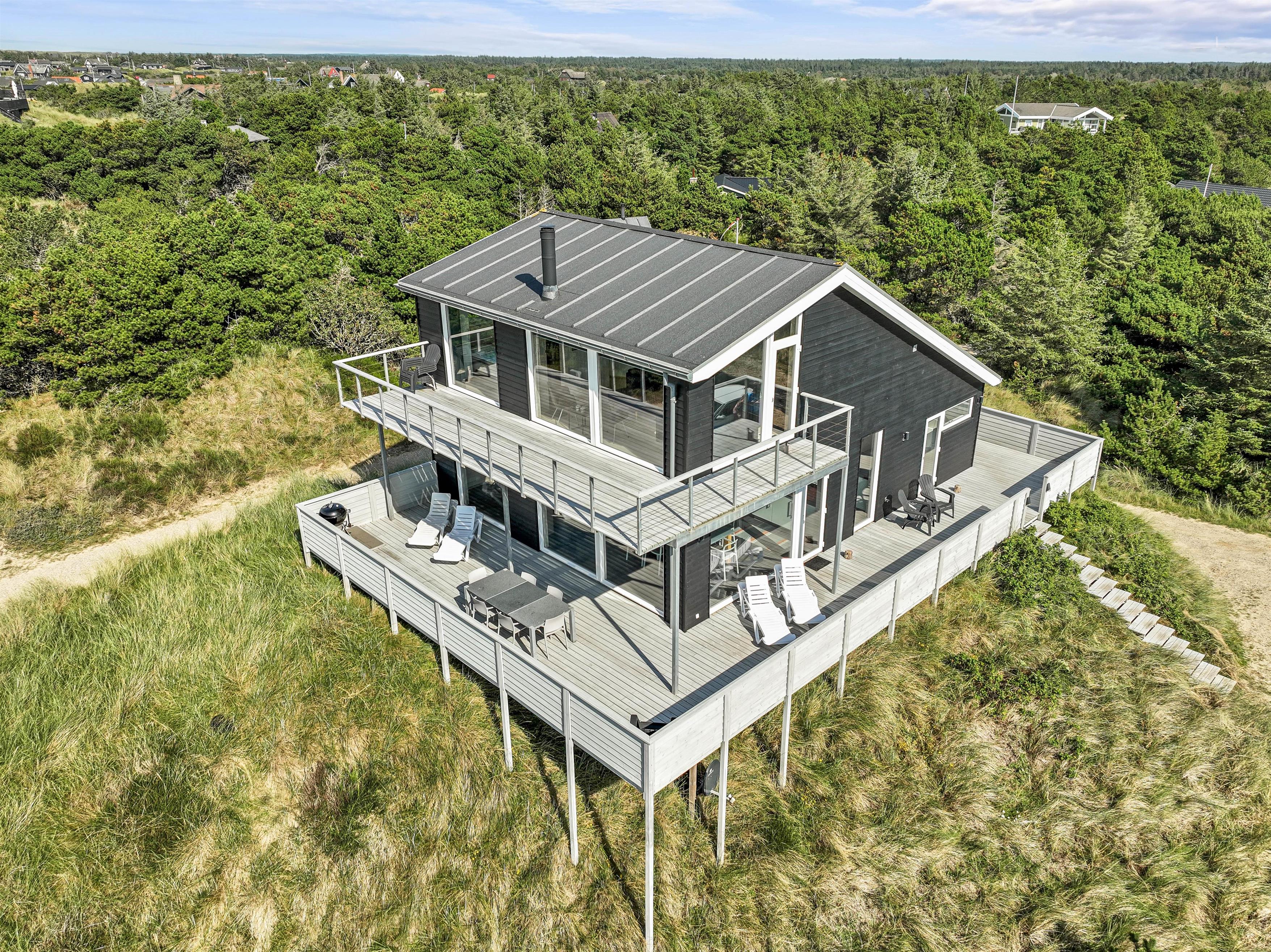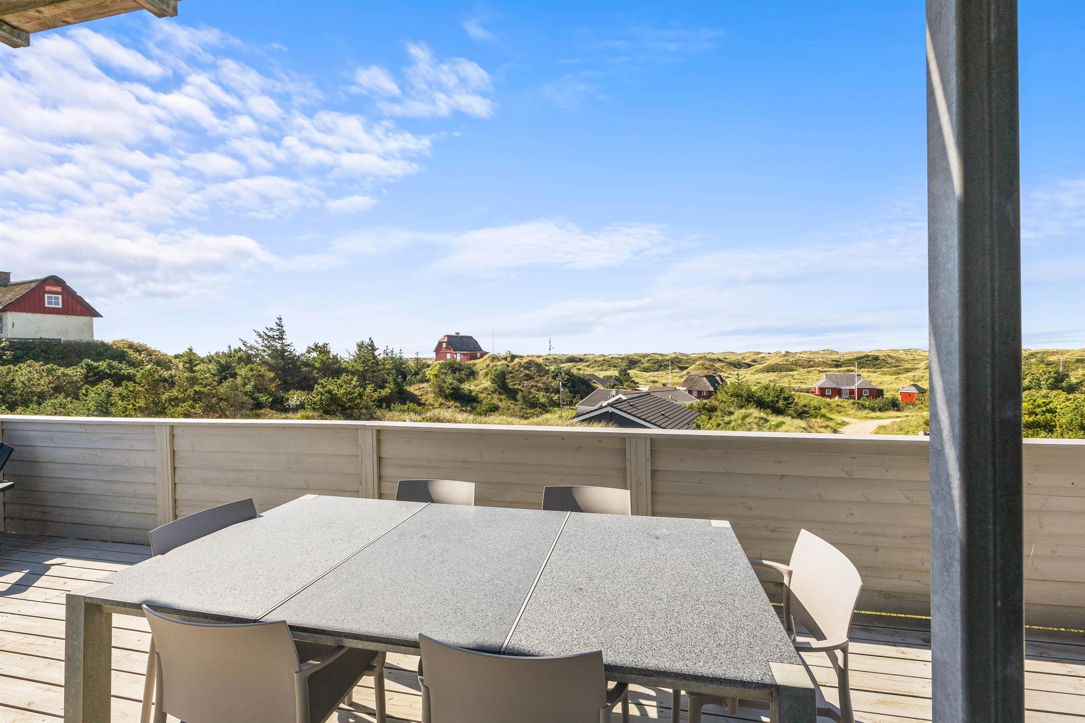 På begge etager er der udgang til store terrasser, med dejlige havemøbler og flere siddegrupper, så I altid kan finde enten skygge eller sol. Her er alle muligheder for at sidde og koble af, mens I nyder freden og panoramaudsigten over klitlandskabet. Grillen står klar, hvis aftensmaden skal tilberedes udenfor, mens I nyder et godt glas vin.